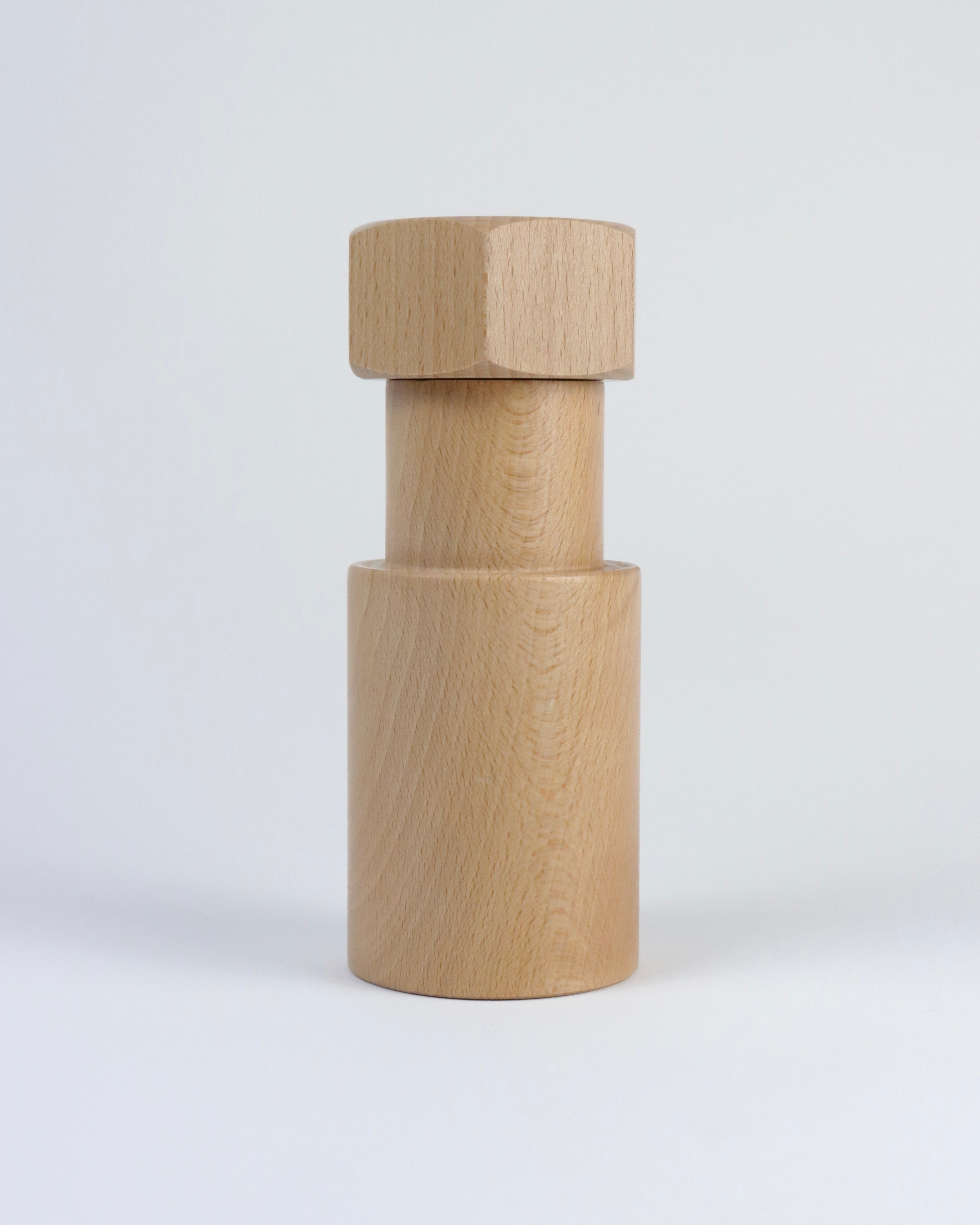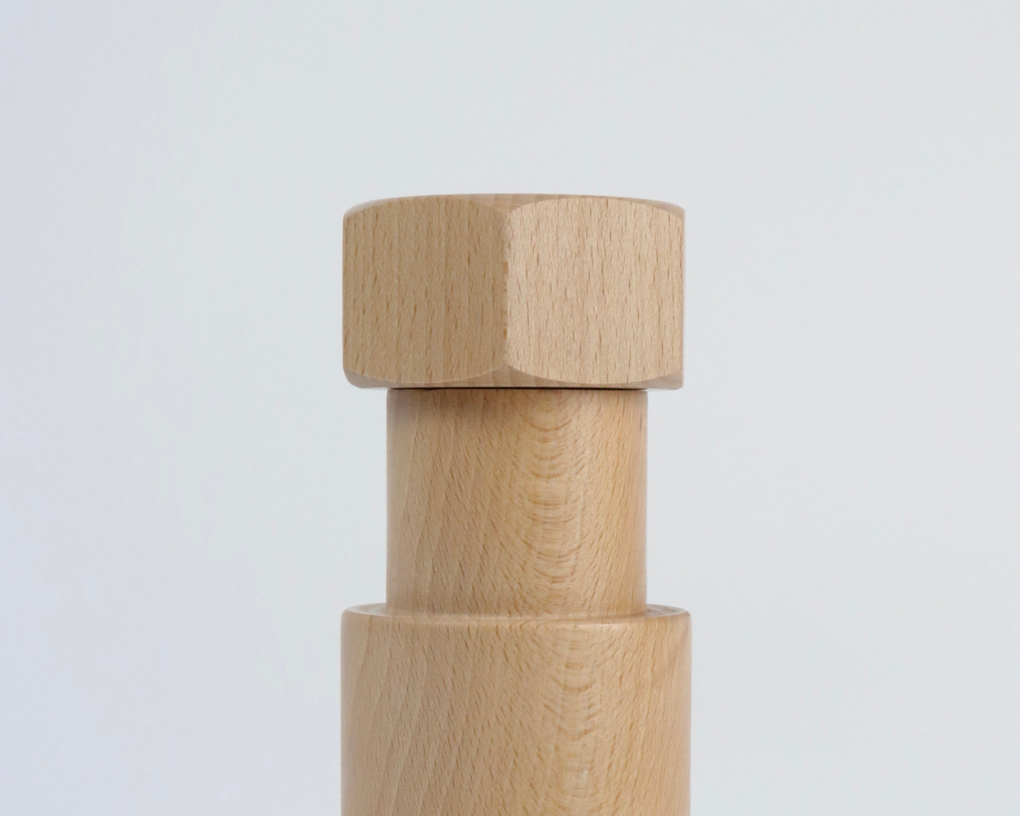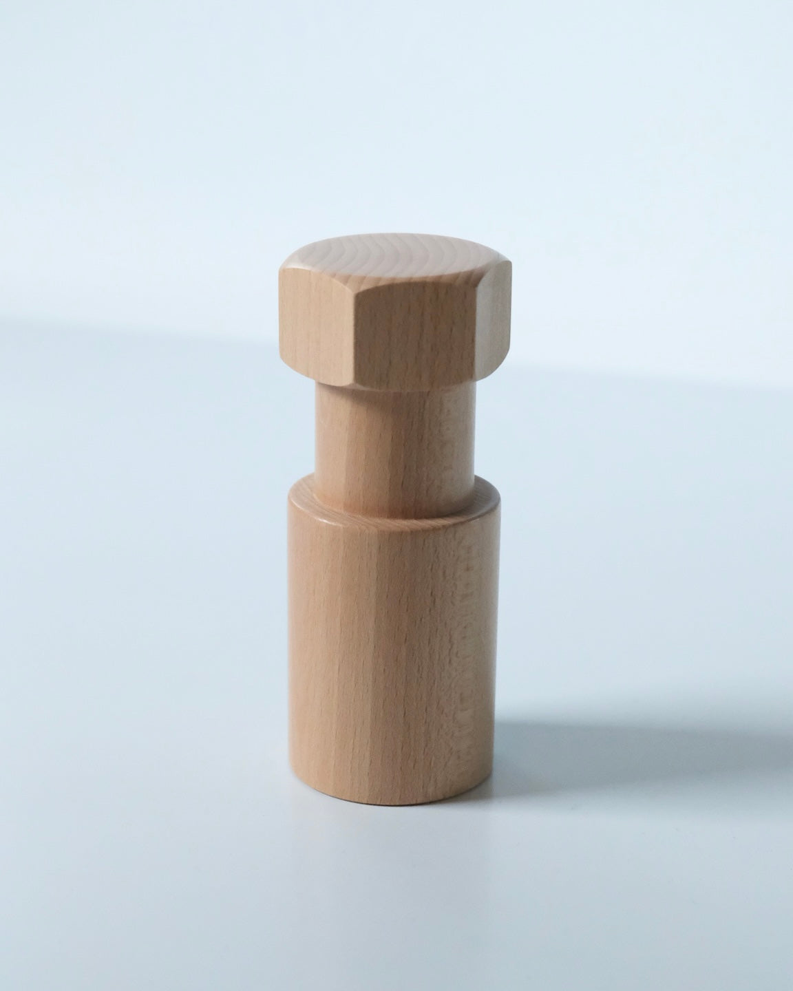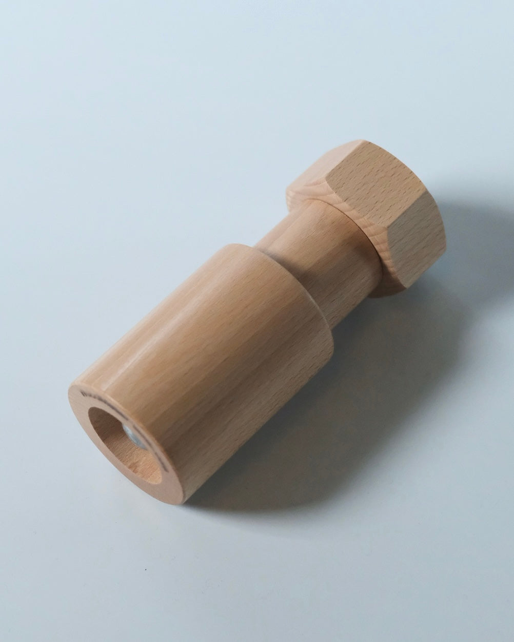 ボルトの形をしたグラインダー。デンマークを拠点にする世界トップクラスのグラインドメーカーCrushgrindのグラインダーが内蔵されており、底にあるグレーのノブを回すことで、粗さも調整が可能です。持続可能なヨーロッパのブナ材を使用しております。