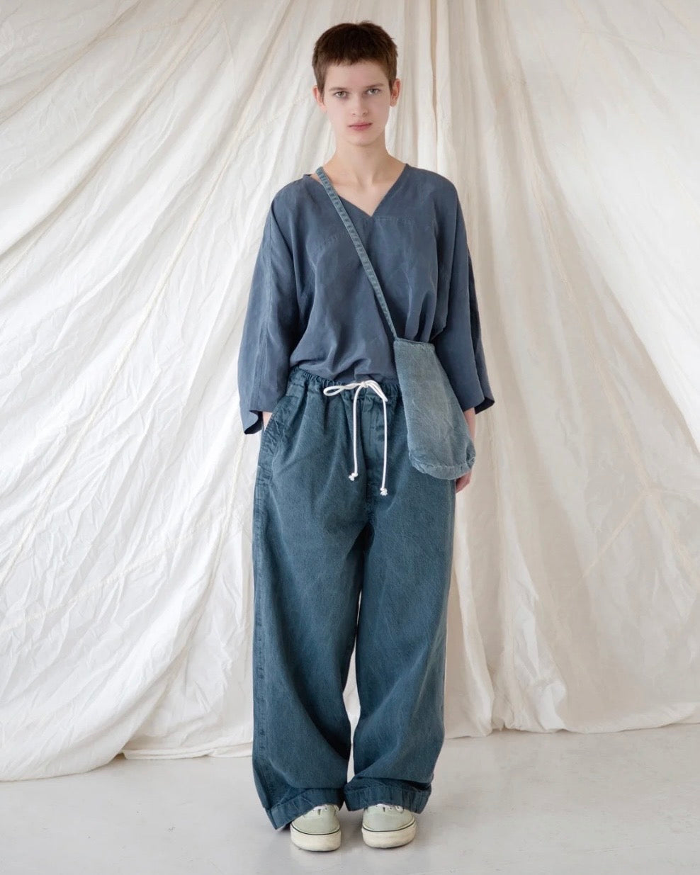 日常使いを想定した実用的なBABA BAG。アジャスターやファスナーといった留め具は使用せず、テキスタイルを二重構造にすることで、ミニマムな状態を保ったまま、内部の荷物をしっかりとホールドされるよう設計されています。長く伸びたストラップを使用することで、適した長さに結んで使用することも可能です。