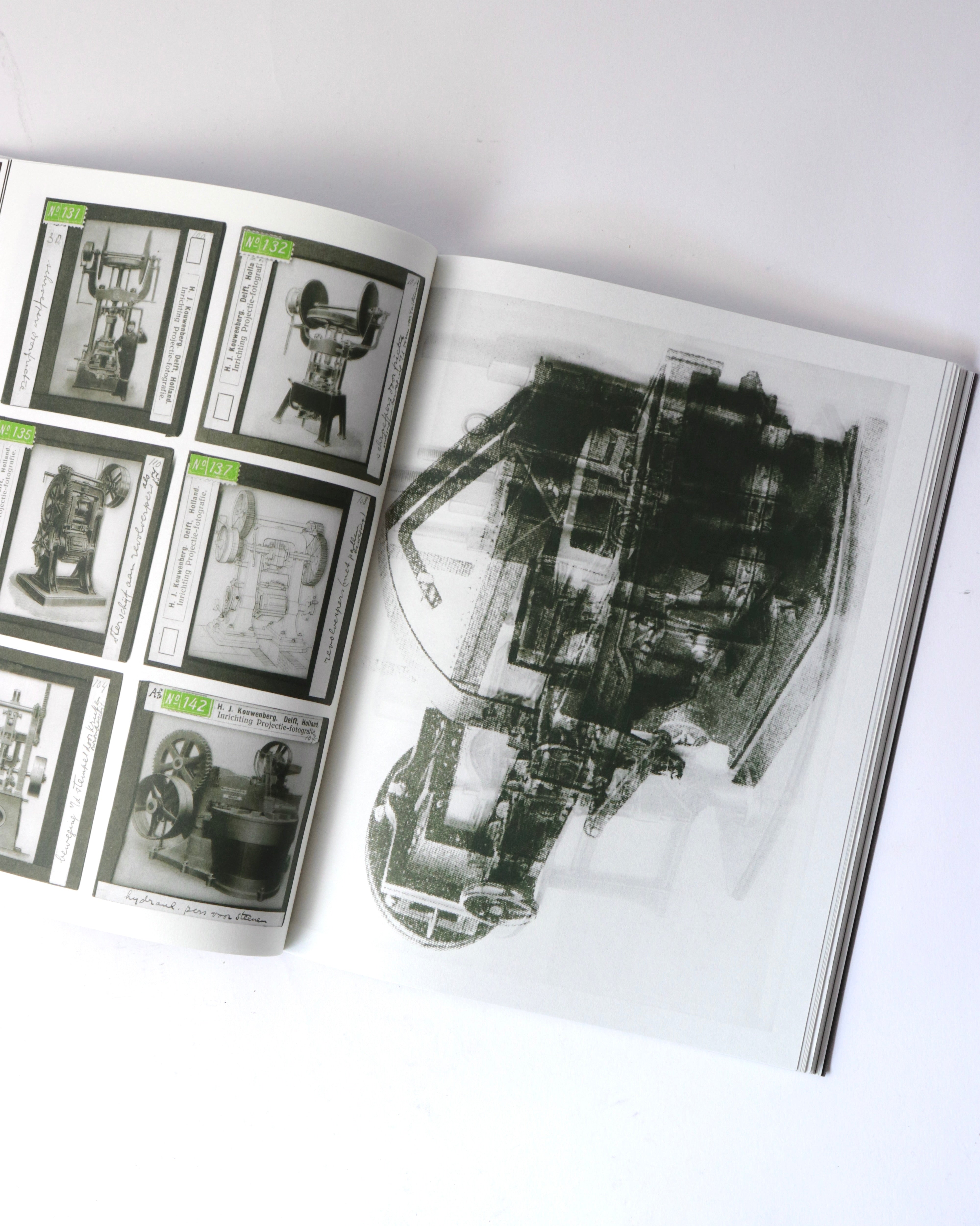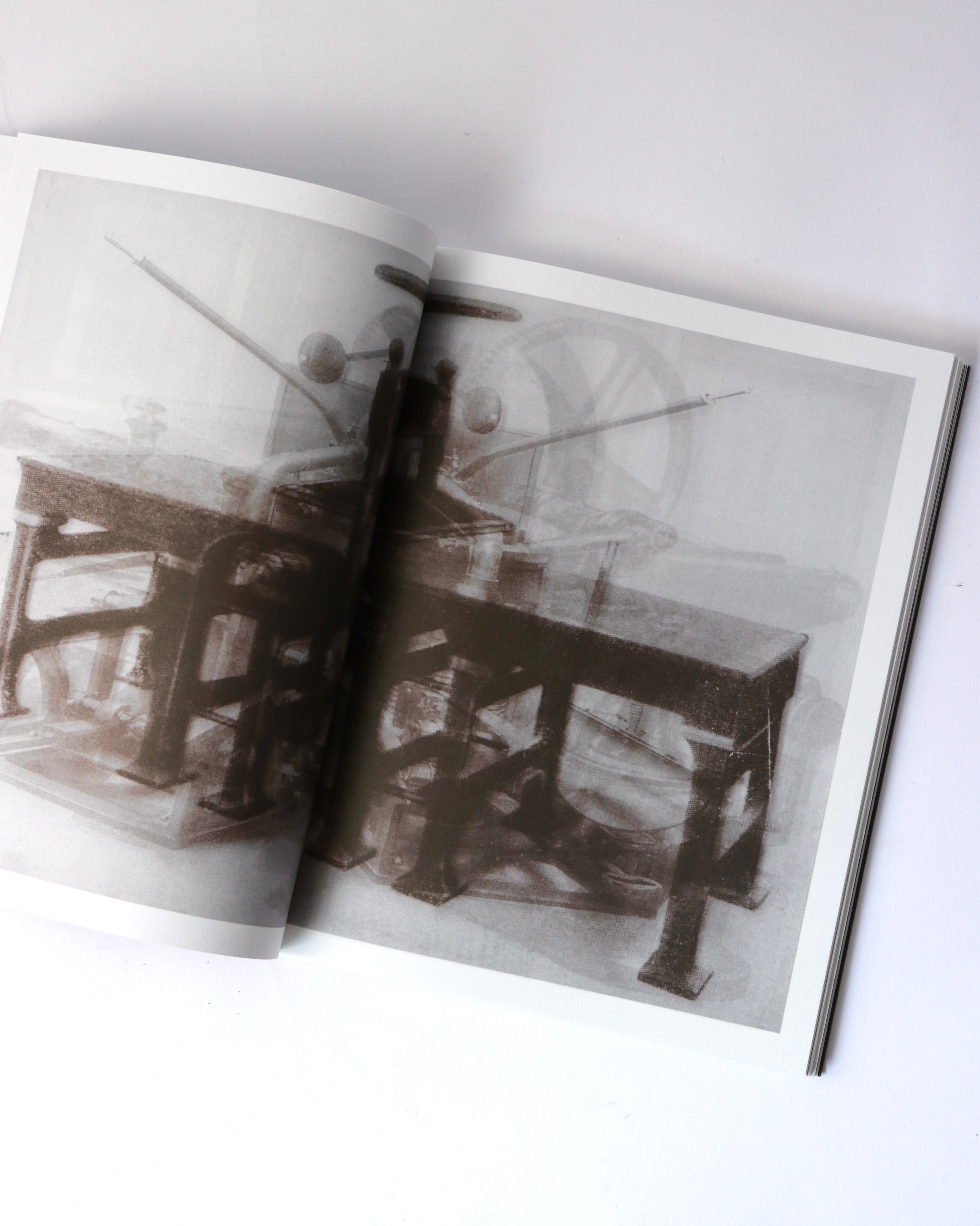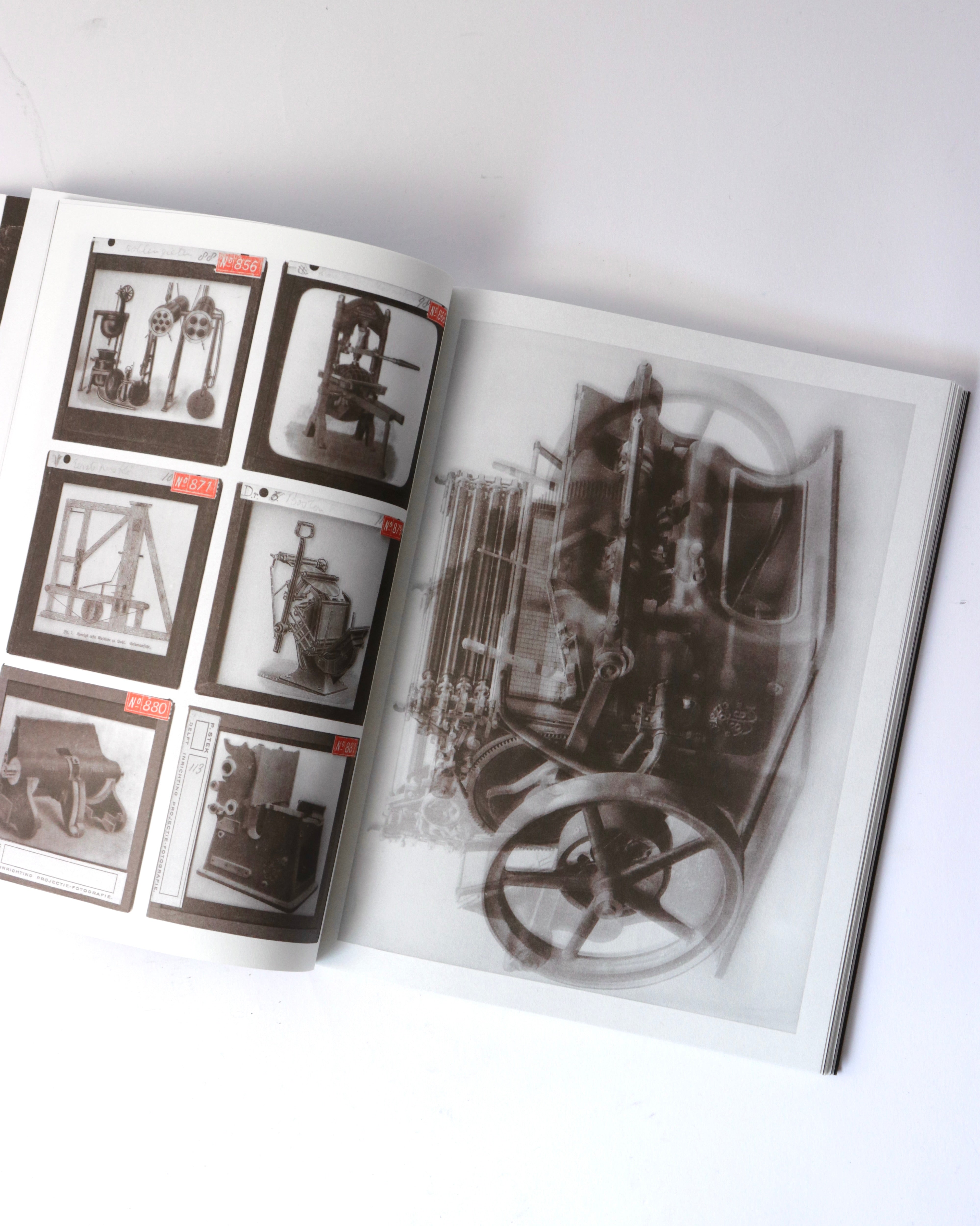 アムステルダムを拠点に活動するアーティスト、バティア・スーター(Batia Suter)の作品集。既存のイメージを再編集し新たな文脈を生み出す作品で知られるスーター。今作では、オランダのデルフト工科大学に眠っていた、1900年から1960年にかけて機械技術の講義で使われたガラススライドのアーカイブを素材としています。機械や工業製品を記録したこれらの技術的なイメージを、スーターは複数の画像を重ね合わせるモンタージュで再構成しています。人間と機械の絡み合いや、テクノロジーがいかに私たちの知覚や日常を形作ってきたかを、詩的に考察します。歴史的な資料が新たな連想を喚起するアーティストブックへと変容した一冊です。デザインは、出版元であるRoma Publicationsのロジャー・ヴィレムス(Roger Willems)とスーターが共同で手がけています。