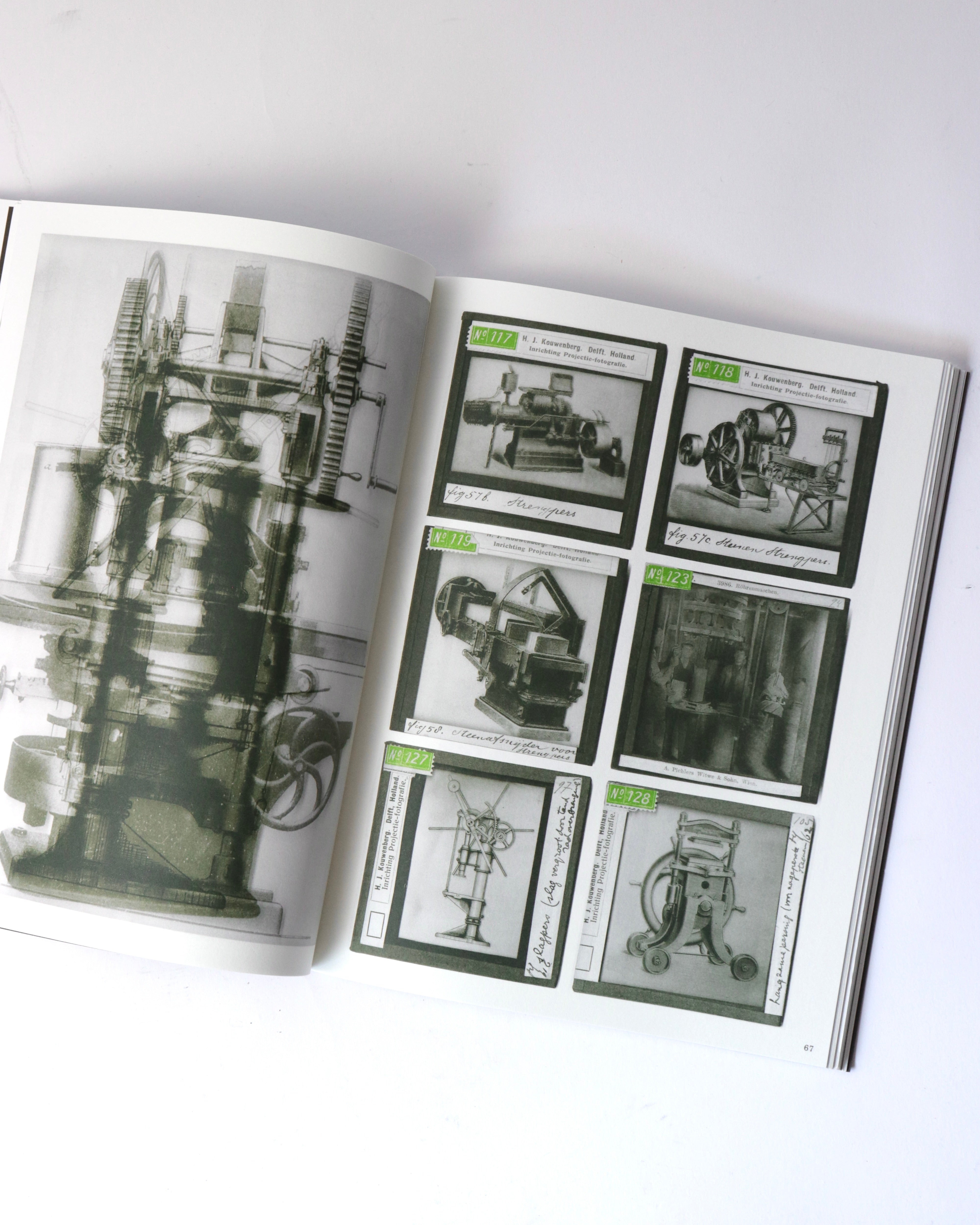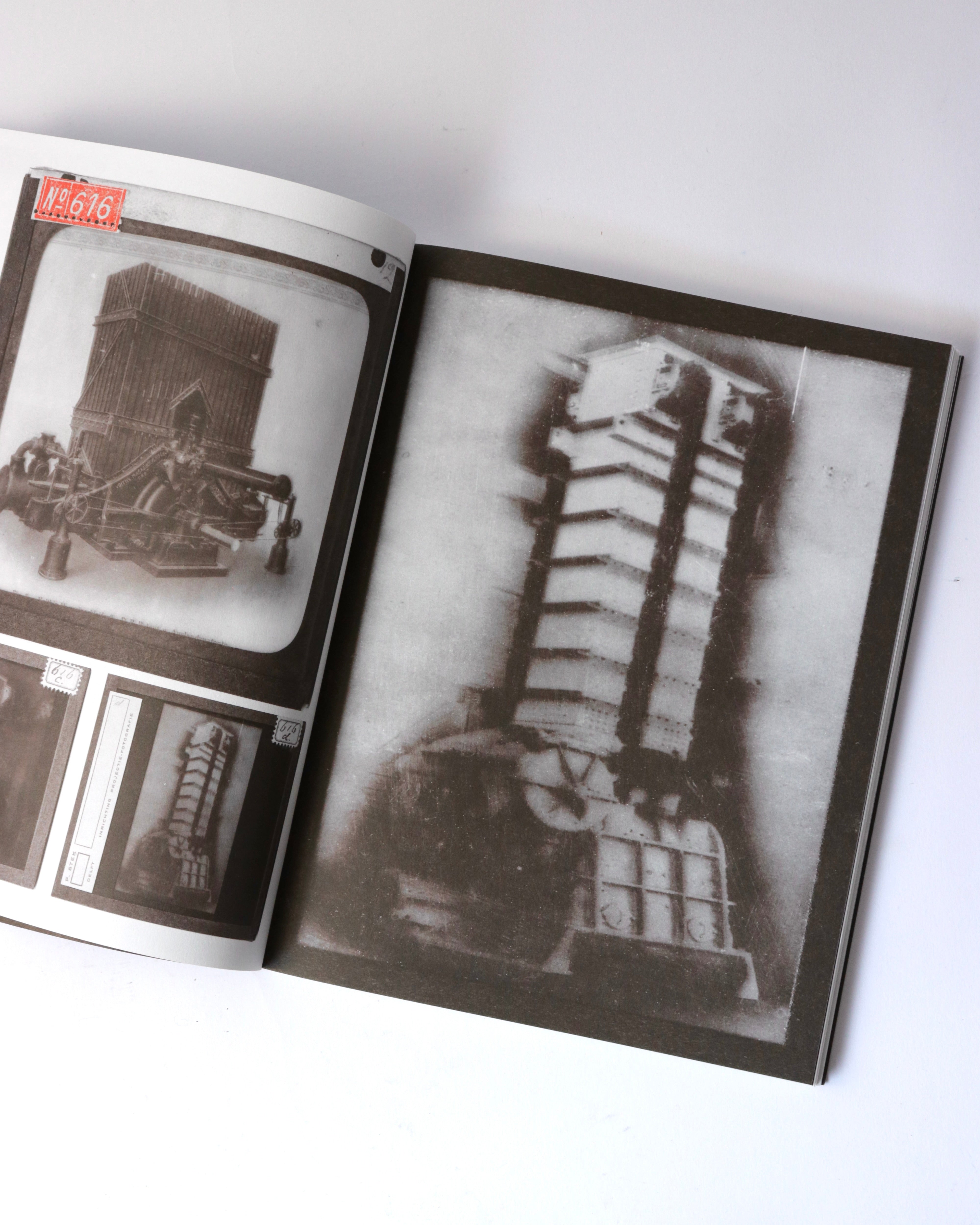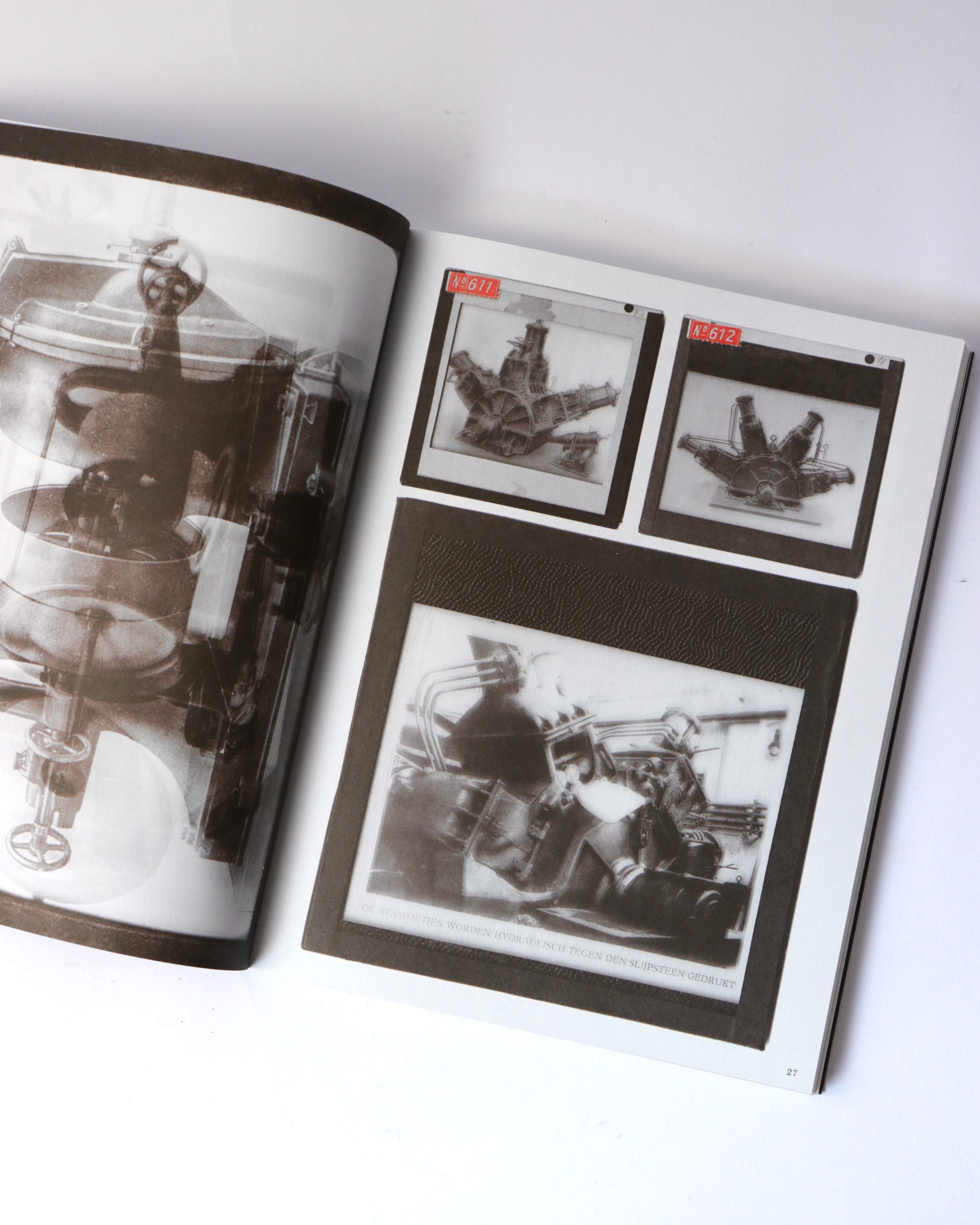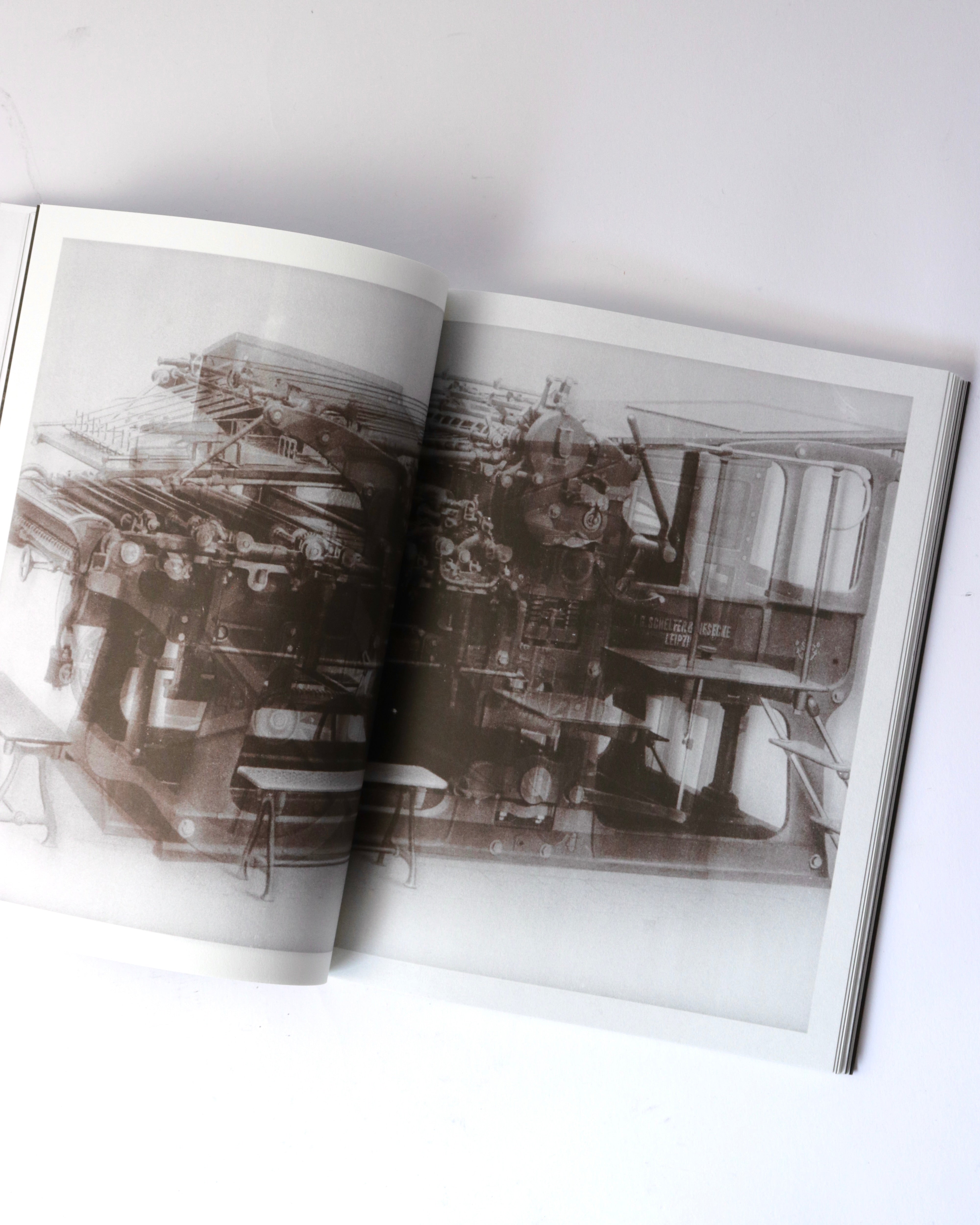 アムステルダムを拠点に活動するアーティスト、バティア・スーター(Batia Suter)の作品集。既存のイメージを再編集し新たな文脈を生み出す作品で知られるスーター。今作では、オランダのデルフト工科大学に眠っていた、1900年から1960年にかけて機械技術の講義で使われたガラススライドのアーカイブを素材としています。機械や工業製品を記録したこれらの技術的なイメージを、スーターは複数の画像を重ね合わせるモンタージュで再構成しています。人間と機械の絡み合いや、テクノロジーがいかに私たちの知覚や日常を形作ってきたかを、詩的に考察します。歴史的な資料が新たな連想を喚起するアーティストブックへと変容した一冊です。デザインは、出版元であるRoma Publicationsのロジャー・ヴィレムス(Roger Willems)とスーターが共同で手がけています。