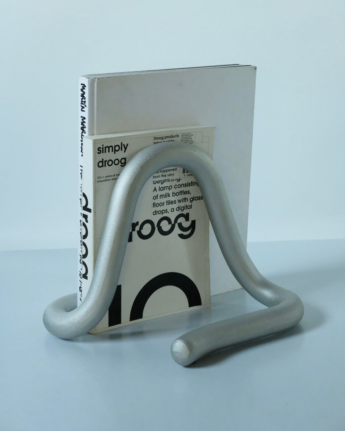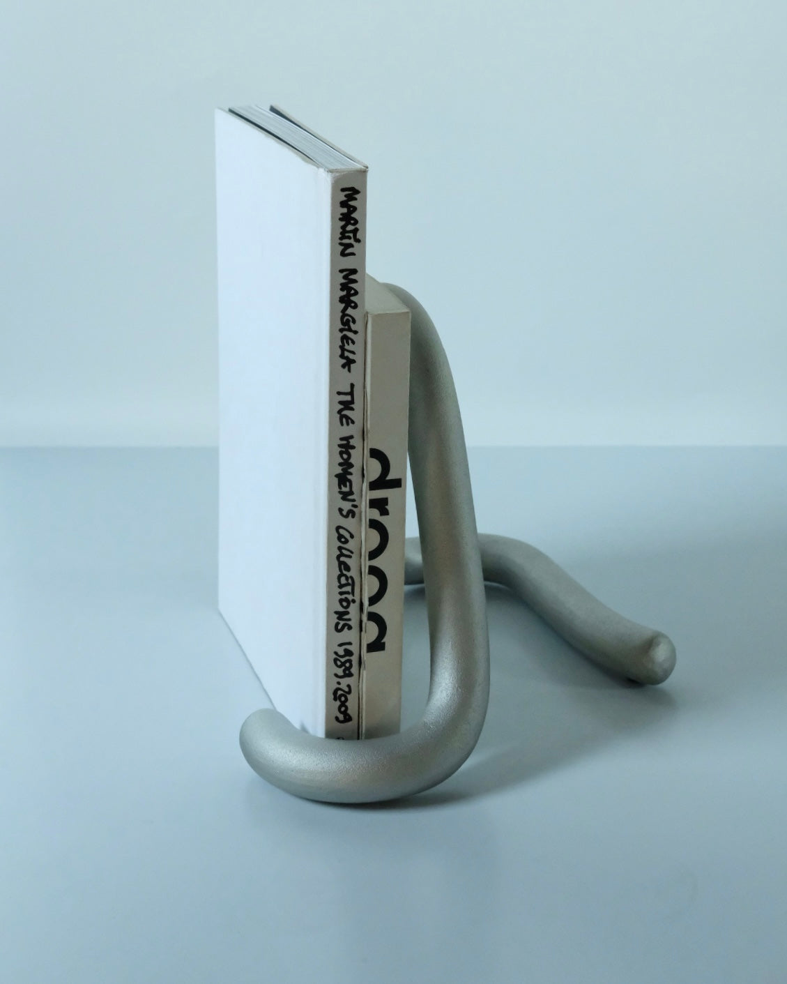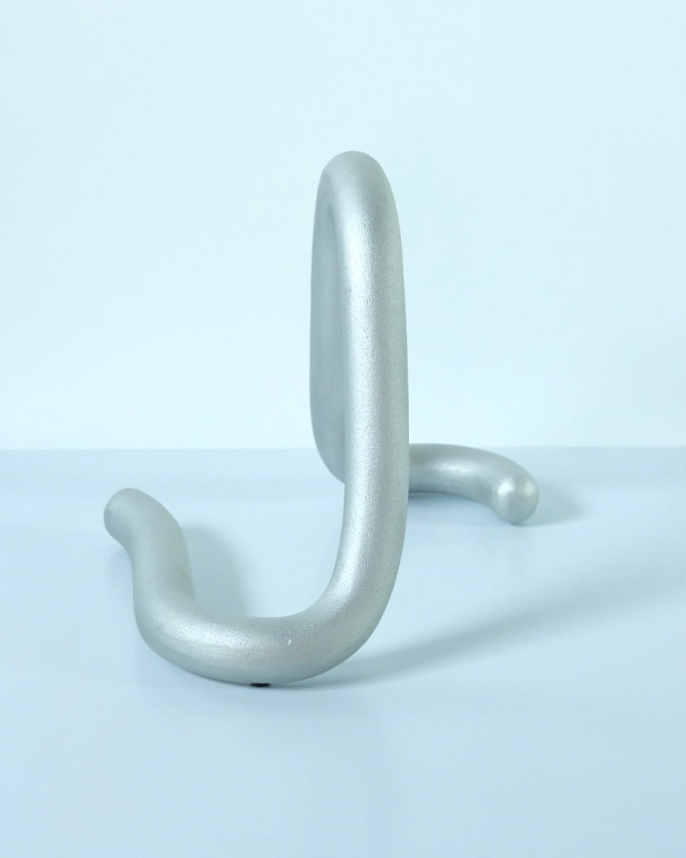 Hwachan LeeとYoomin MaengによるデザインデュオKUO DUOが、流動的でオーガニックなラインを想像して製作したBOOK WORM。従来の支えるためのブックスタンドとは異なり、直線で硬い本と棚の間に流れるダイナミックな感覚を表現しています。本がBOOK WORMと共に固定されることにより、本を含めた全体がある種のオブジェとして、自由な作品へと生まれ変わります。もともと粘土樹脂で手作りされたBOOK WORMを、WEKINOとの協働により、アルミニウムサンドキャスティングを使用し生産されました。サンドキャストにより特徴的なテクスチャーをもった「本の虫」です。