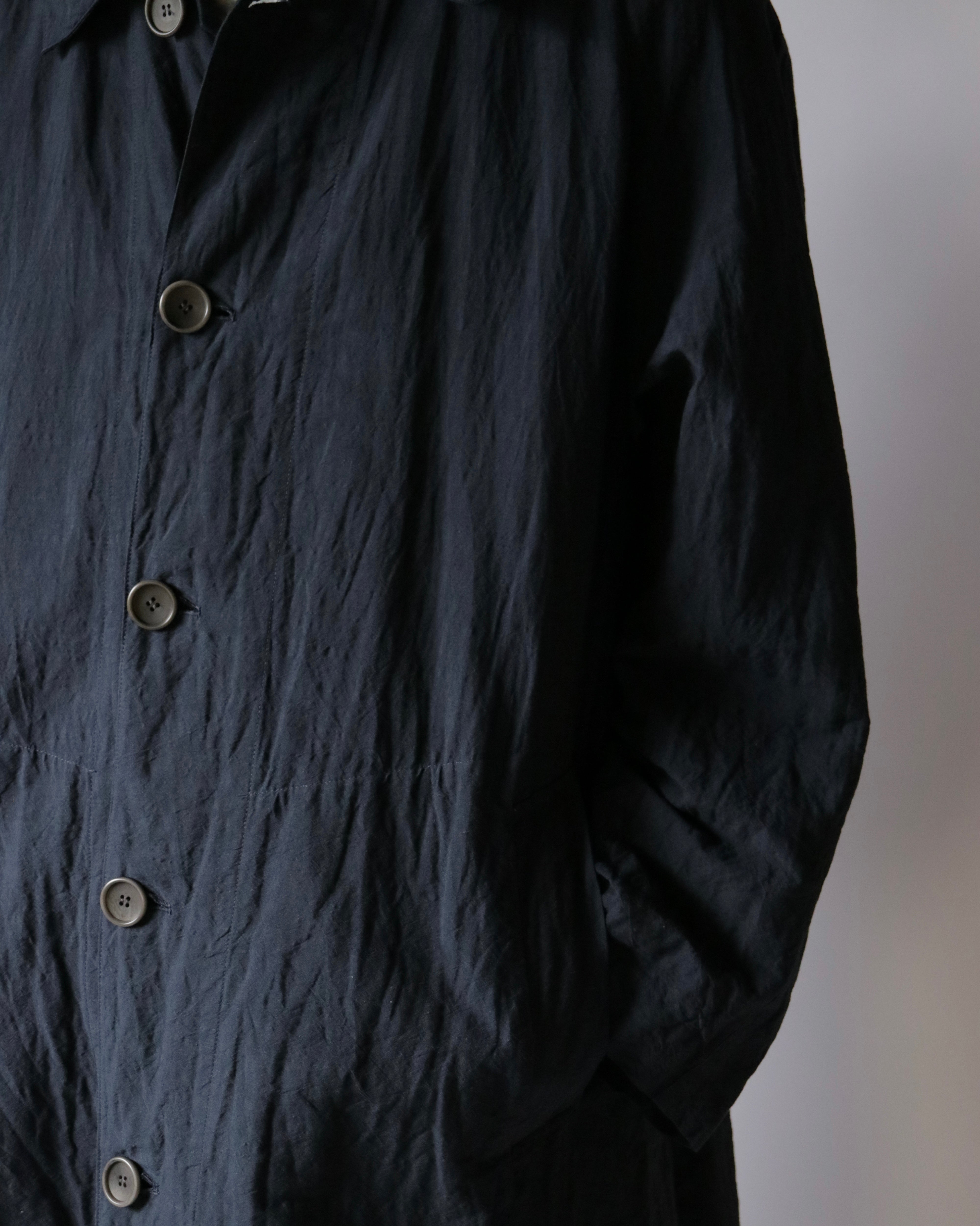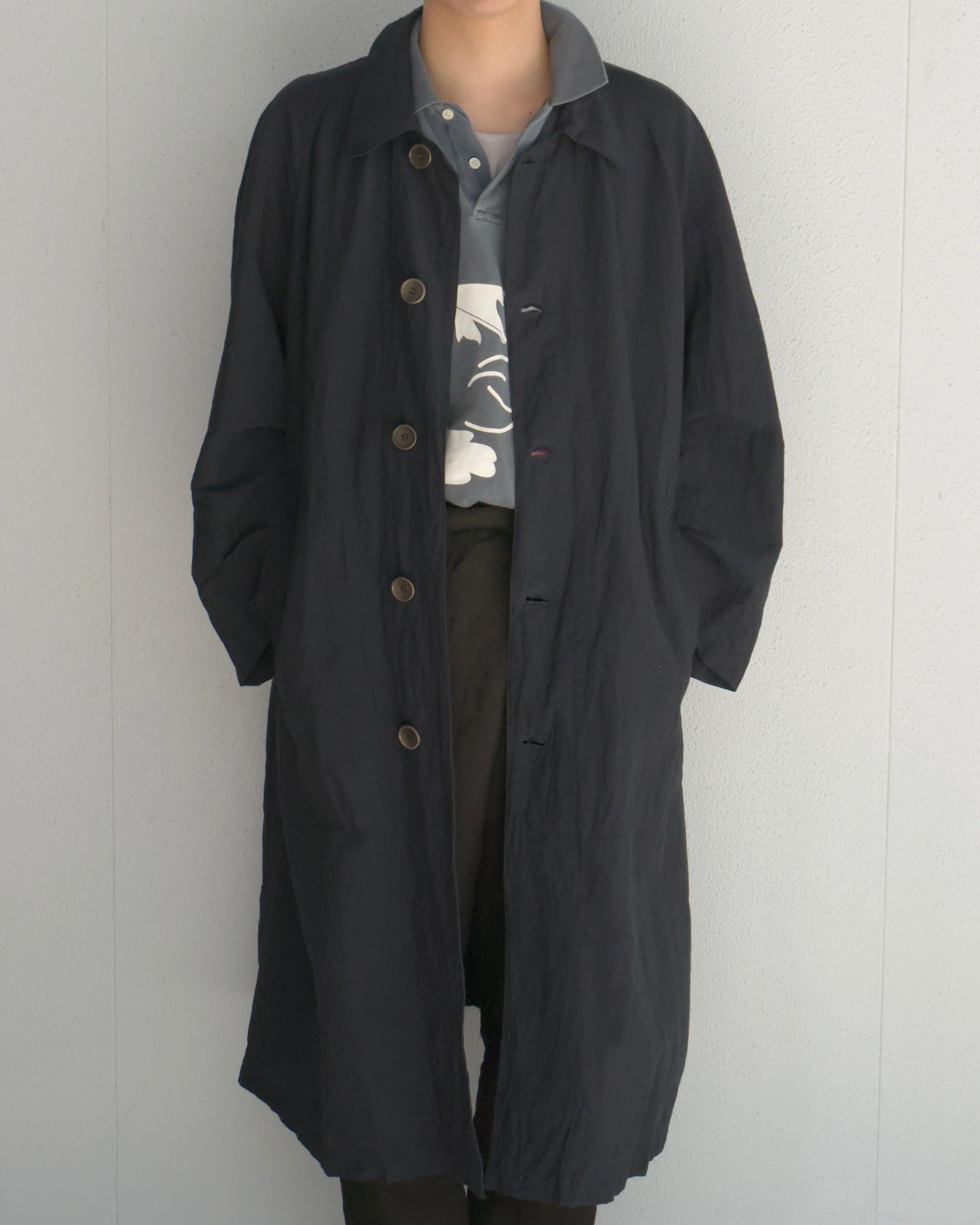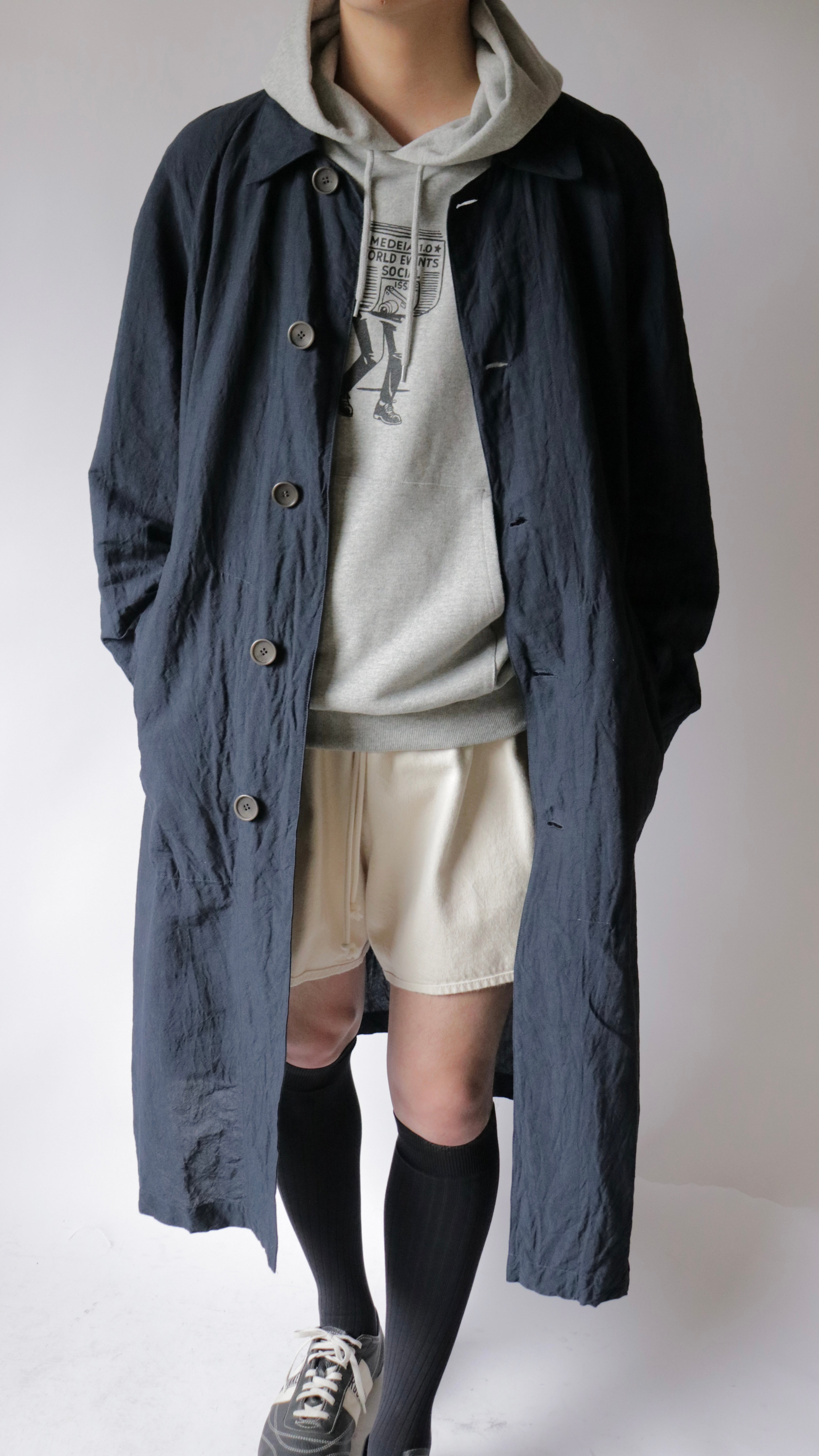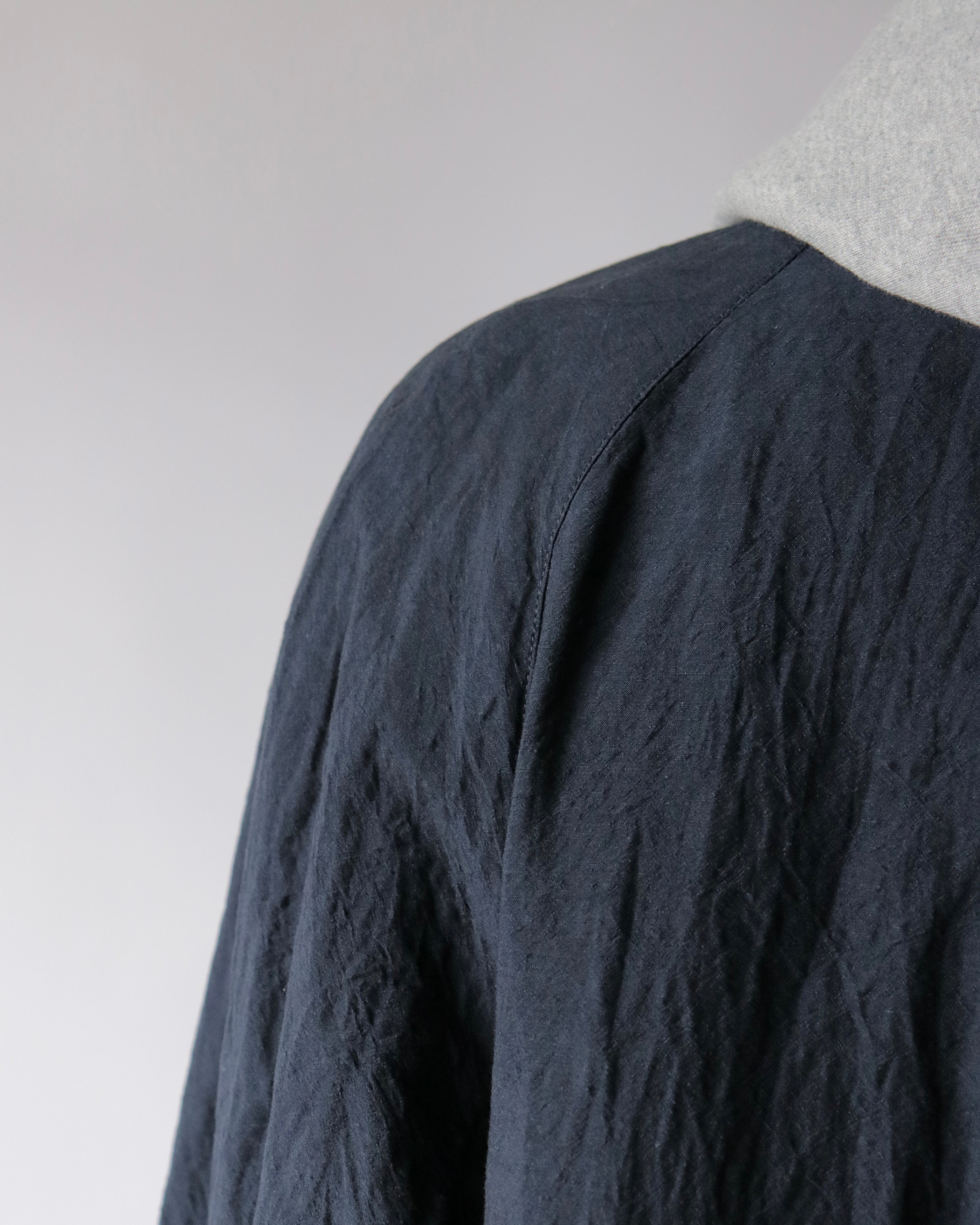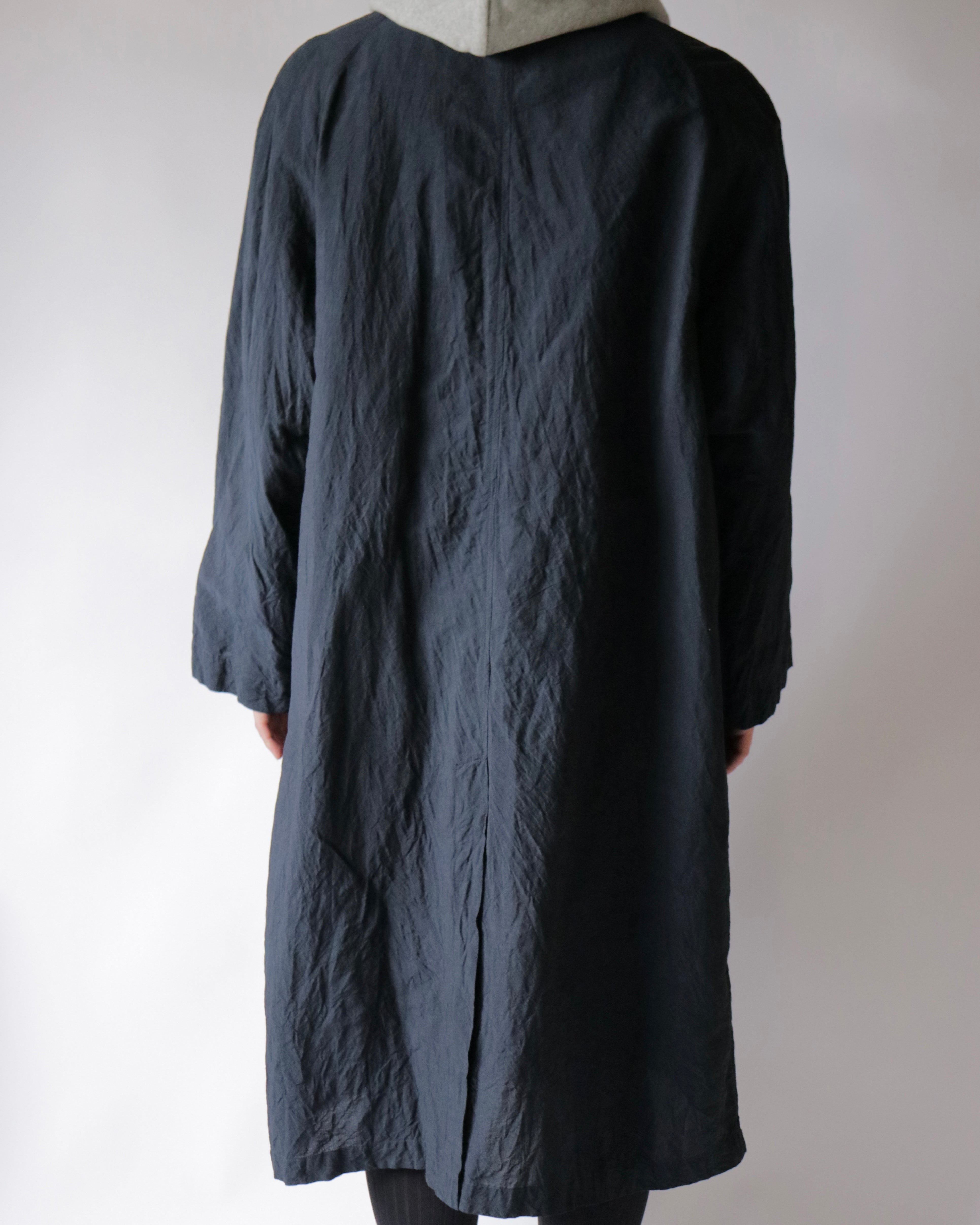 冬用のウールヴィンテージコートから着想を経たCAT COAT。冬以外の季節でも着用できるよう、ライニングを排した状態でもシルエットが保った設計。脇下にコードを通すためのループが付属。常夏にショーツと合わせて、裾を手繰り寄せ羽織る、夏の一張羅として。
