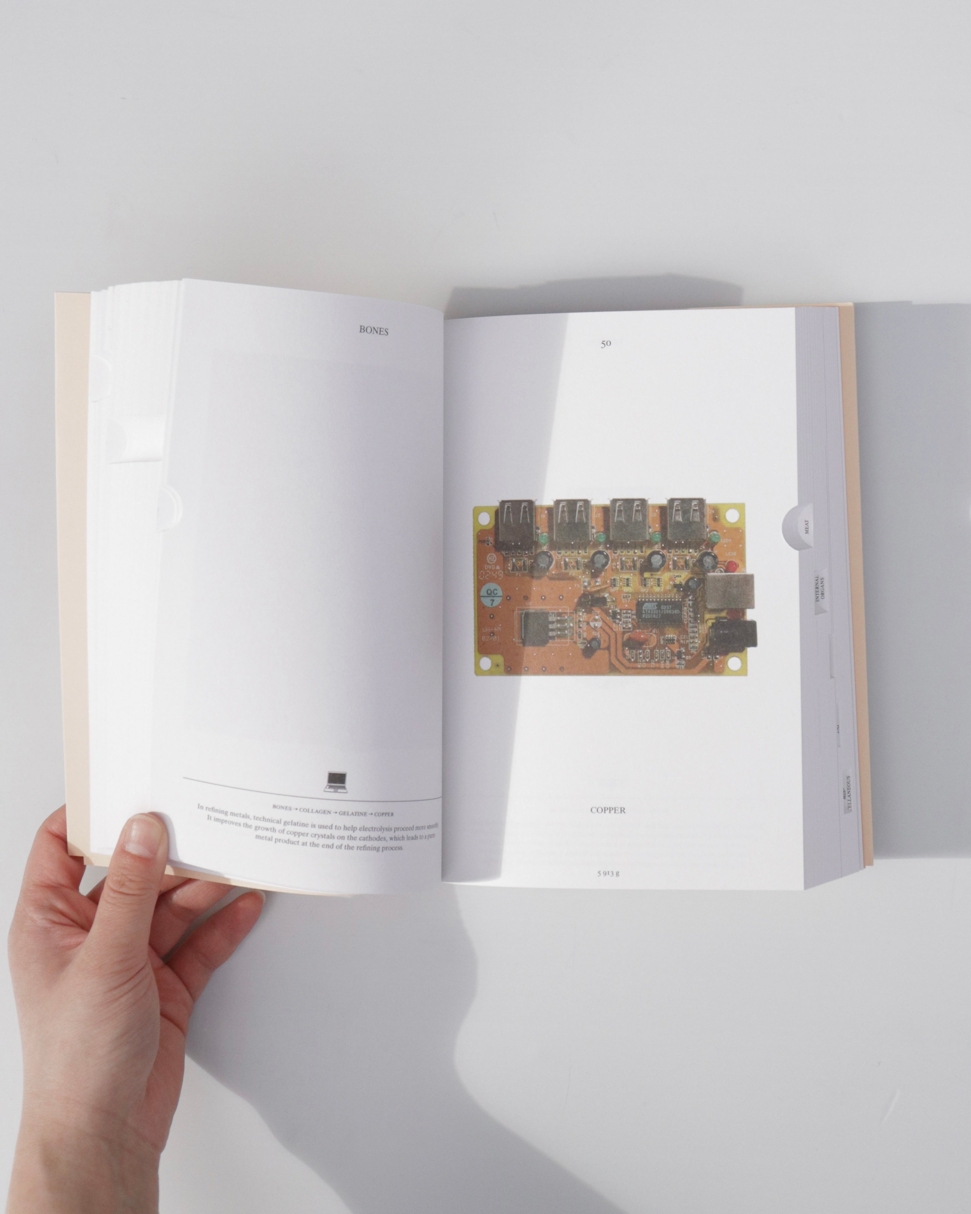ロッテルダムに拠点を置くアーティスト・デザイナー、クリスチャン・メンデルツマは、製品や原材料の背景にあるストーリーに焦点を当て新たな解釈を探求してきました。 本書は、1頭の豚からつくられたすべての製品を追跡するために、3年間の研究を経て開発されたコミュニケーションデザインをもとに作られた1冊。 「05049」はオランダの商業農場で飼育され、屠殺された実際の豚につけられた番号である。 「現代の商業生産では、原材料と最終製品の間に非常に多くの段階があります。そして、その間に多くのステップがあるため、知識が失われてしまうのです。例えば、養豚業者も自分の豚から作られる最終製品をすべて知っているわけではありません。なぜなら、それがどこに行くのかを知らないだけなのです」 本書のデザインもアーティスト本人によるものであり、100年後に掘り起こされ、その時代の暮らしが明らかになるかもしれないタイムカプセルのようなものをコンセプトにしています。