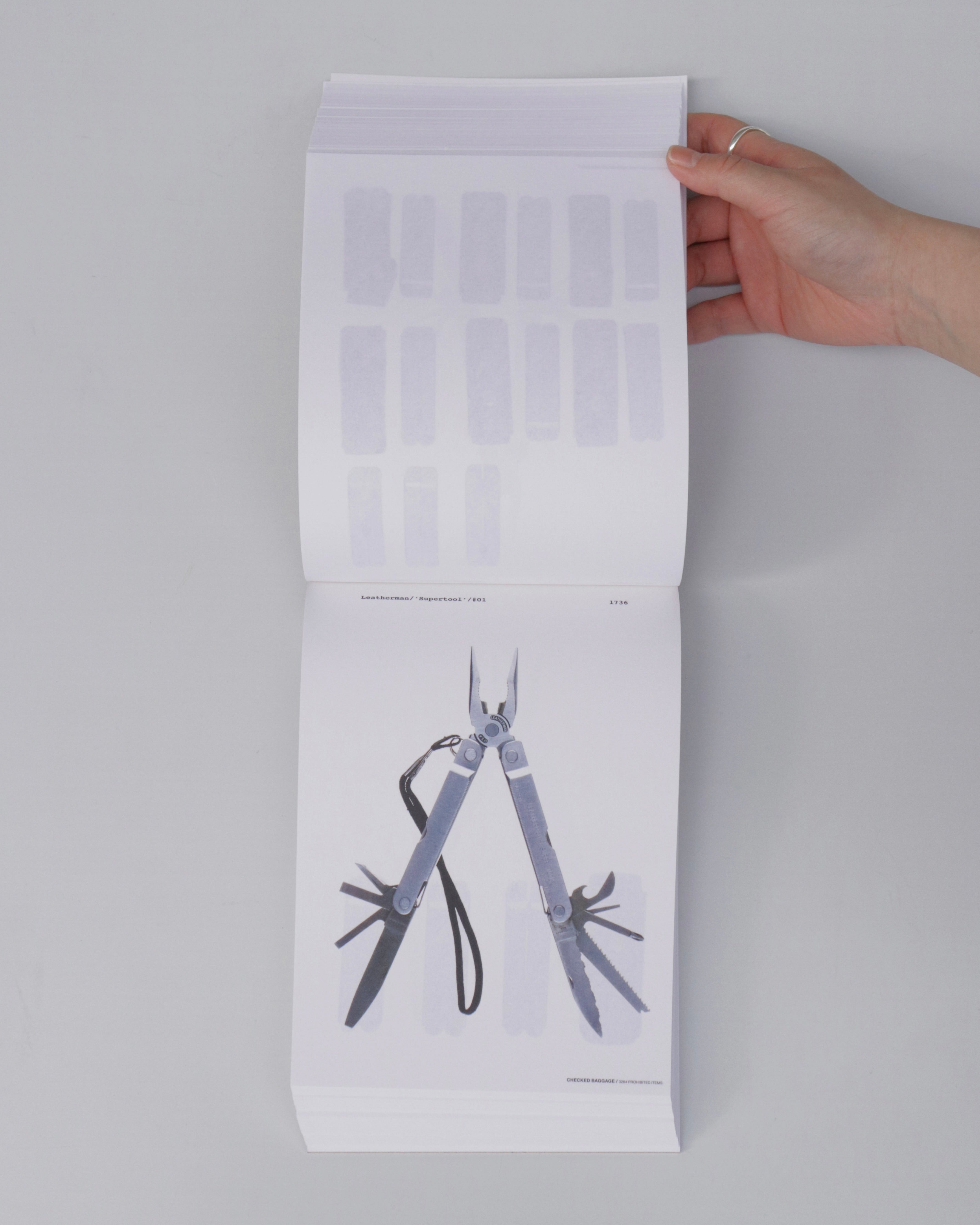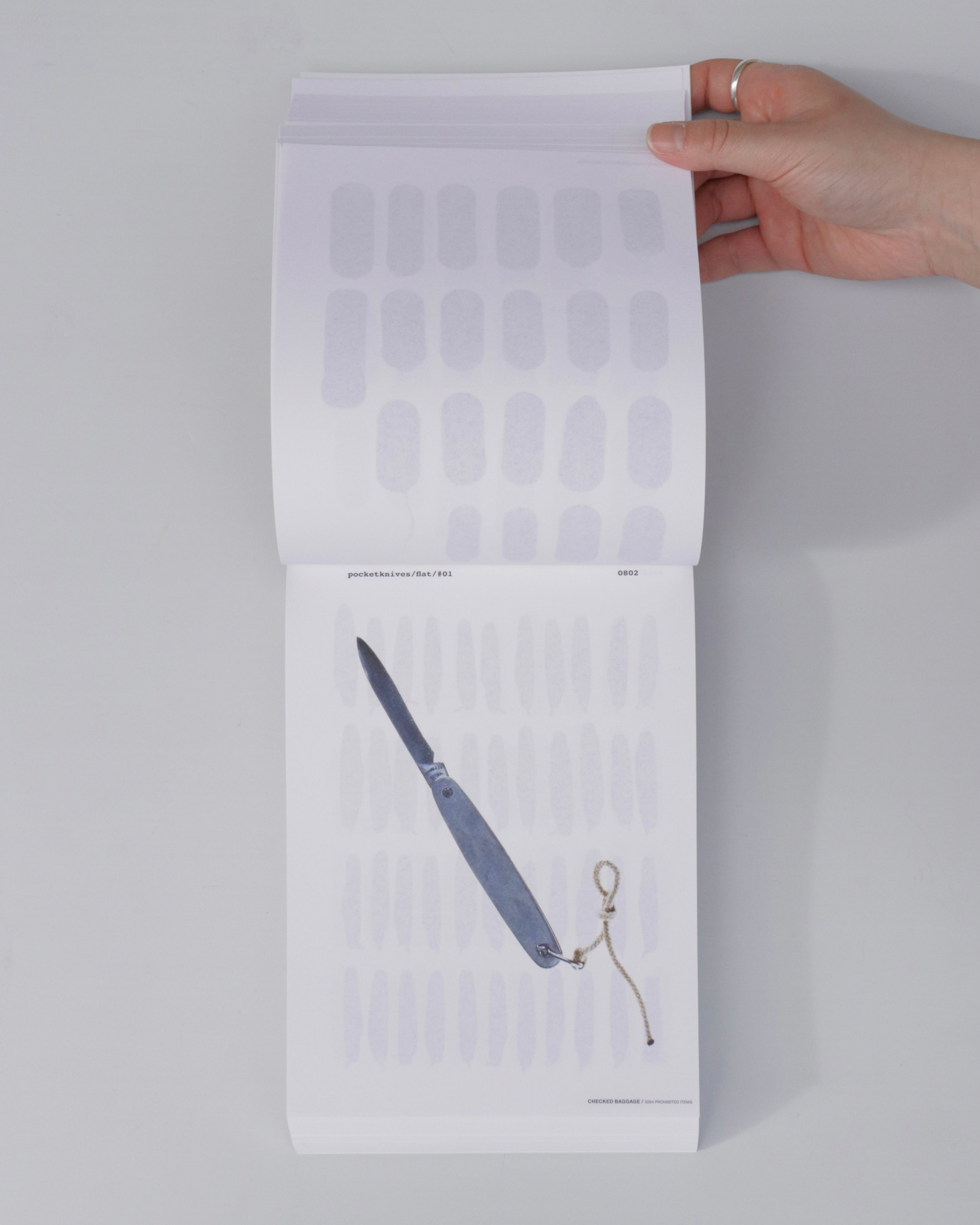 2004年に刊行されたChecked Baggage は、クリスチャン・メンデルツマがデザイン・アカデミー・アイントホーフェンで行った2つの卒業制作のうちの1つ。この本は、スキポール空港で1週間の間に旅行者から没収されたすべての品物が網羅されています。子供用のカトラリーからポテトナイフ、美容院のハサミから爪切りまで、押収されたあらゆるものを掲載されています。 彼女はこのプロジェクトによって、セキュリティが強化された時代に、私物まで没収されるという事態のおかしさをとらえ、それを視覚的に示そうとしました。2004年には1000冊の本が出版され、1冊売れるごとに、購入者には没収された元の品物が1つずつ手渡されていきました。 刊行から2年の2006年にはマーティン・パーによる写真集の歴史をまとめた「The Photobook: A History VOLUME 2」でも紹介され、世界中で高く評価される1冊となっています。 メンデルツマは、1843冊の「没収品」を保管していたため、このアートピースの第2版であり最終版でもある本書は1843冊となりました。各書籍には没収品の1つがシュリンクラップで包まれています。