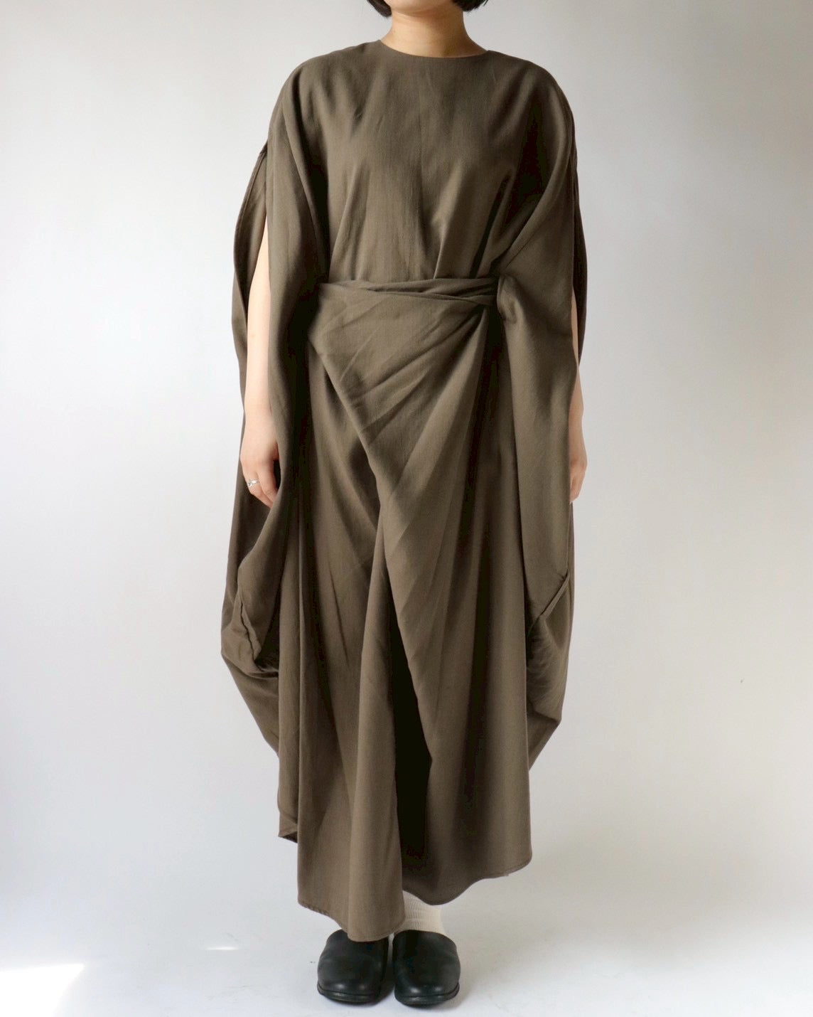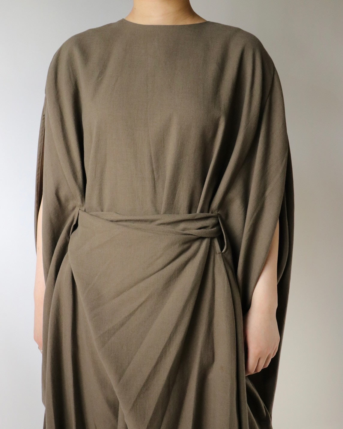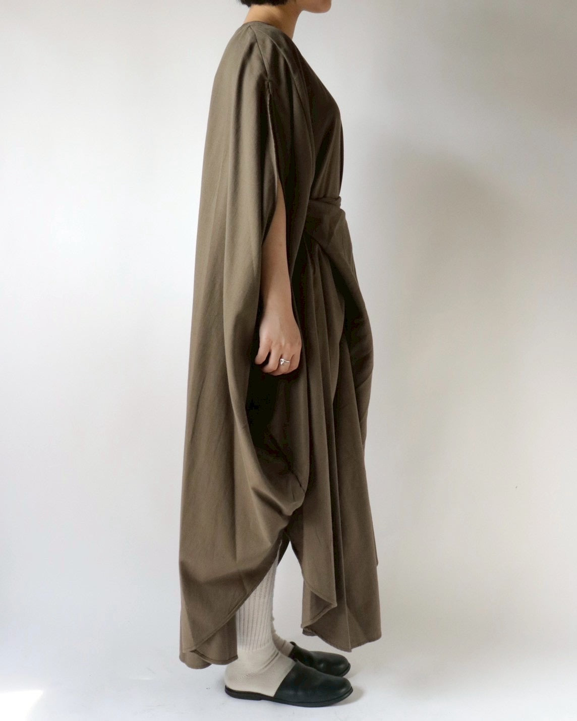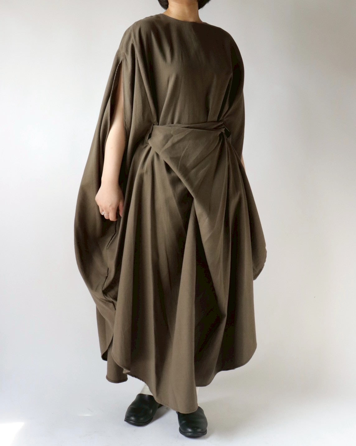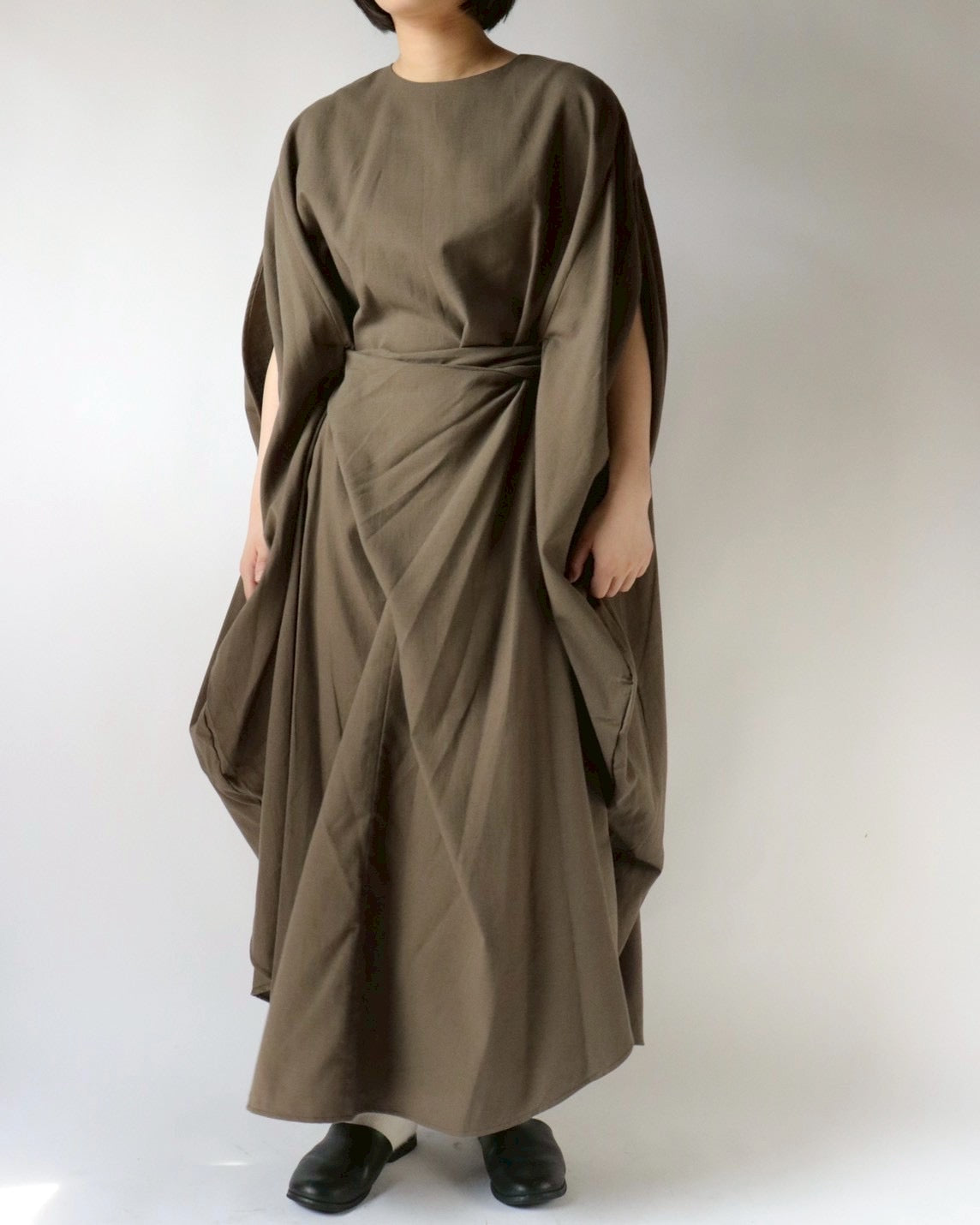 円形のパターンワークとラップスカートが生み出すドレープがさまざまな表情を見せるラップドレス。コットンカシミヤのラップドレスは、肌触りが優しく暖かみのある風合いになります。