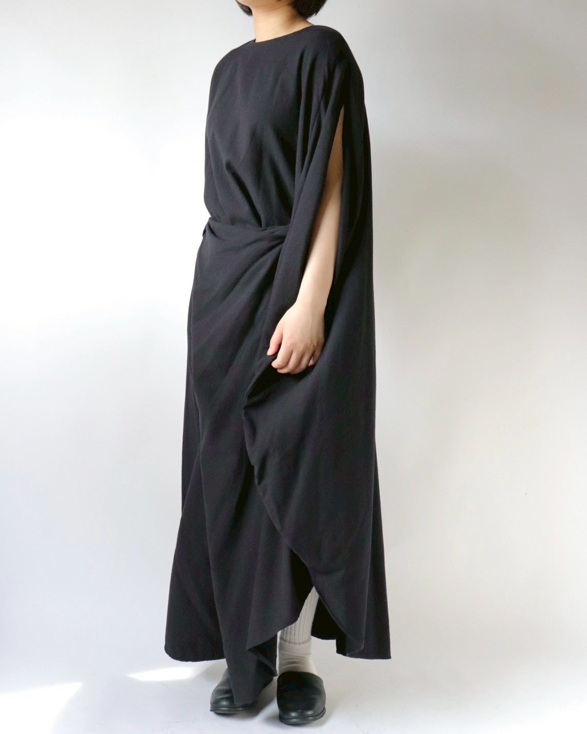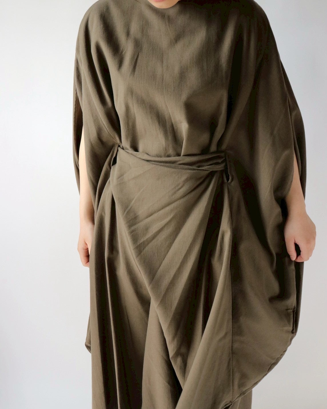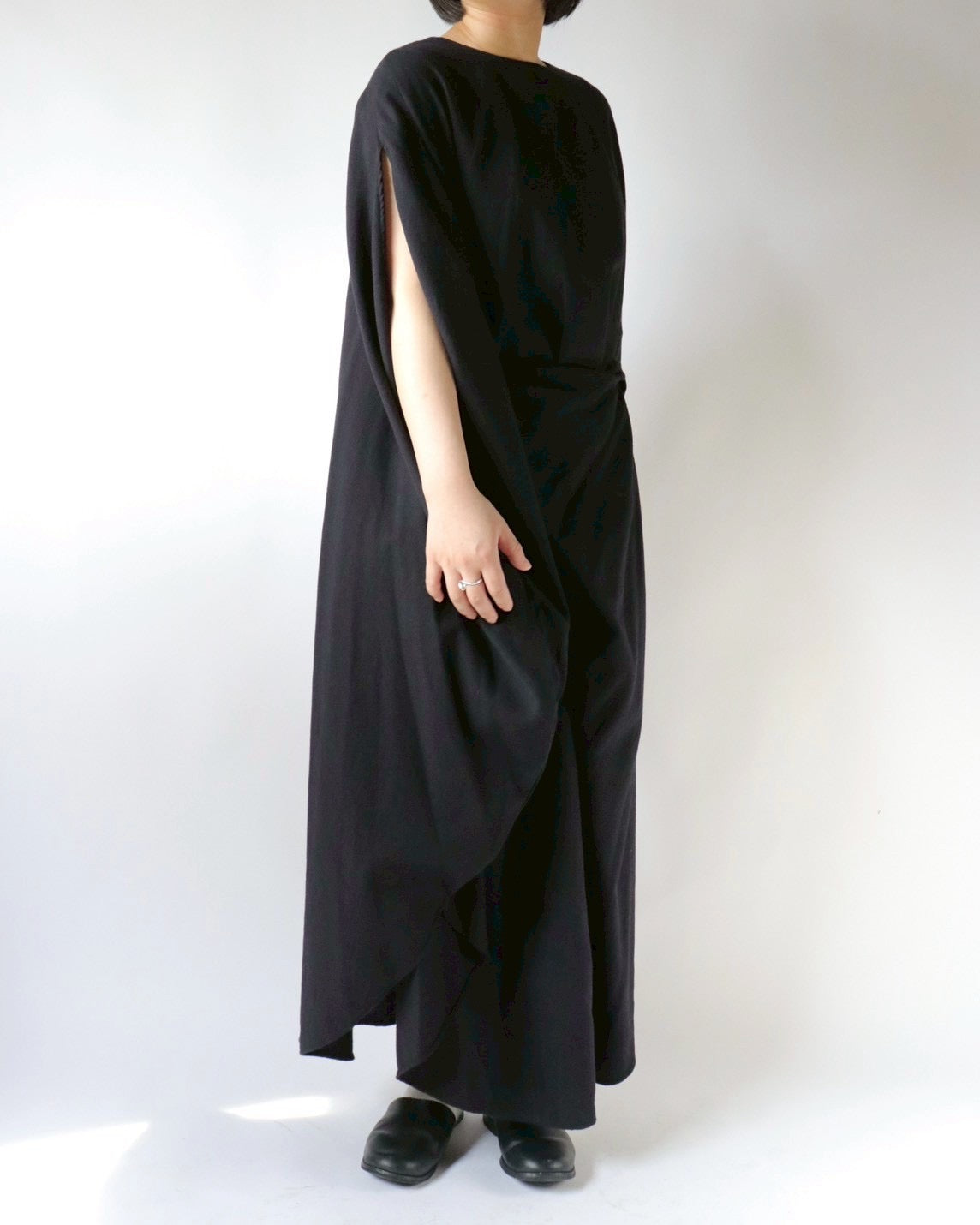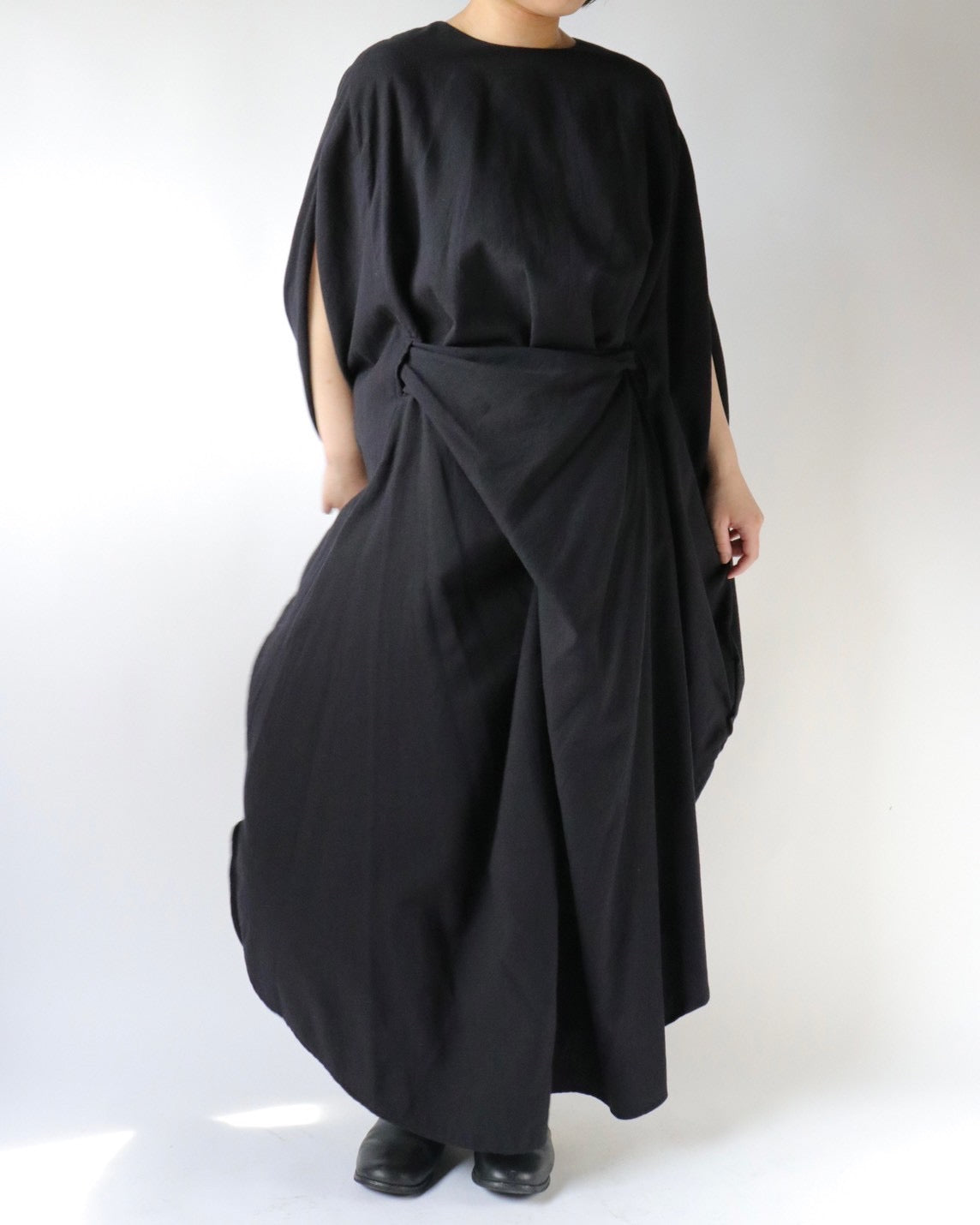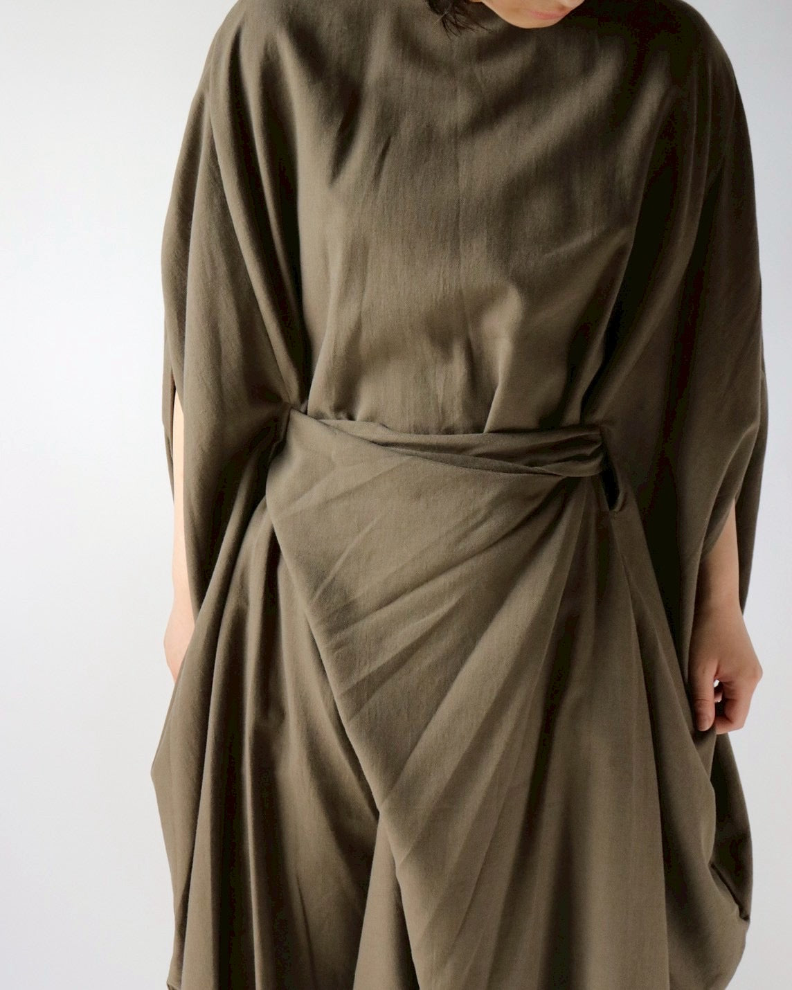 円形のパターンワークとラップスカートが生み出すドレープがさまざまな表情を見せるラップドレス。コットンカシミヤのラップドレスは、肌触りが優しく暖かみのある風合いになります。