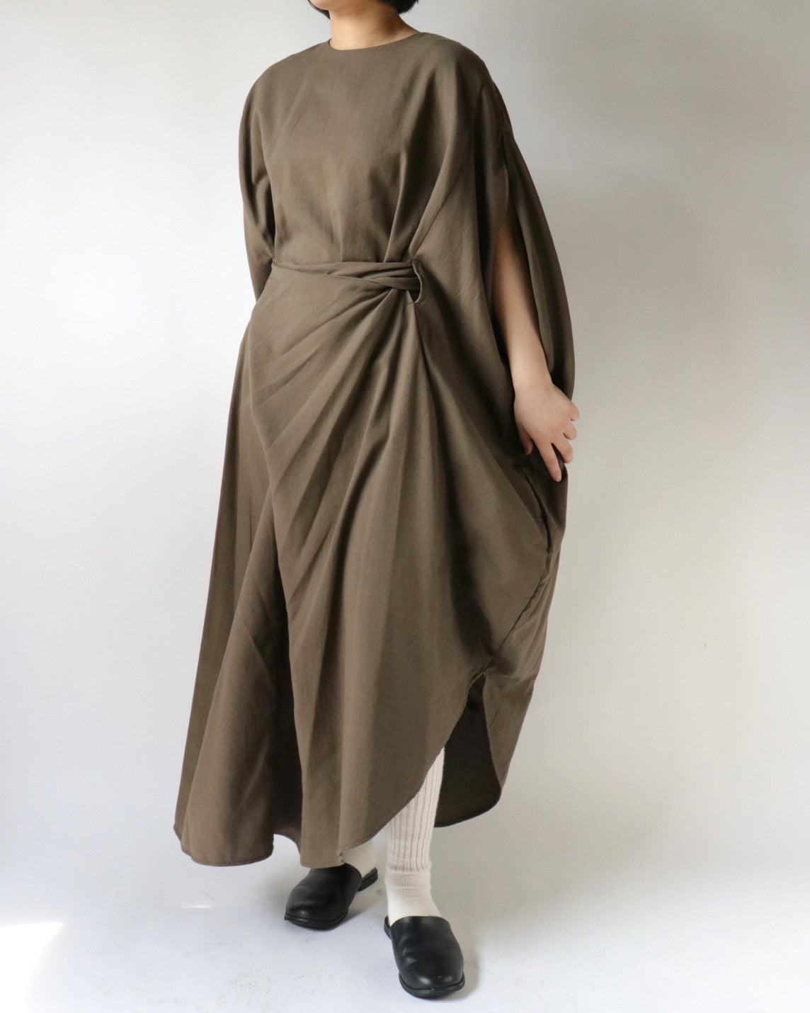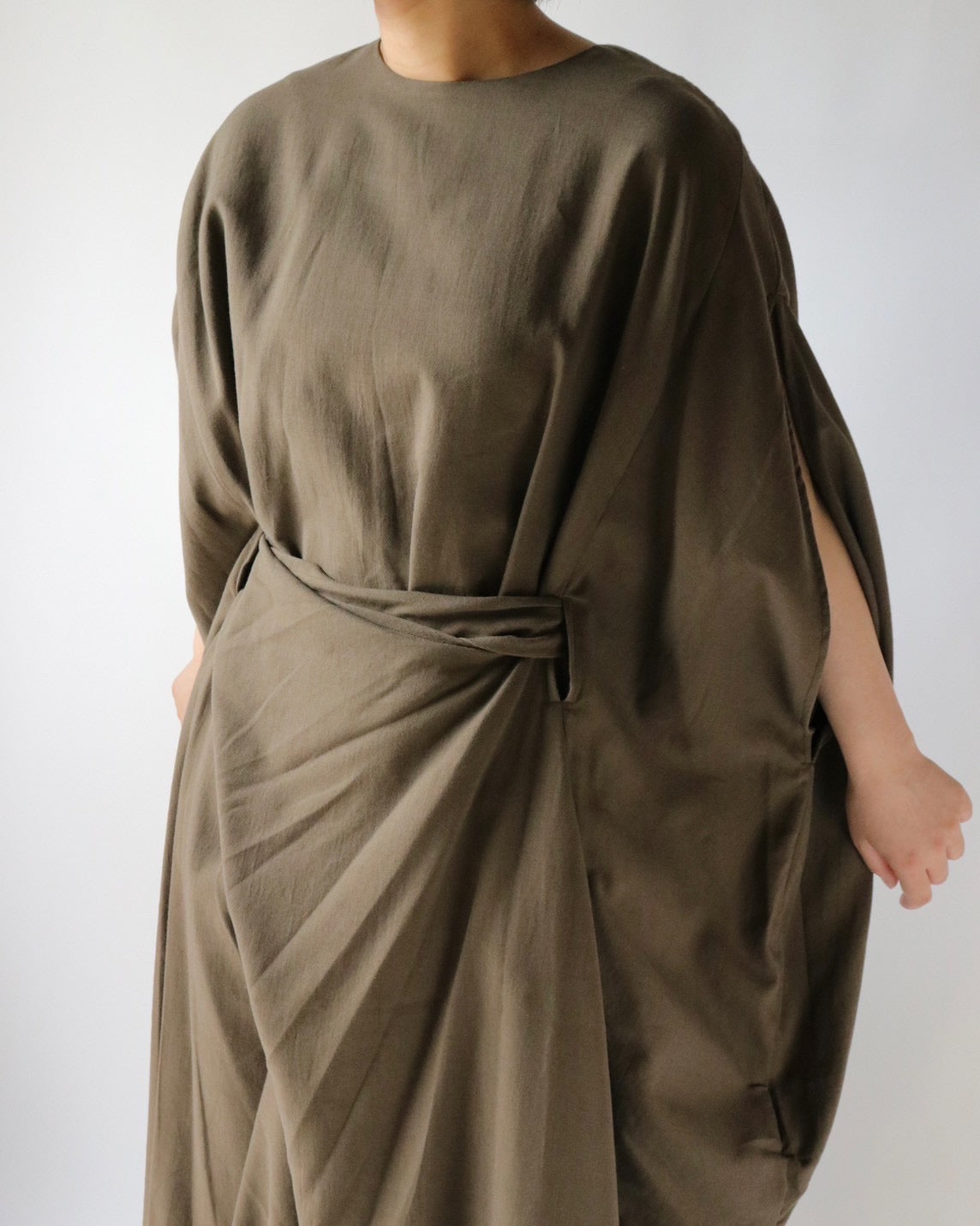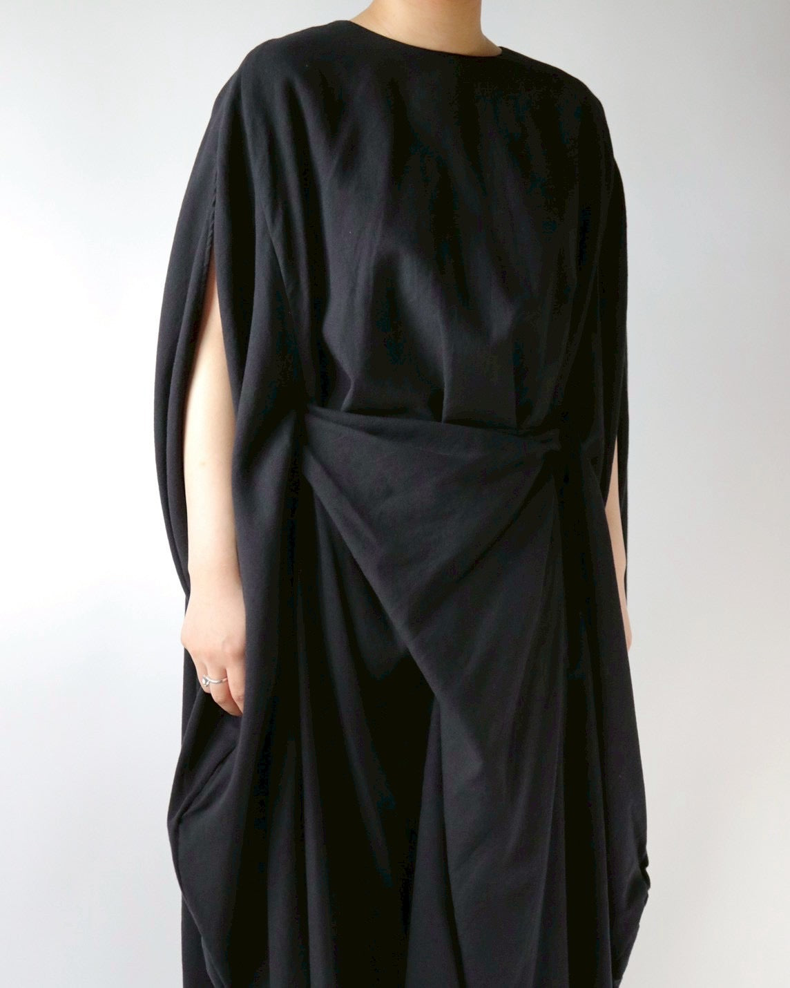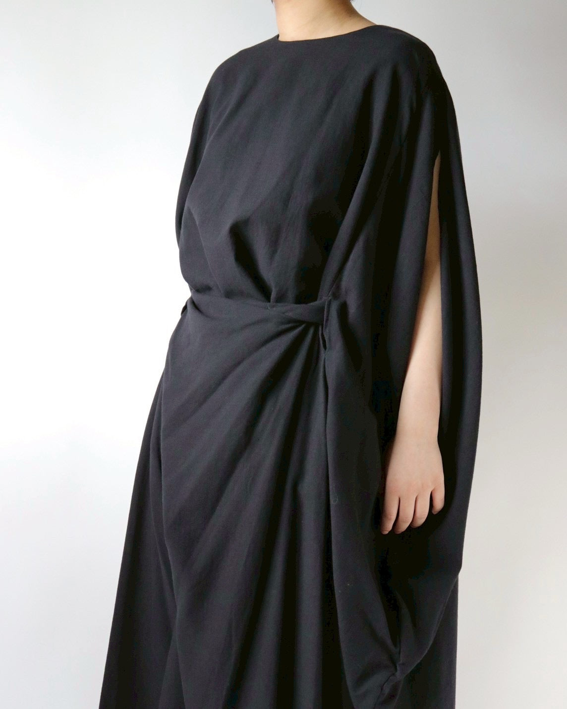 円形のパターンワークとラップスカートが生み出すドレープがさまざまな表情を見せるラップドレス。コットンカシミヤのラップドレスは、肌触りが優しく暖かみのある風合いになります。