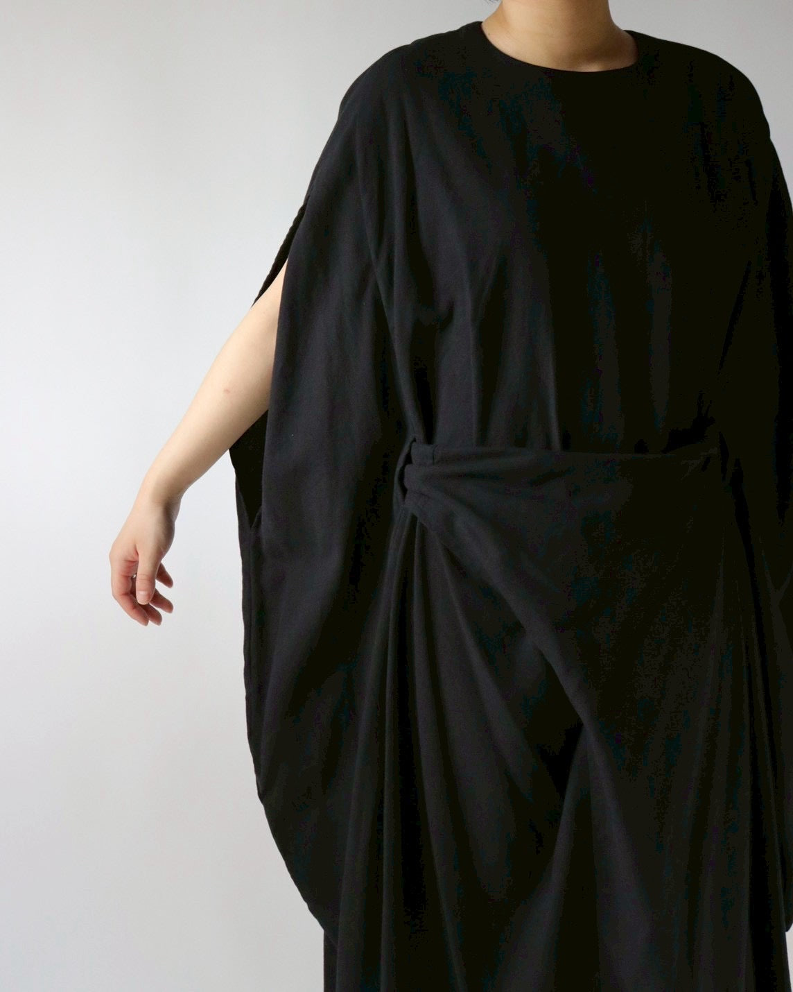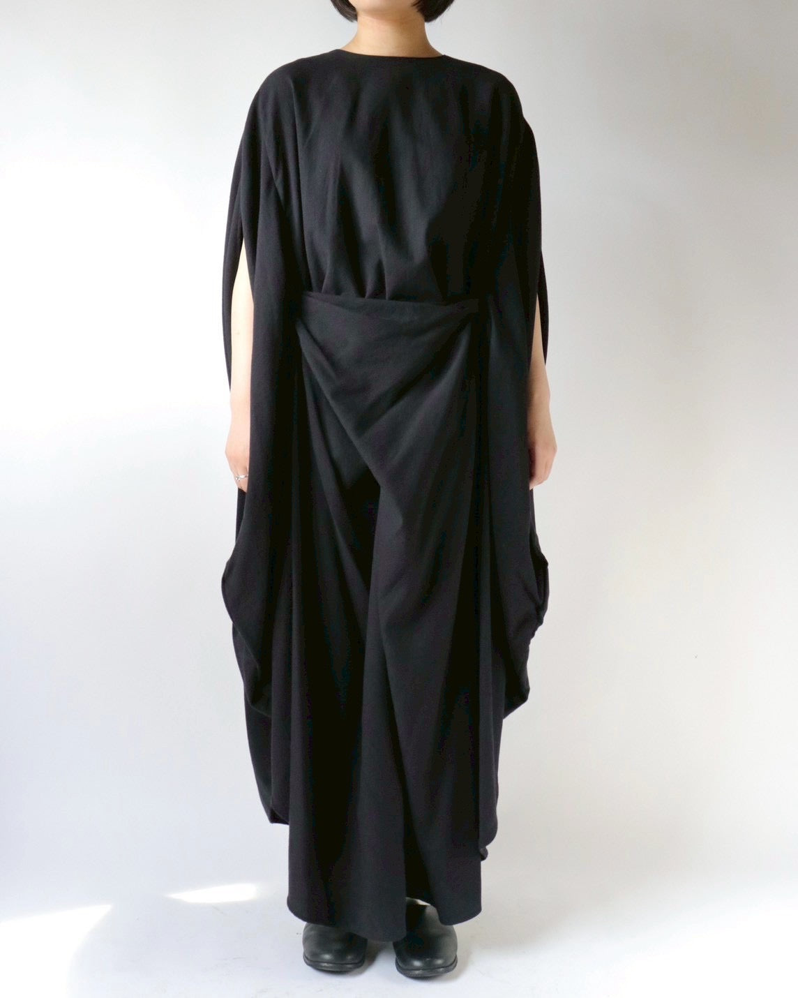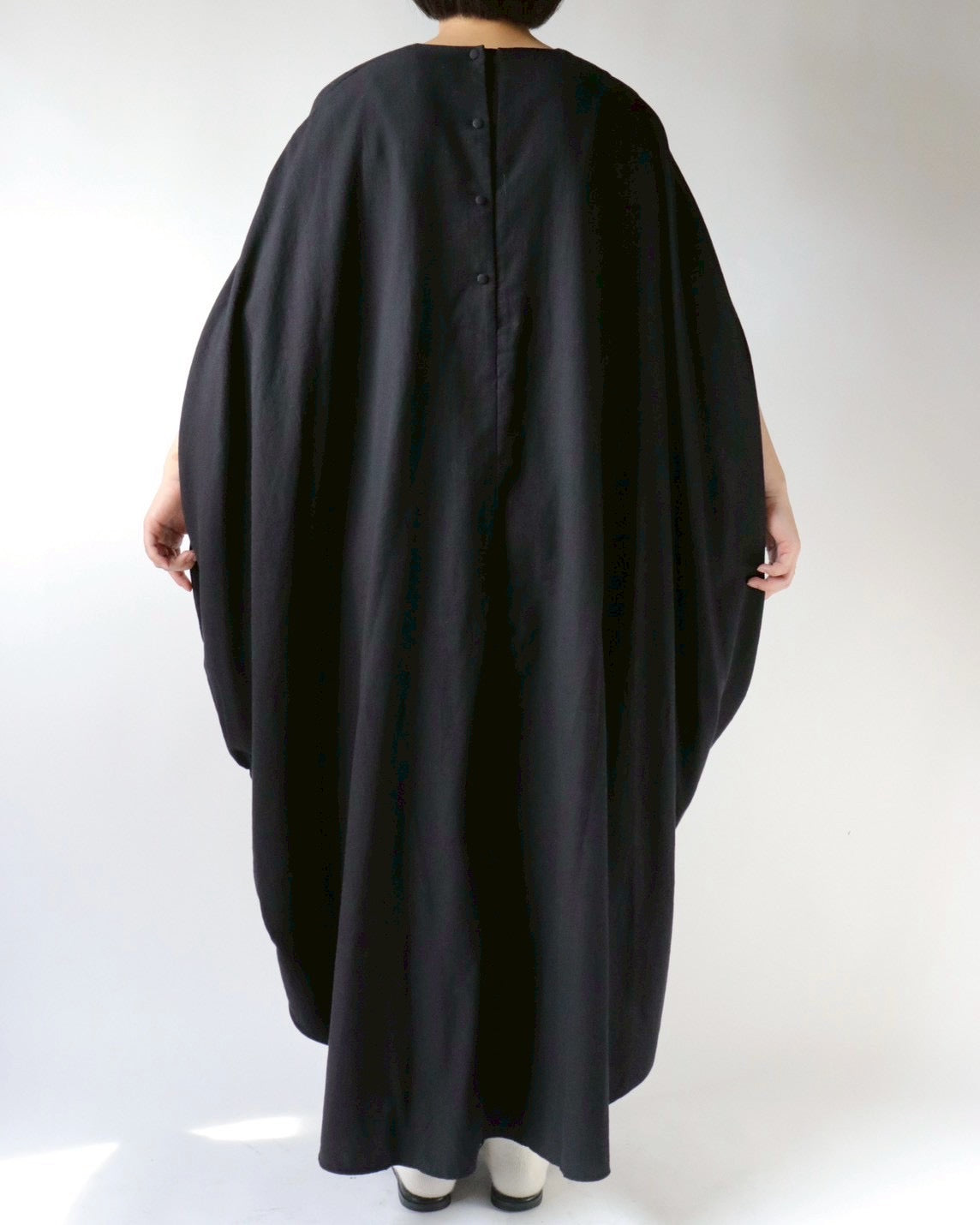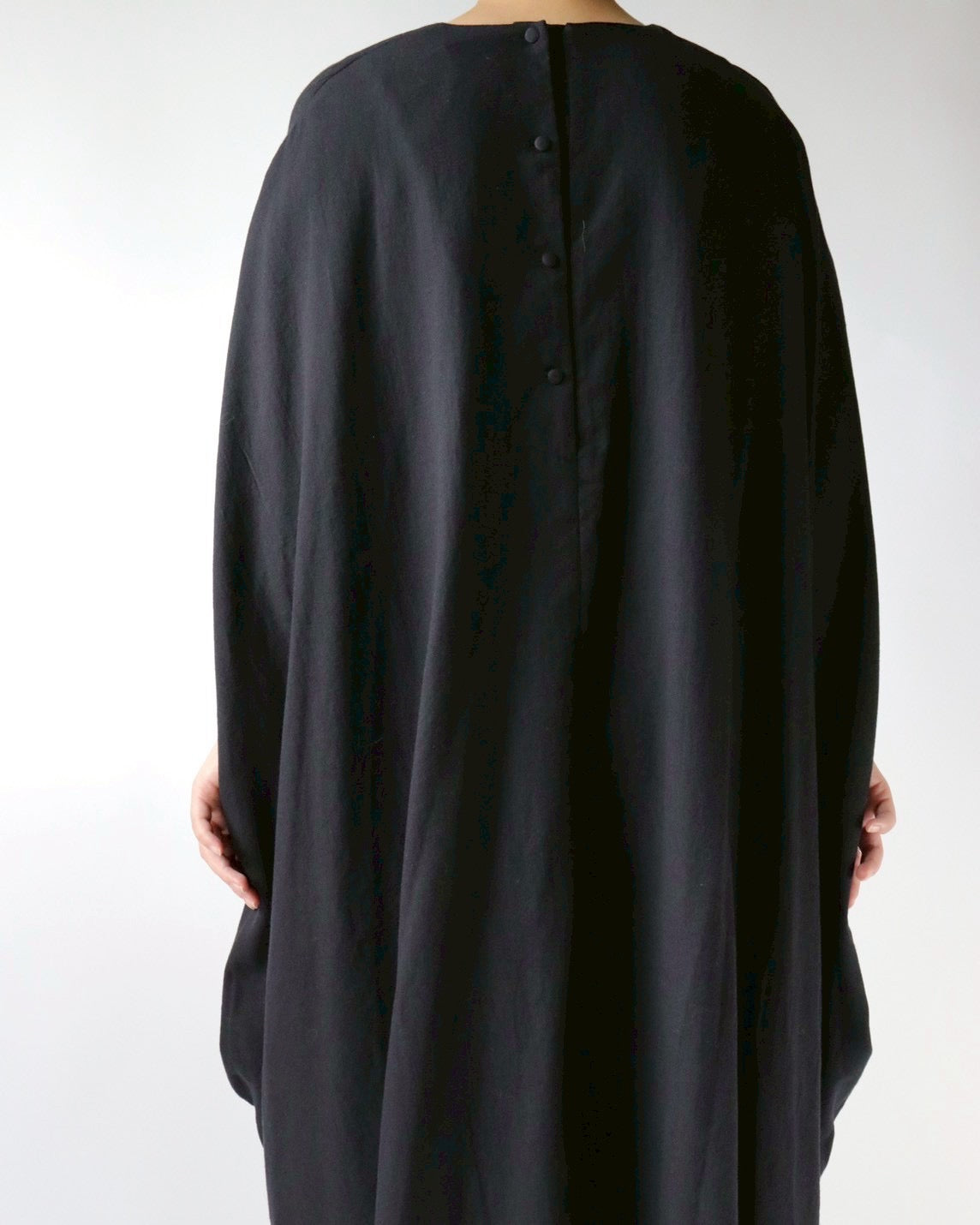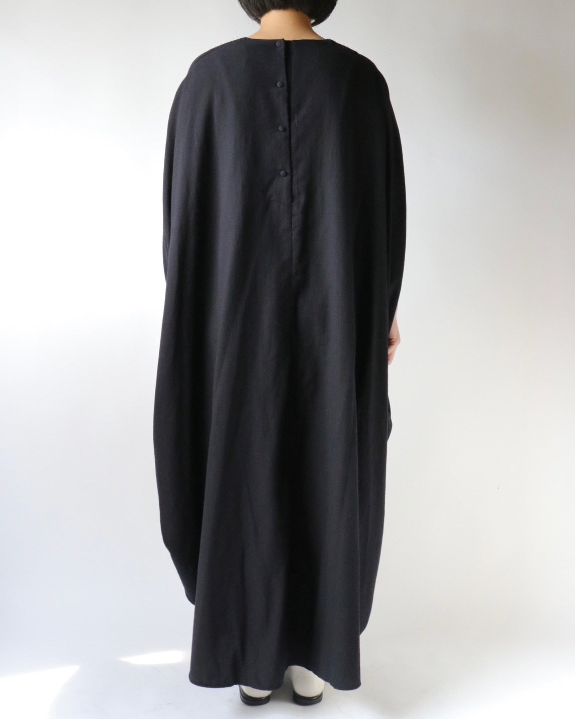 円形のパターンワークとラップスカートが生み出すドレープがさまざまな表情を見せるラップドレス。コットンカシミヤのラップドレスは、肌触りが優しく暖かみのある風合いになります。