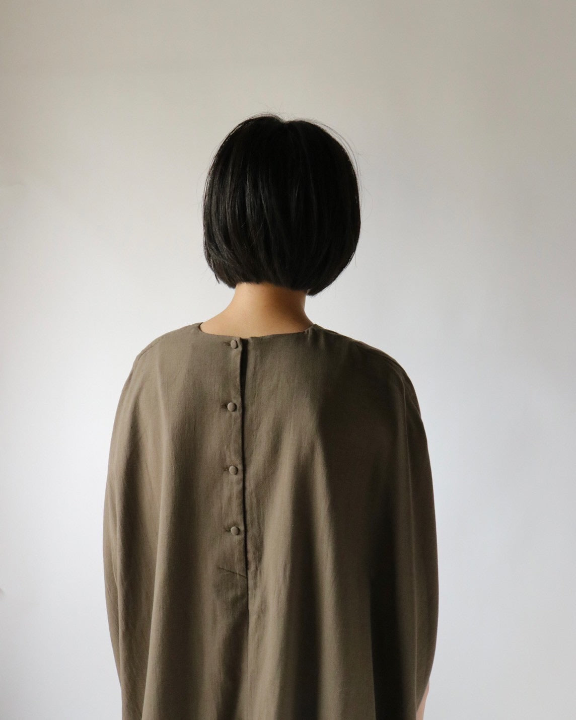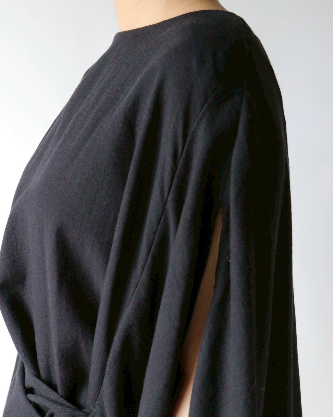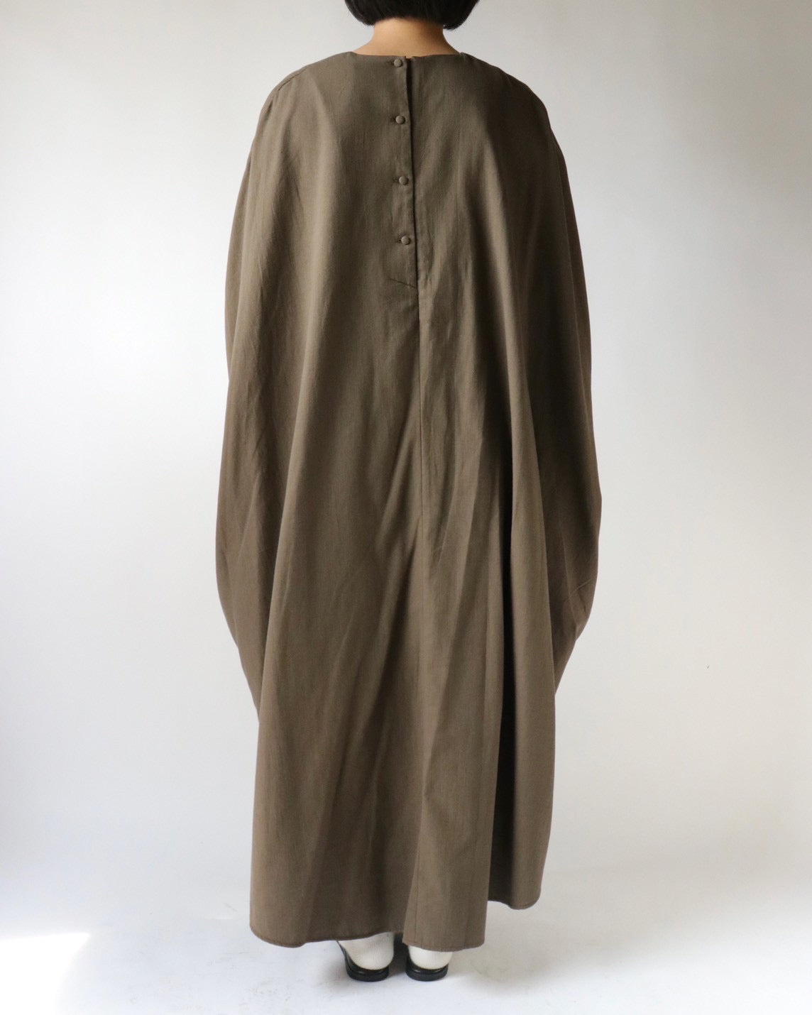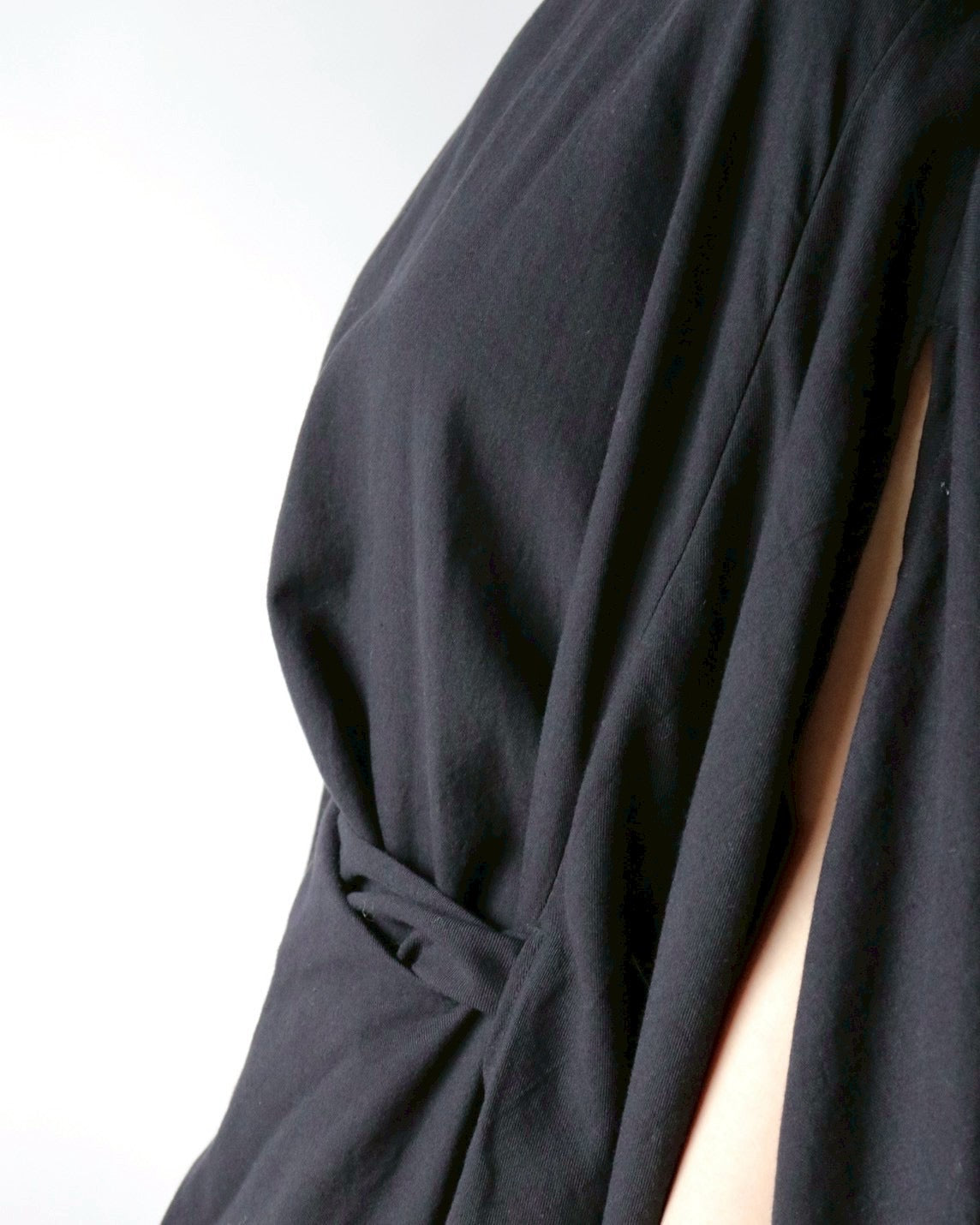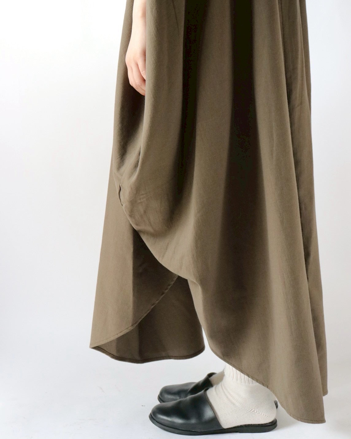 円形のパターンワークとラップスカートが生み出すドレープがさまざまな表情を見せるラップドレス。コットンカシミヤのラップドレスは、肌触りが優しく暖かみのある風合いになります。