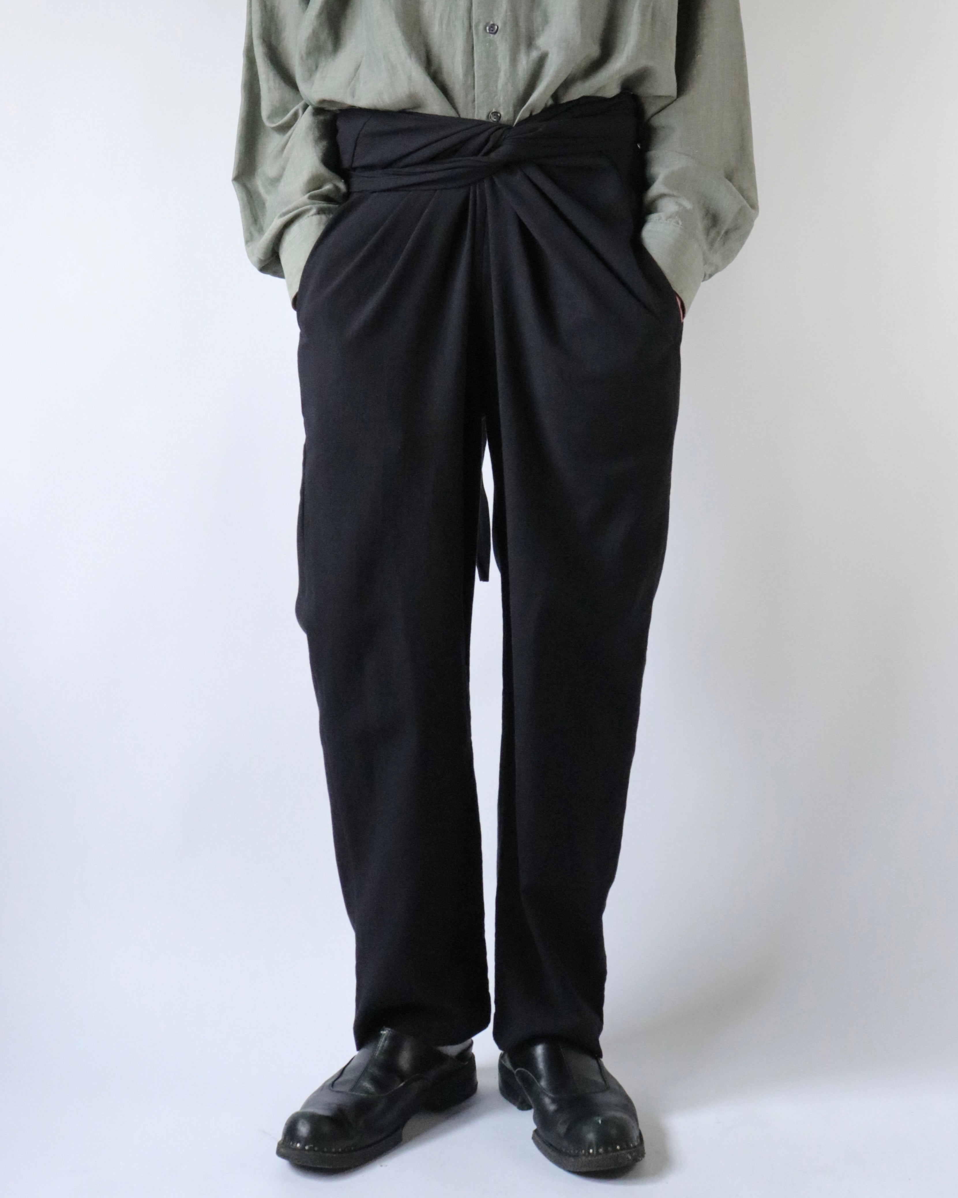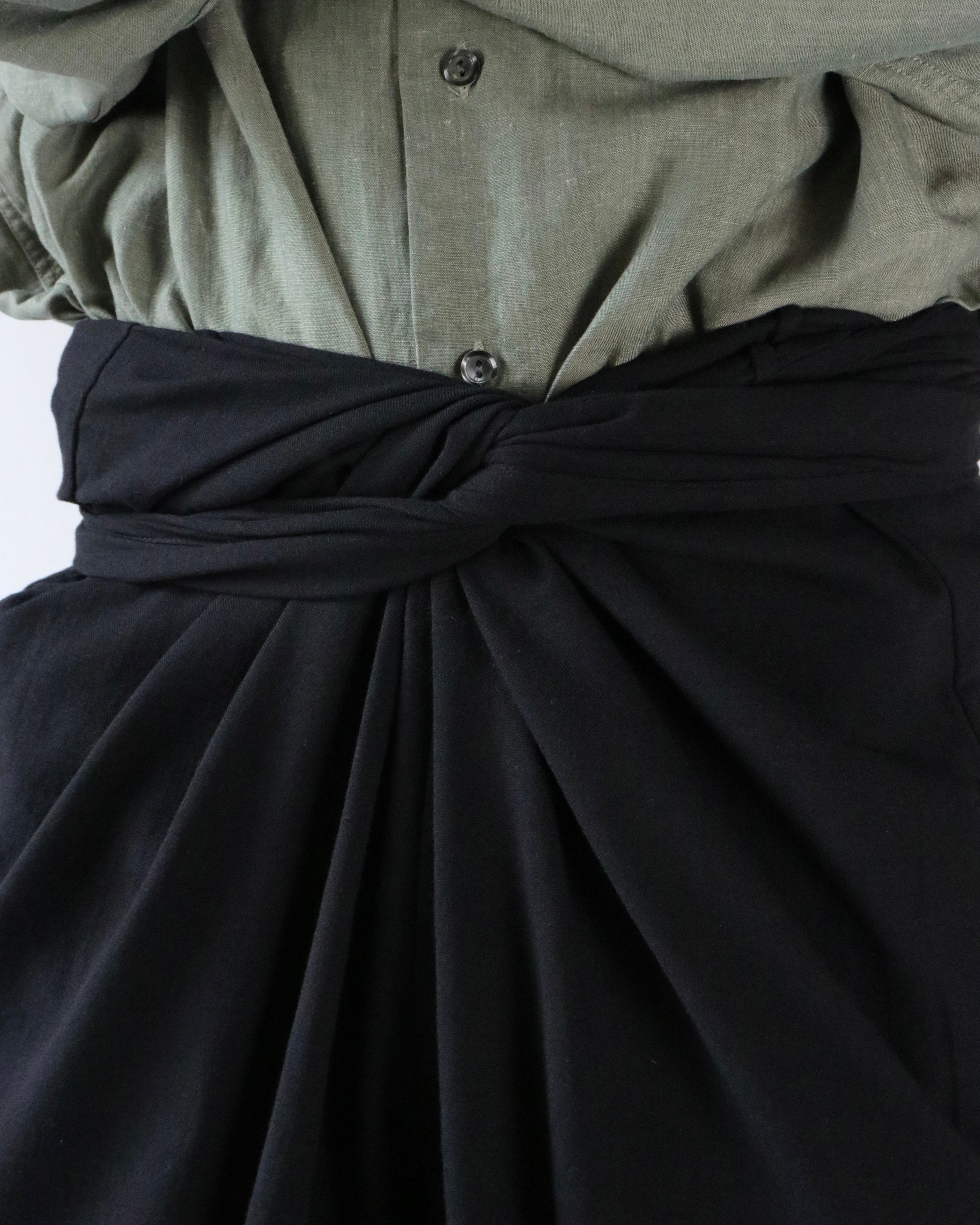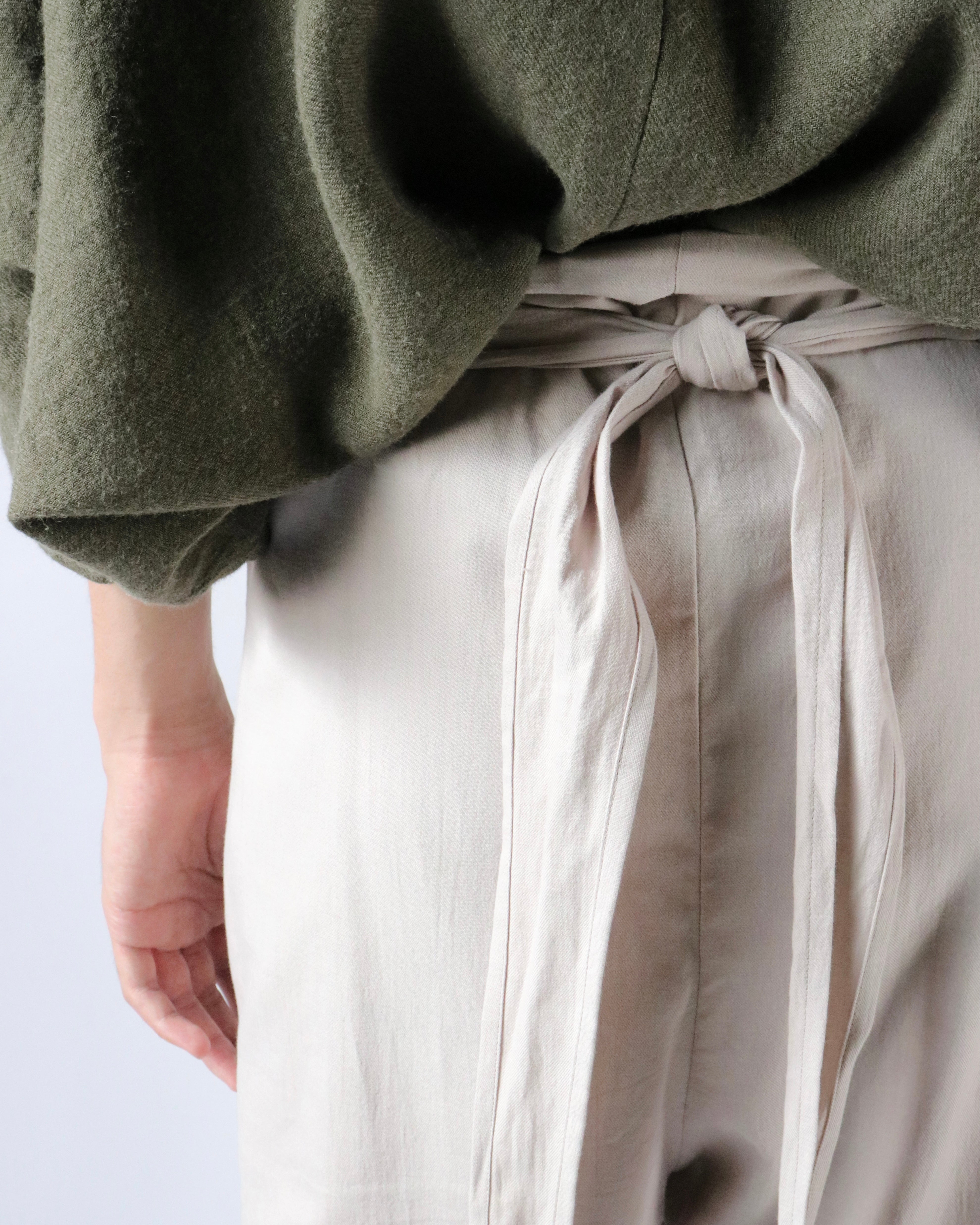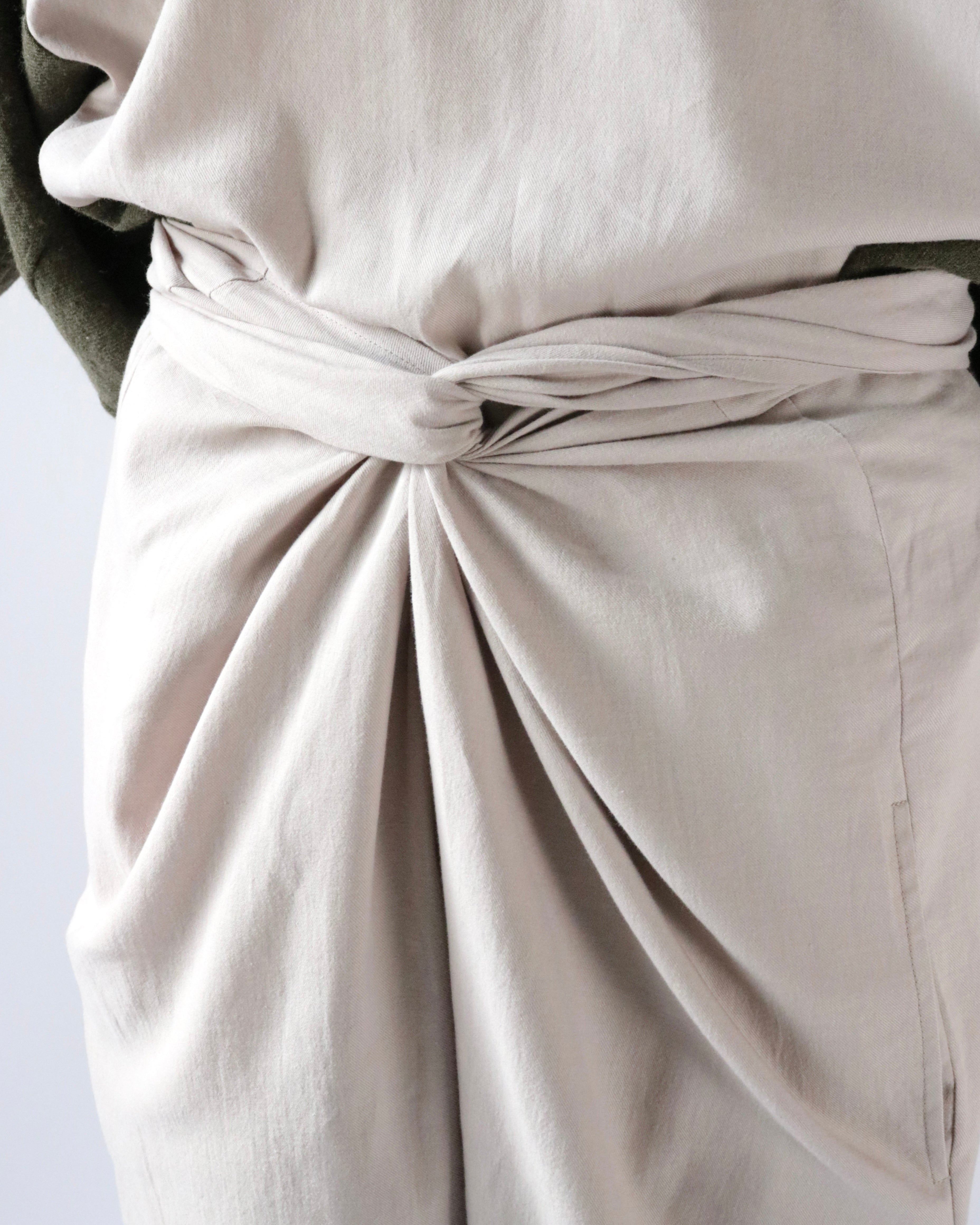 ジッパーやボタンなどを排したシームレスなドレープが美しいラップパンツ。コットンカシミヤのラップパンツは、肌触りが優しく暖かみのある風合いになります。結び方や折り方の違いで、多様な生地の動きを楽しんでいただけます。