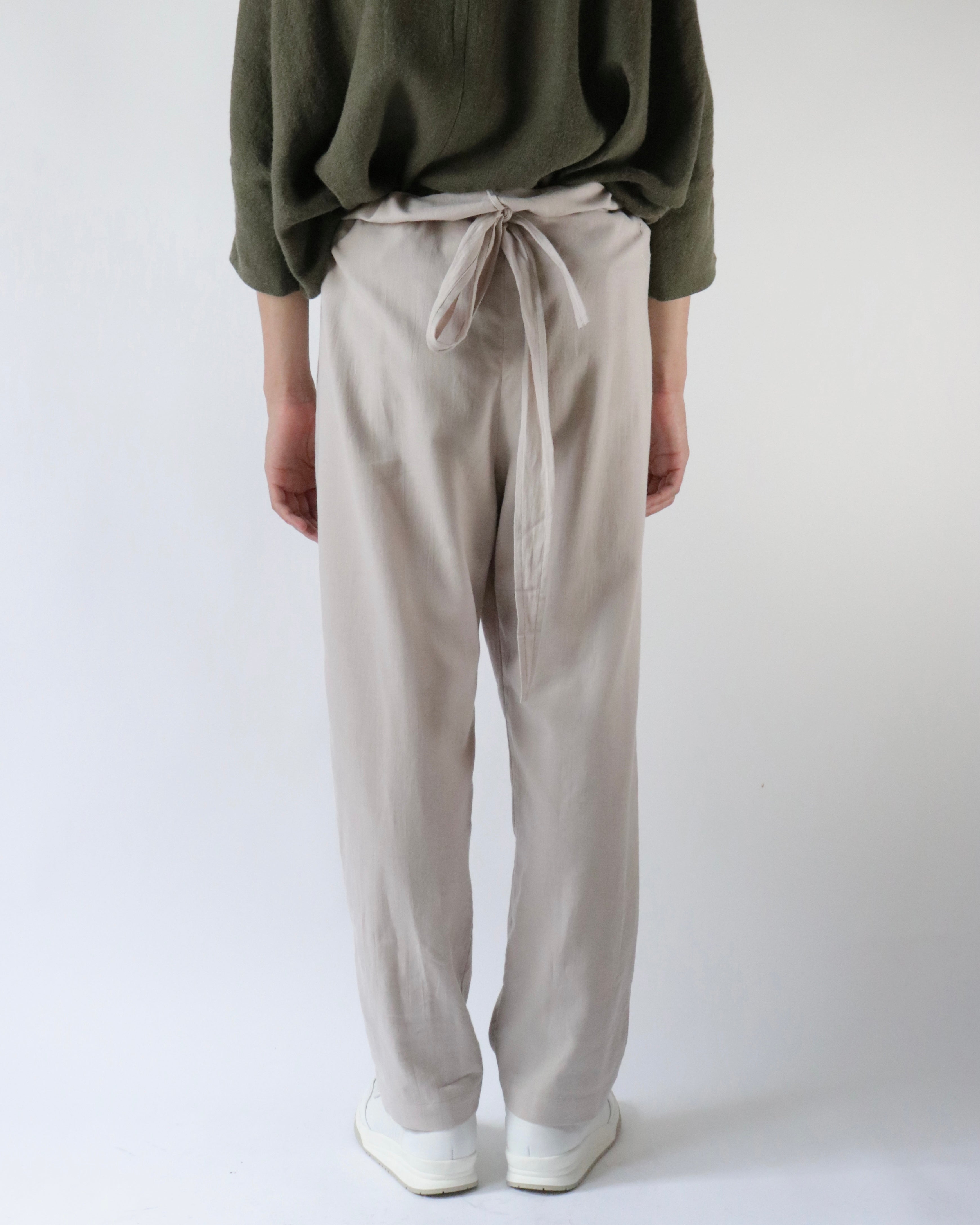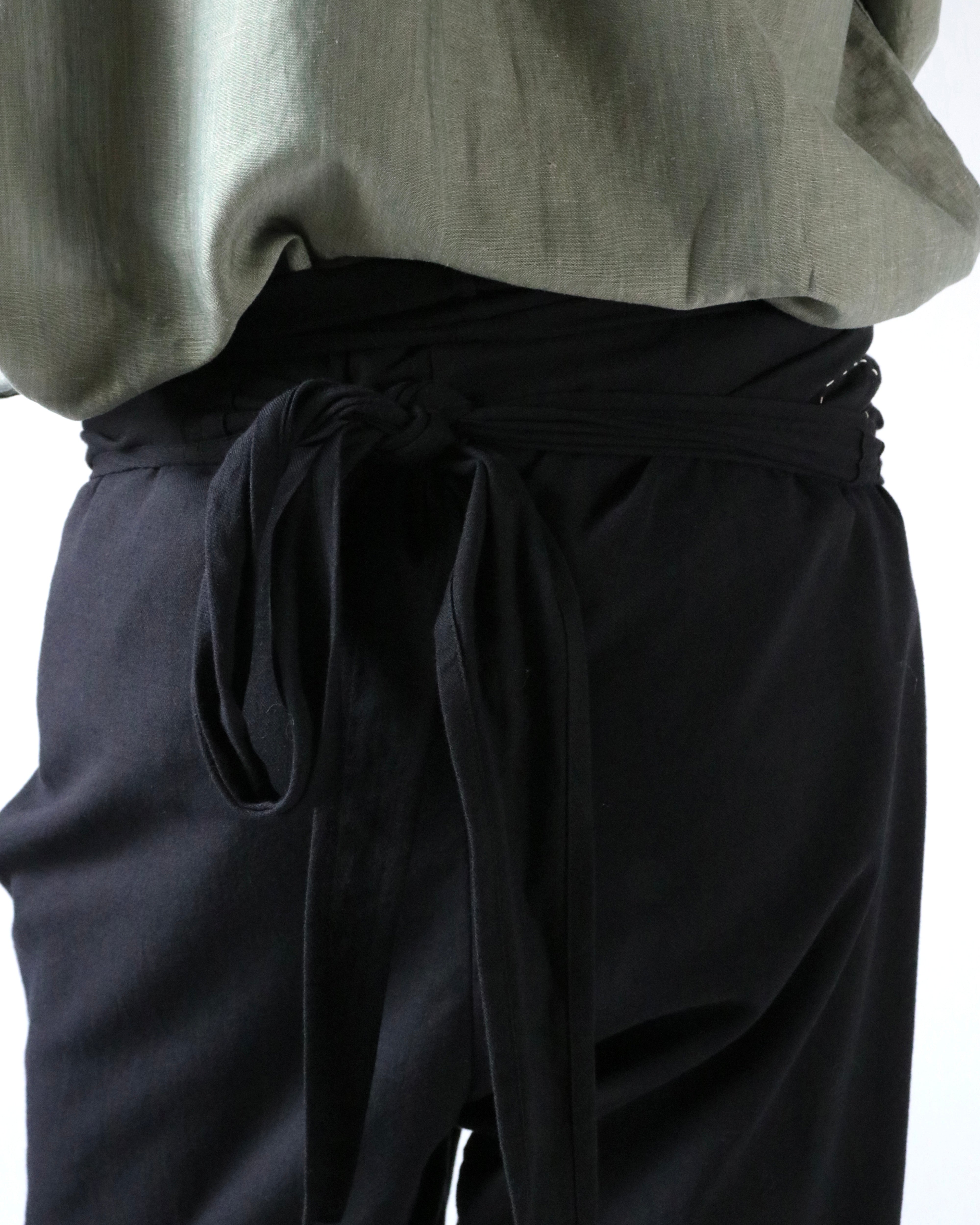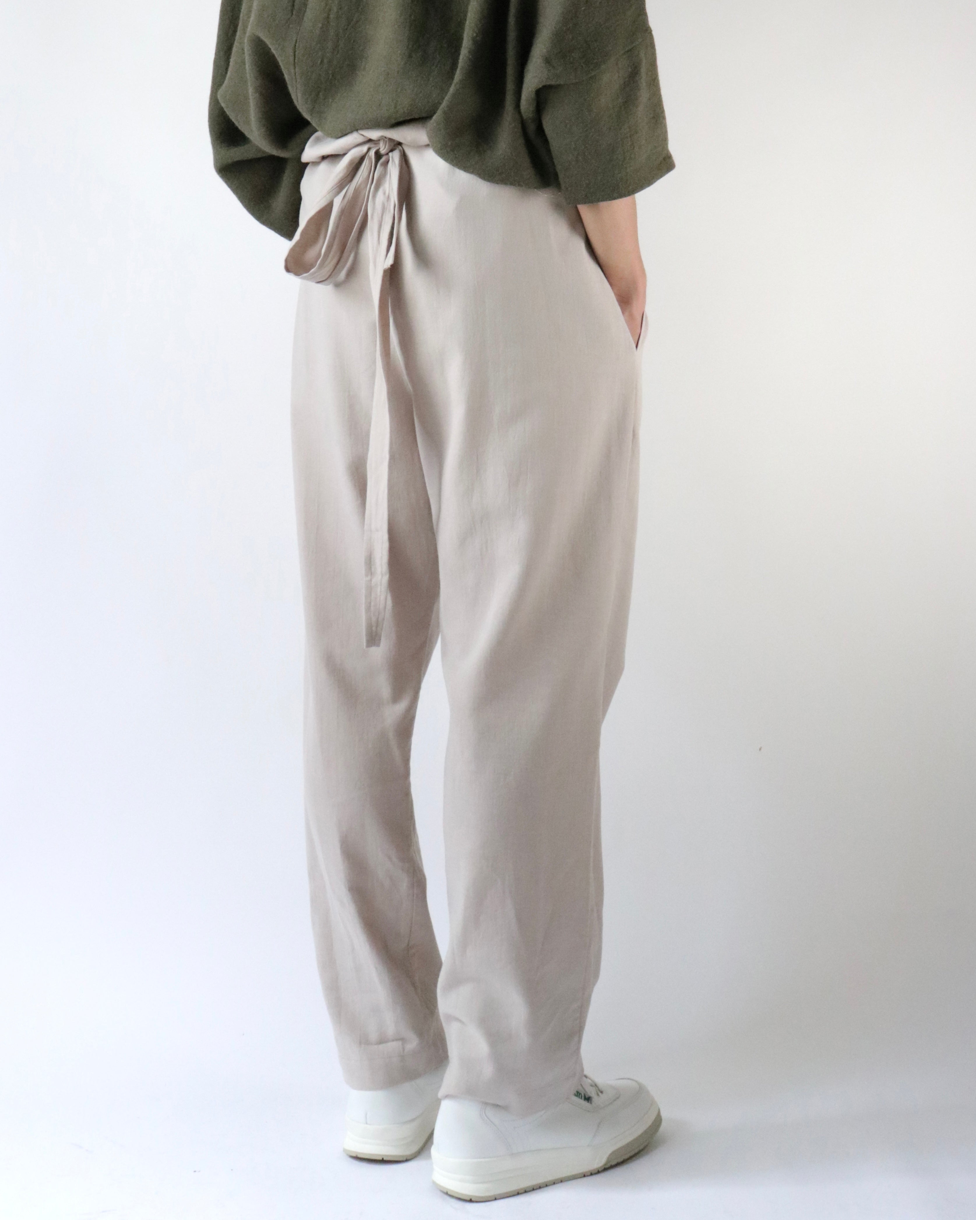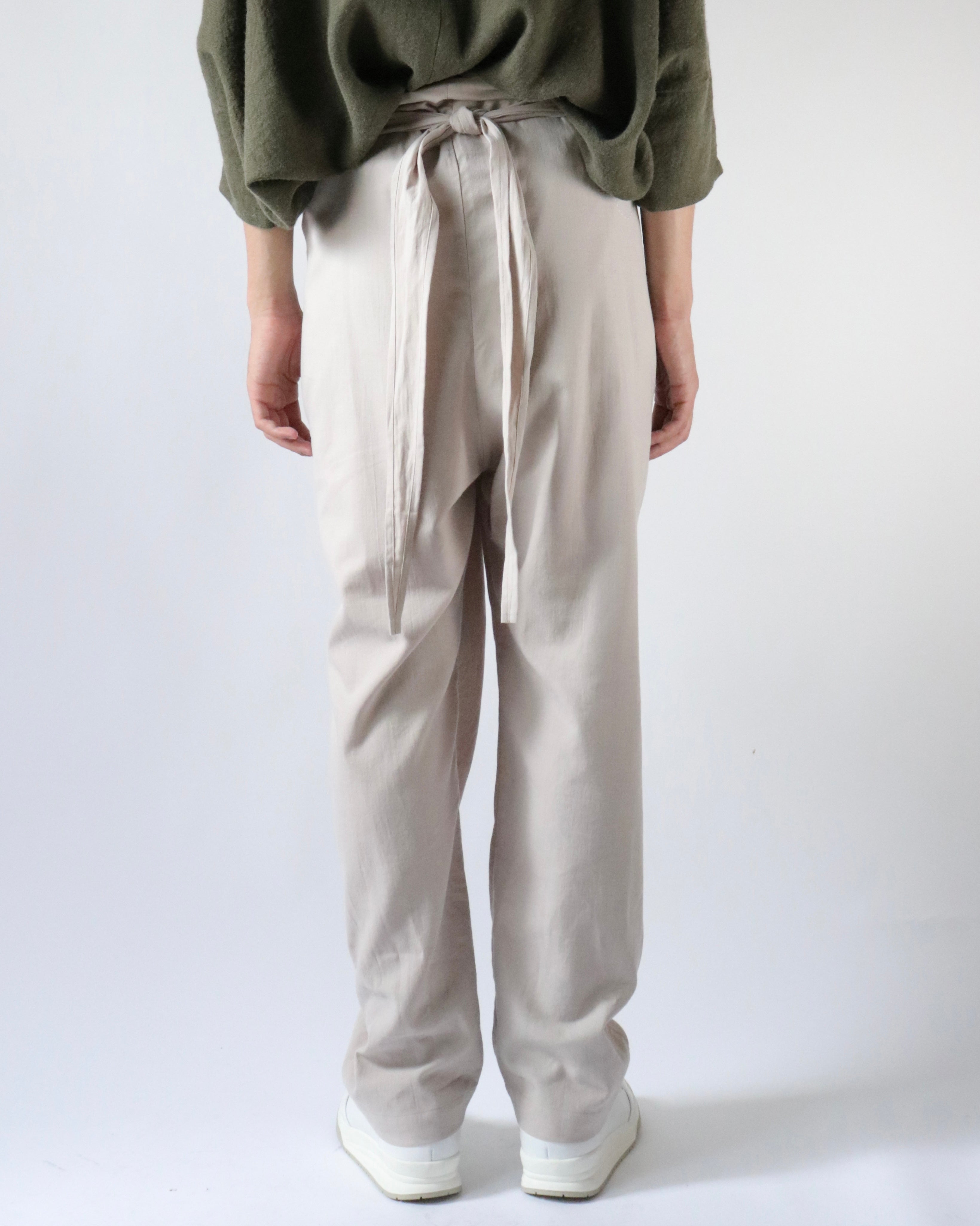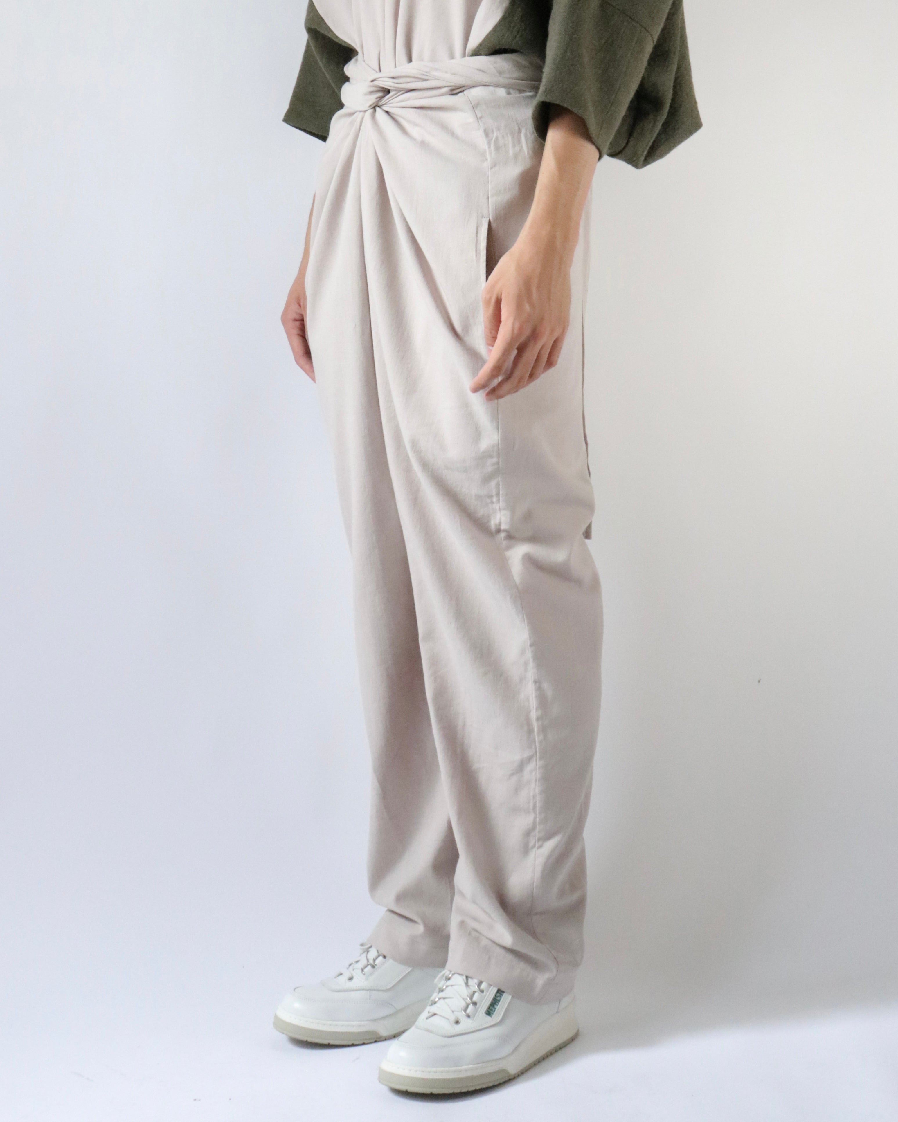 ジッパーやボタンなどを排したシームレスなドレープが美しいラップパンツ。コットンカシミヤのラップパンツは、肌触りが優しく暖かみのある風合いになります。結び方や折り方の違いで、多様な生地の動きを楽しんでいただけます。