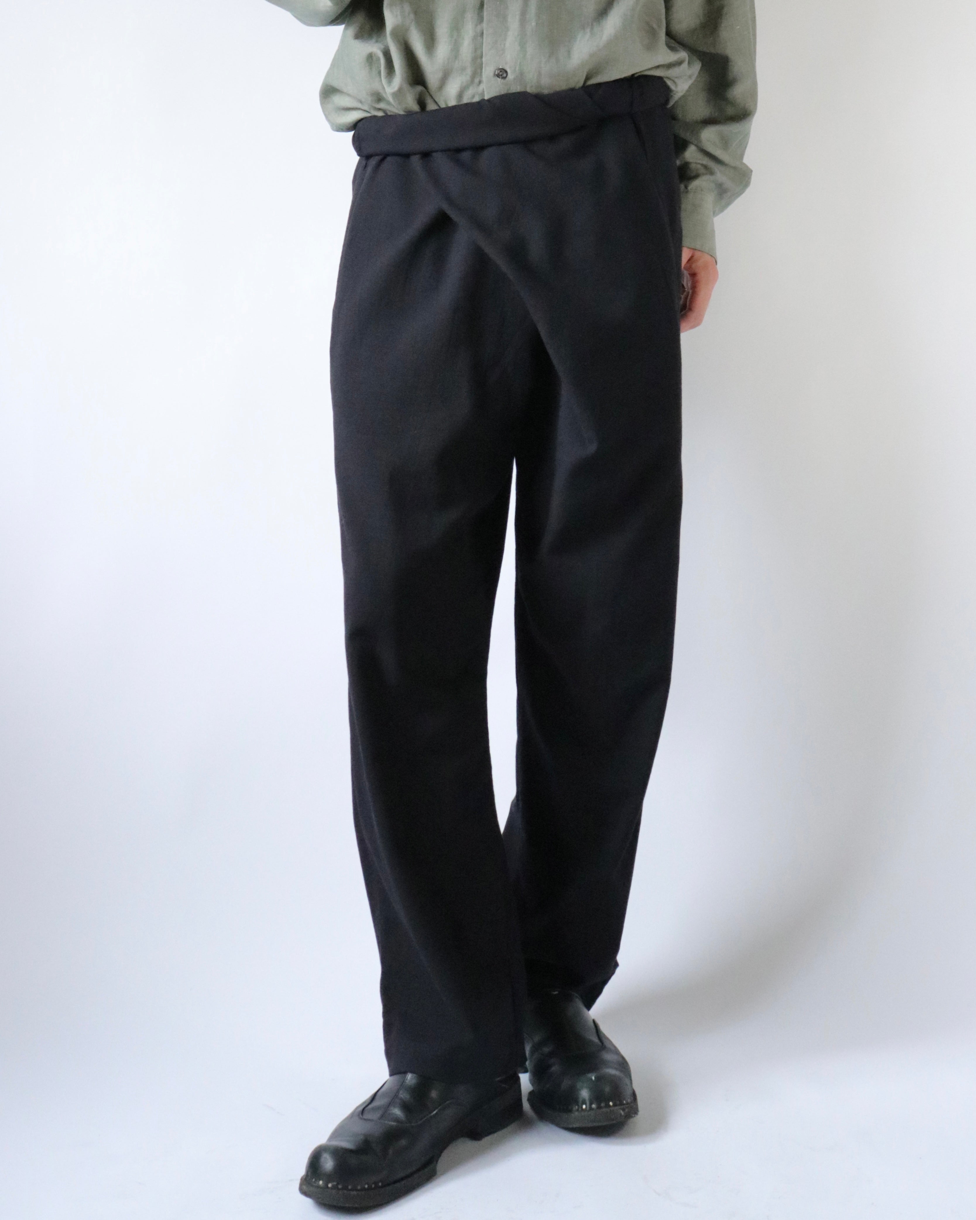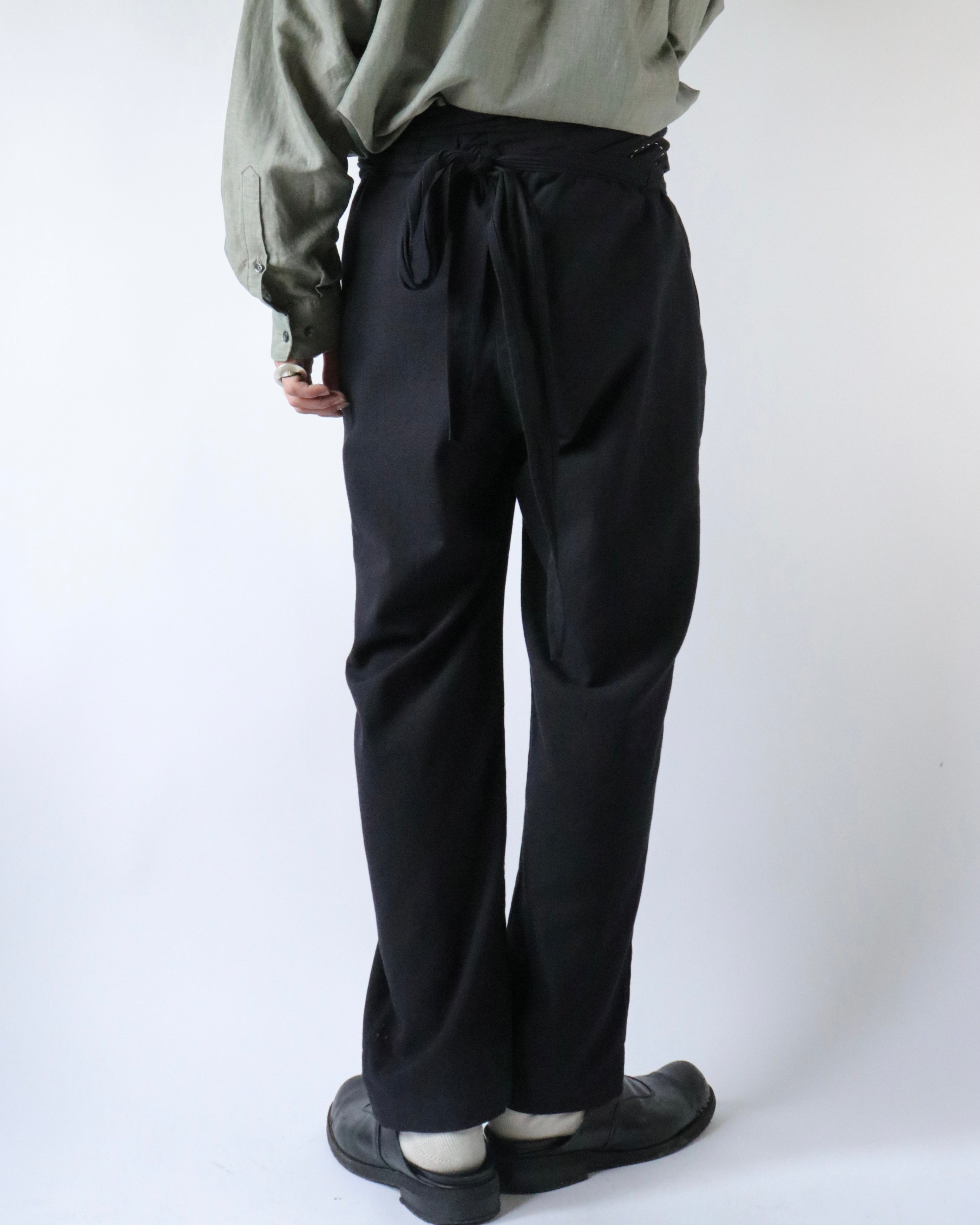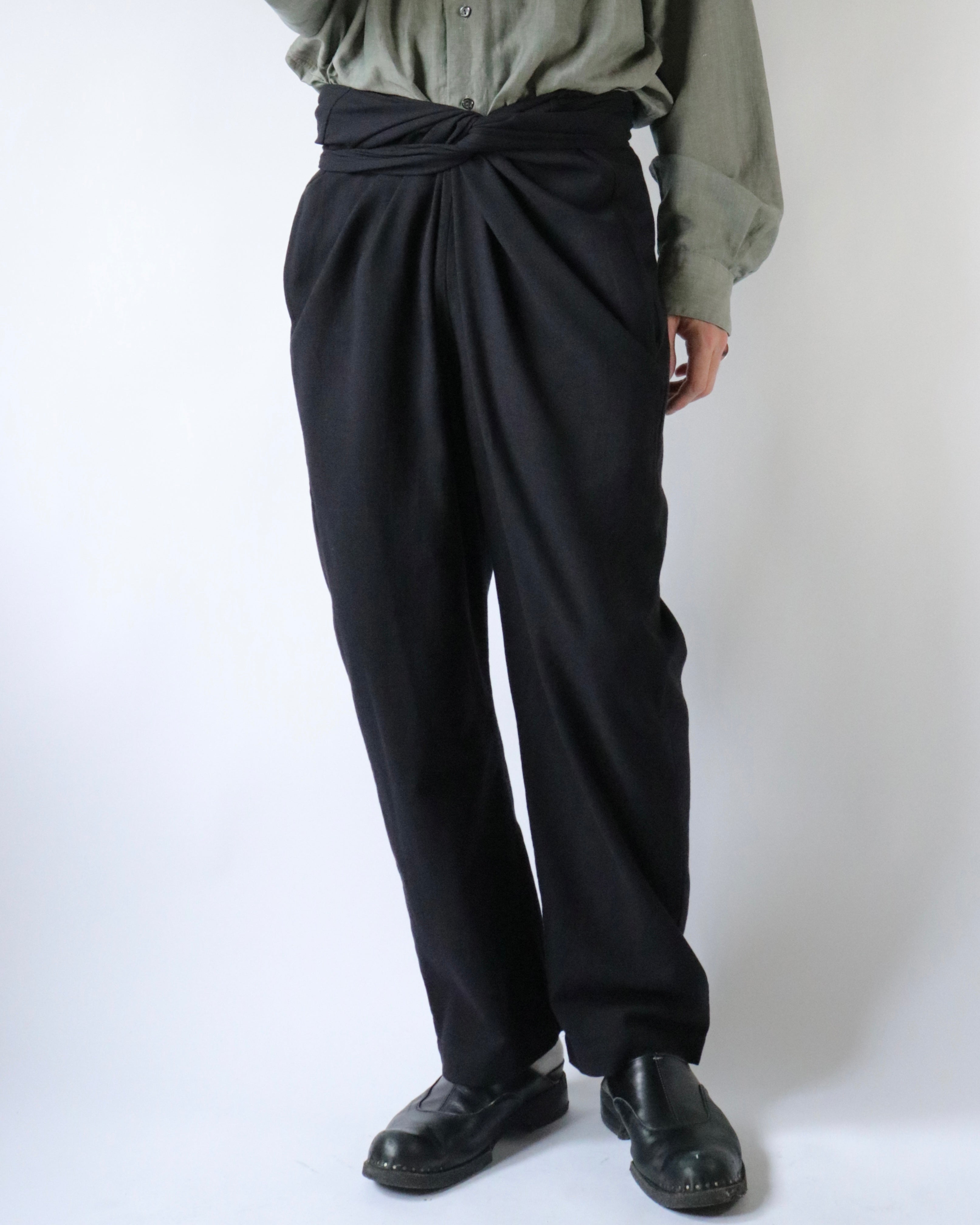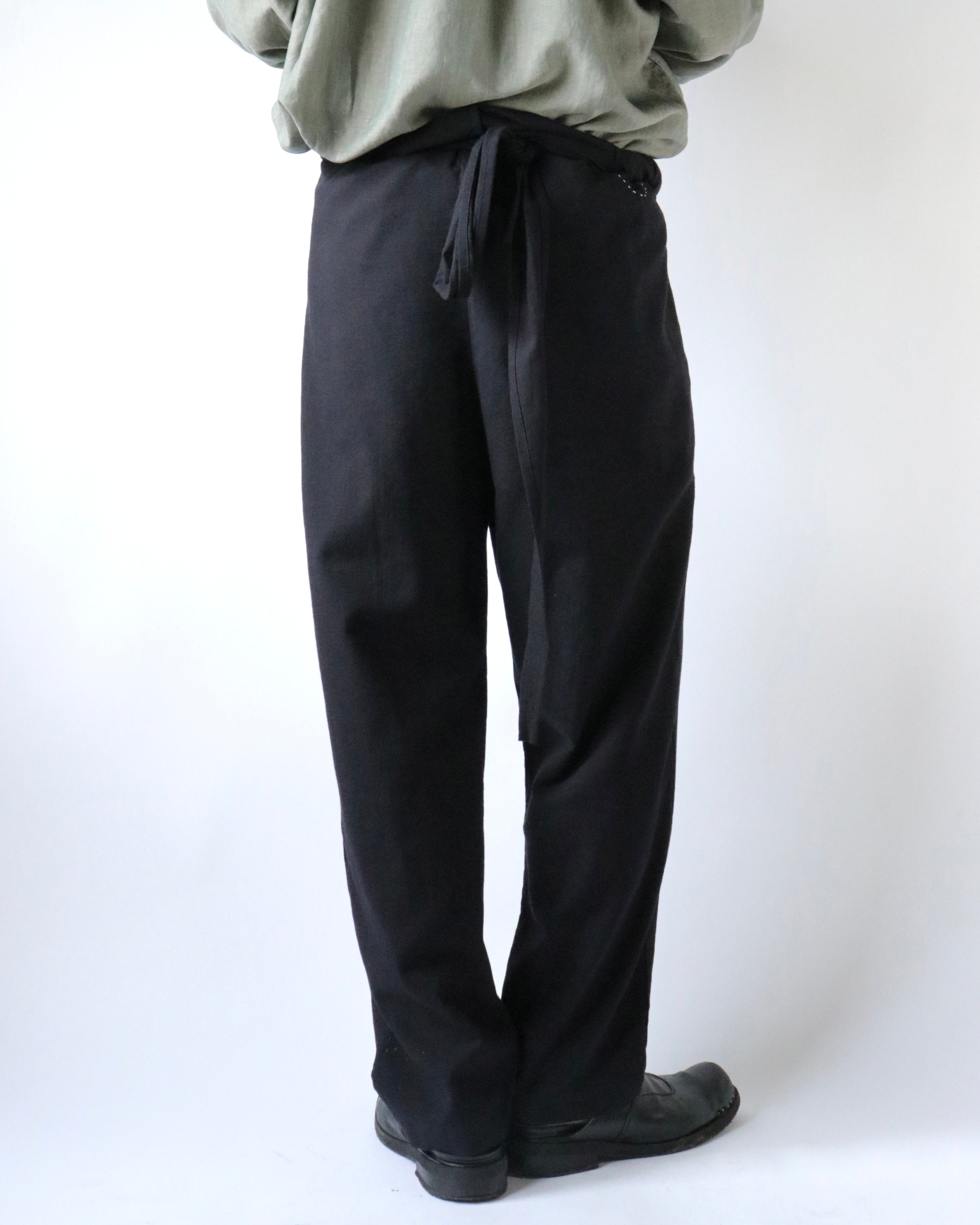 ジッパーやボタンなどを排したシームレスなドレープが美しいラップパンツ。コットンカシミヤのラップパンツは、肌触りが優しく暖かみのある風合いになります。結び方や折り方の違いで、多様な生地の動きを楽しんでいただけます。