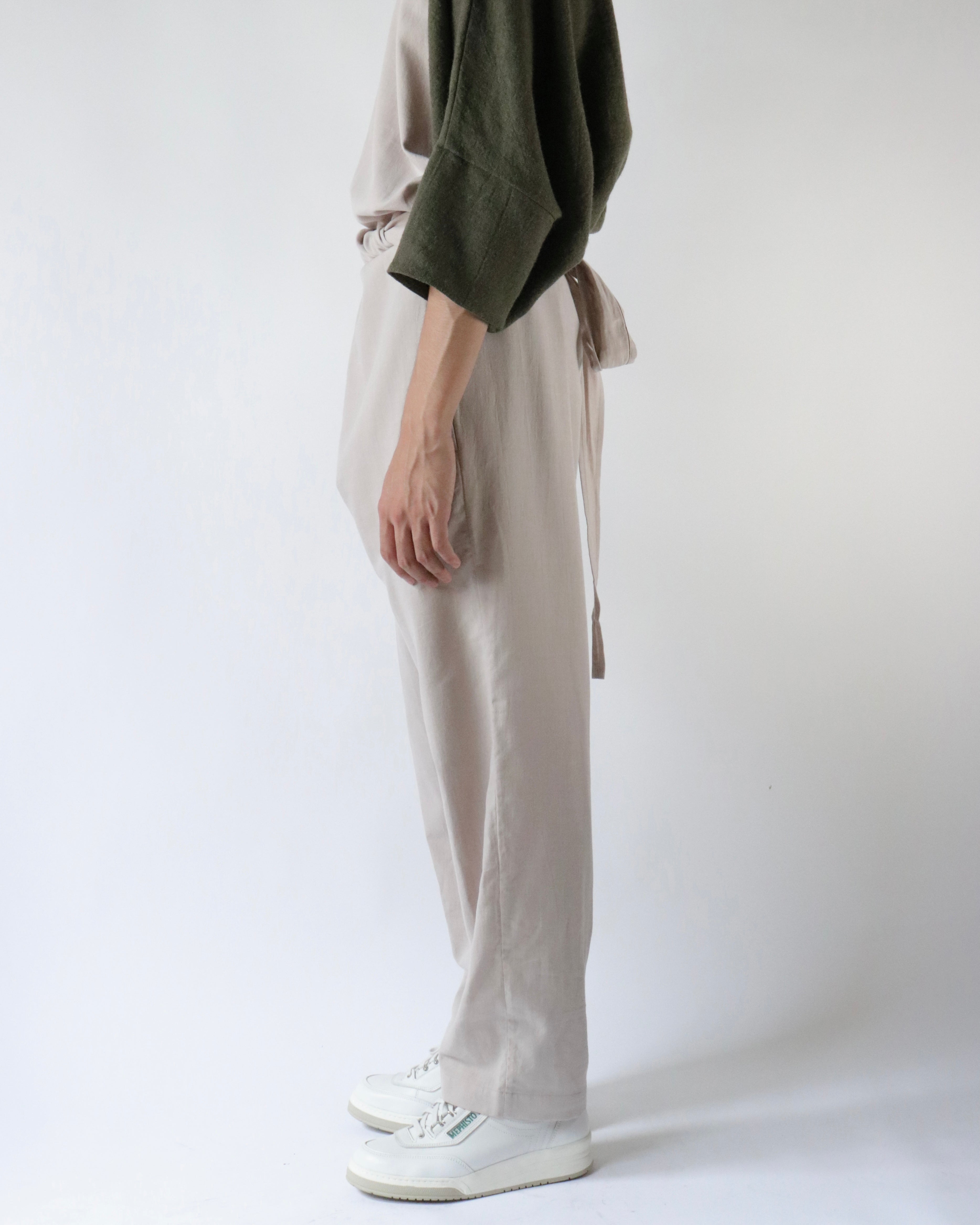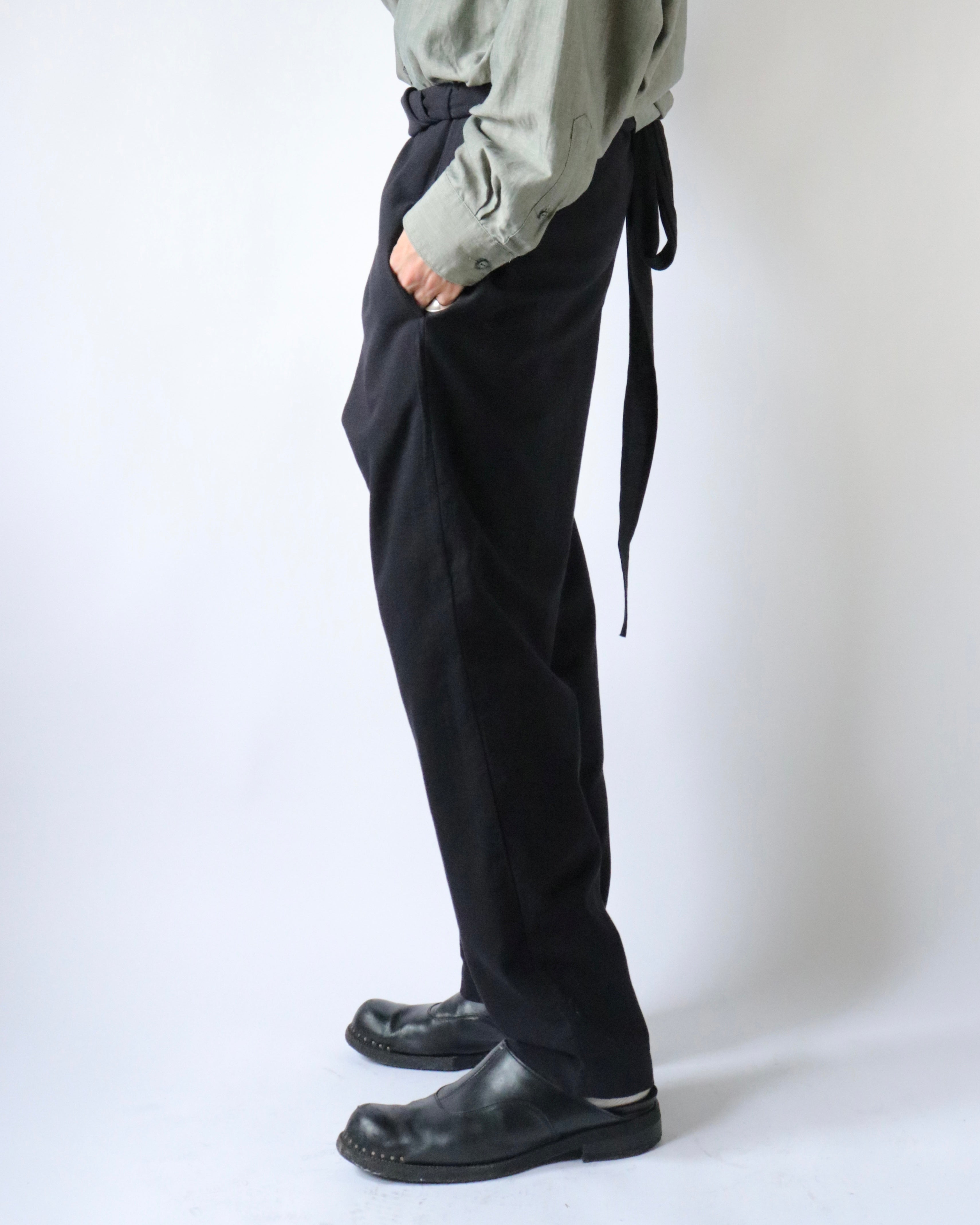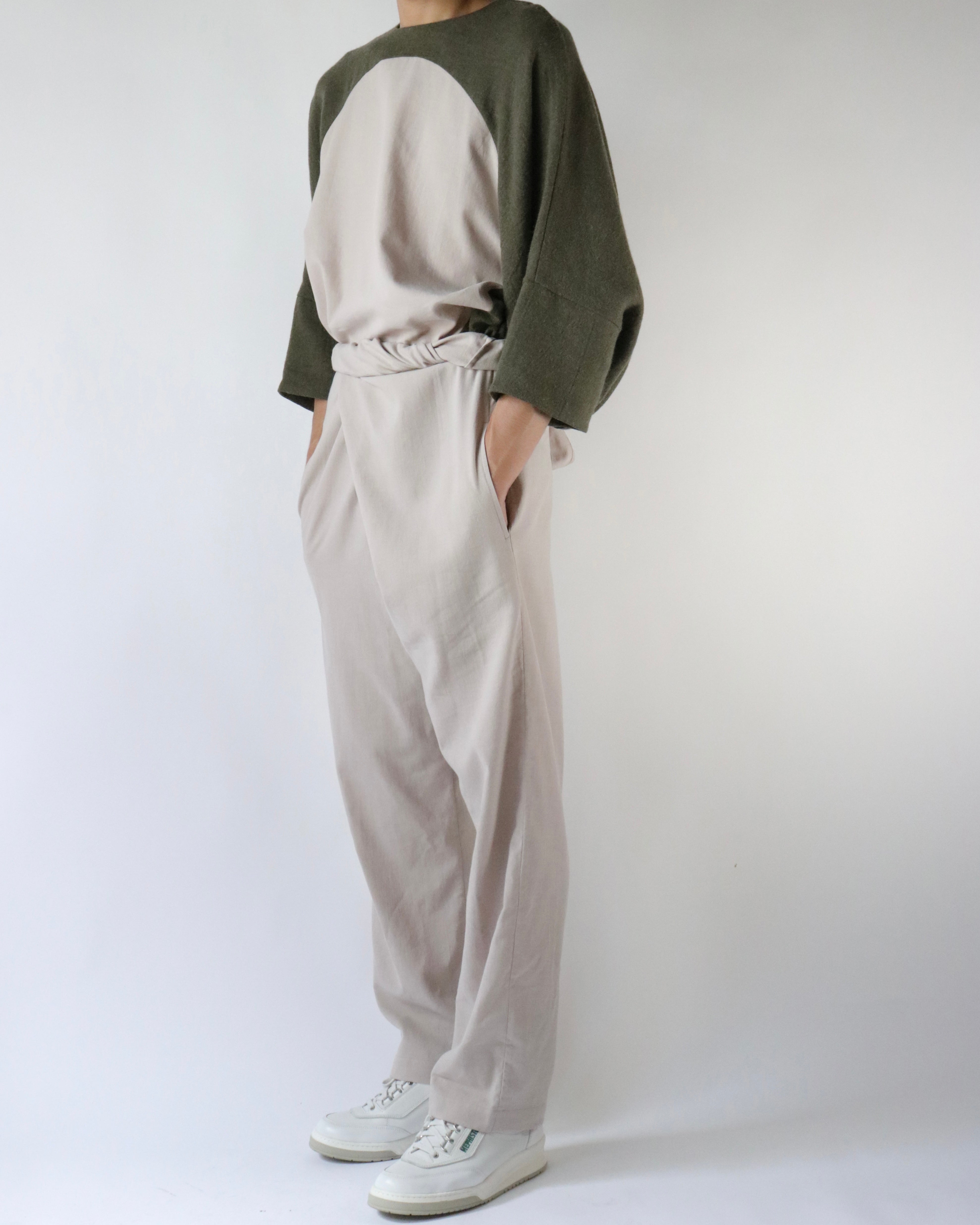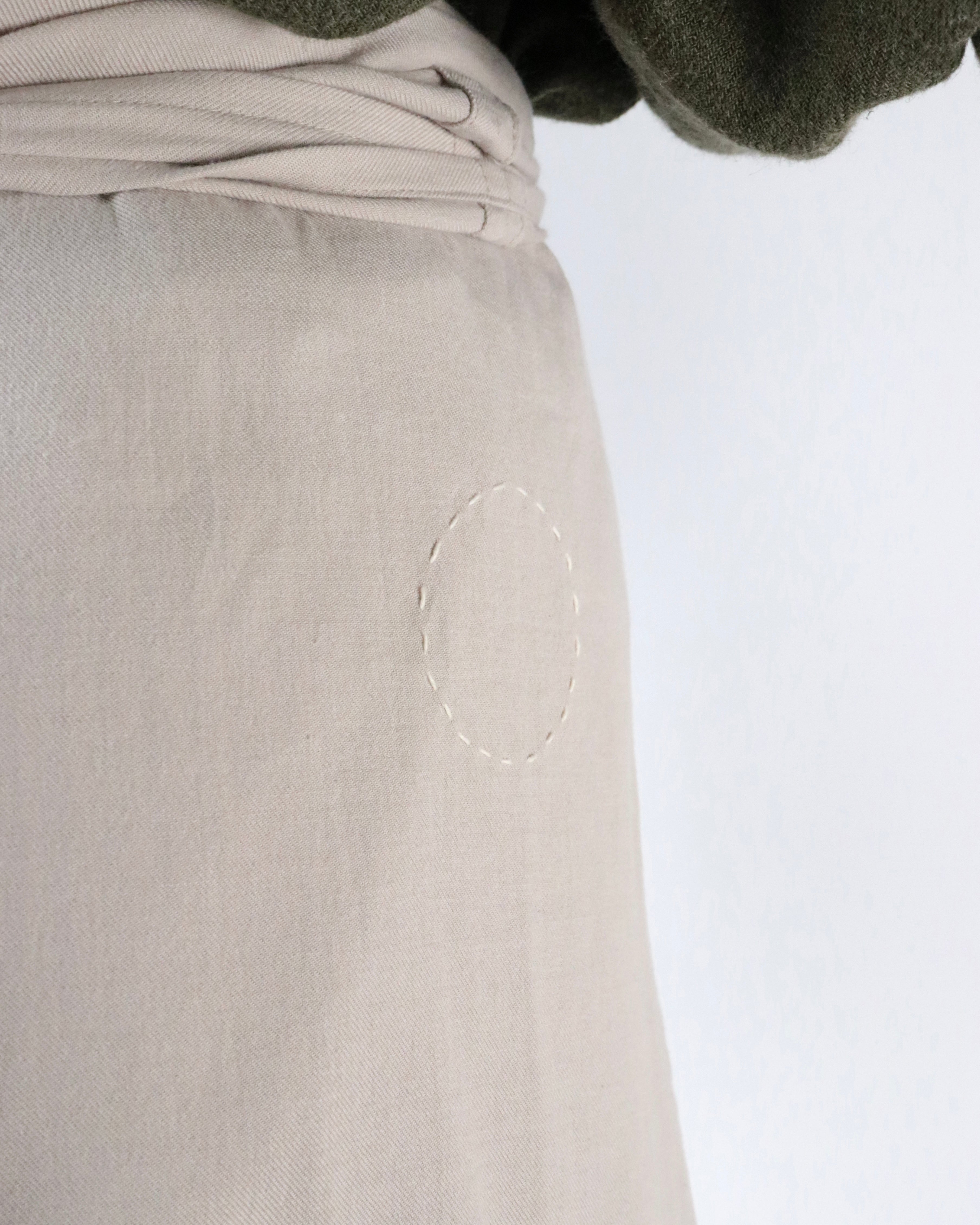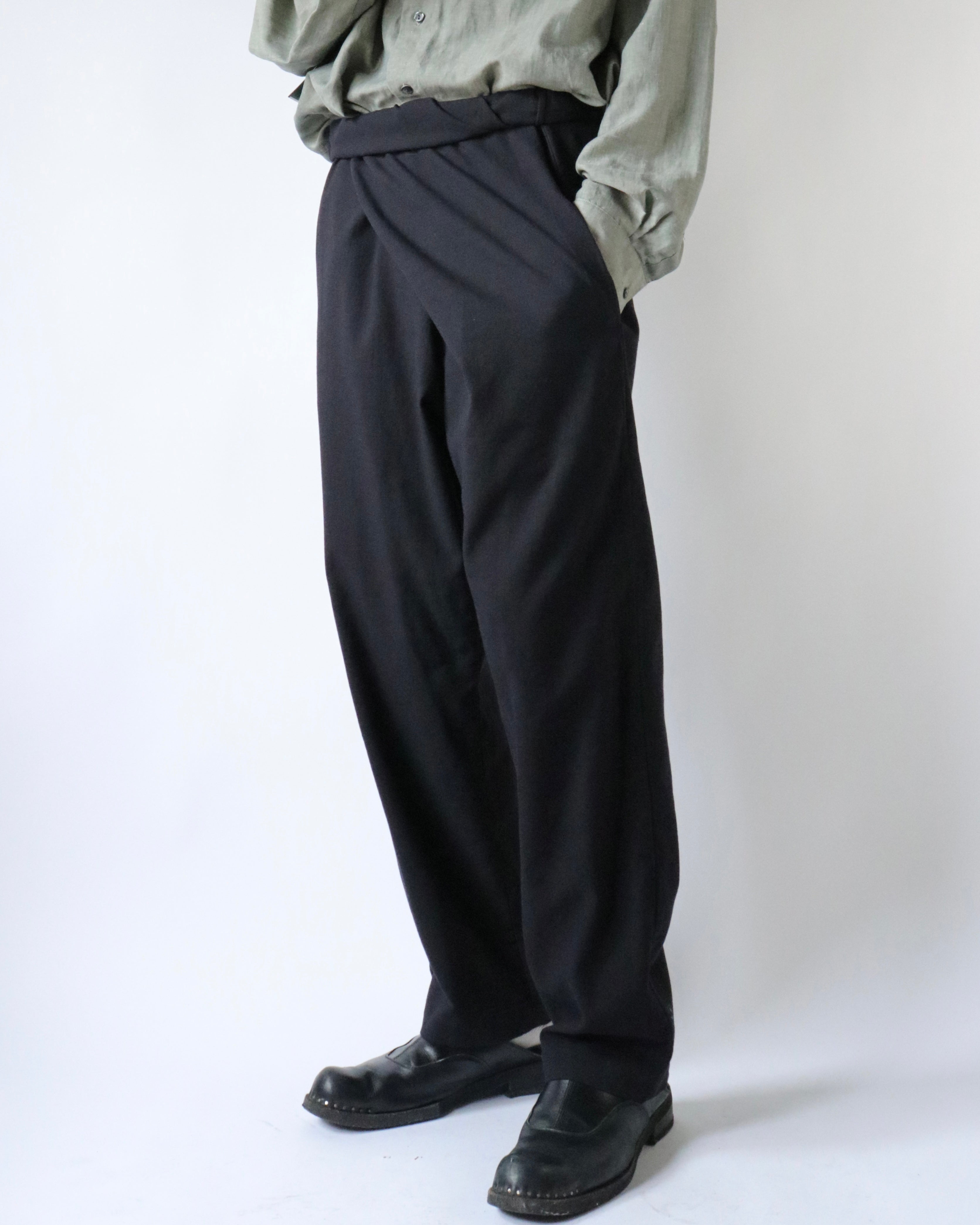 ジッパーやボタンなどを排したシームレスなドレープが美しいラップパンツ。コットンカシミヤのラップパンツは、肌触りが優しく暖かみのある風合いになります。結び方や折り方の違いで、多様な生地の動きを楽しんでいただけます。