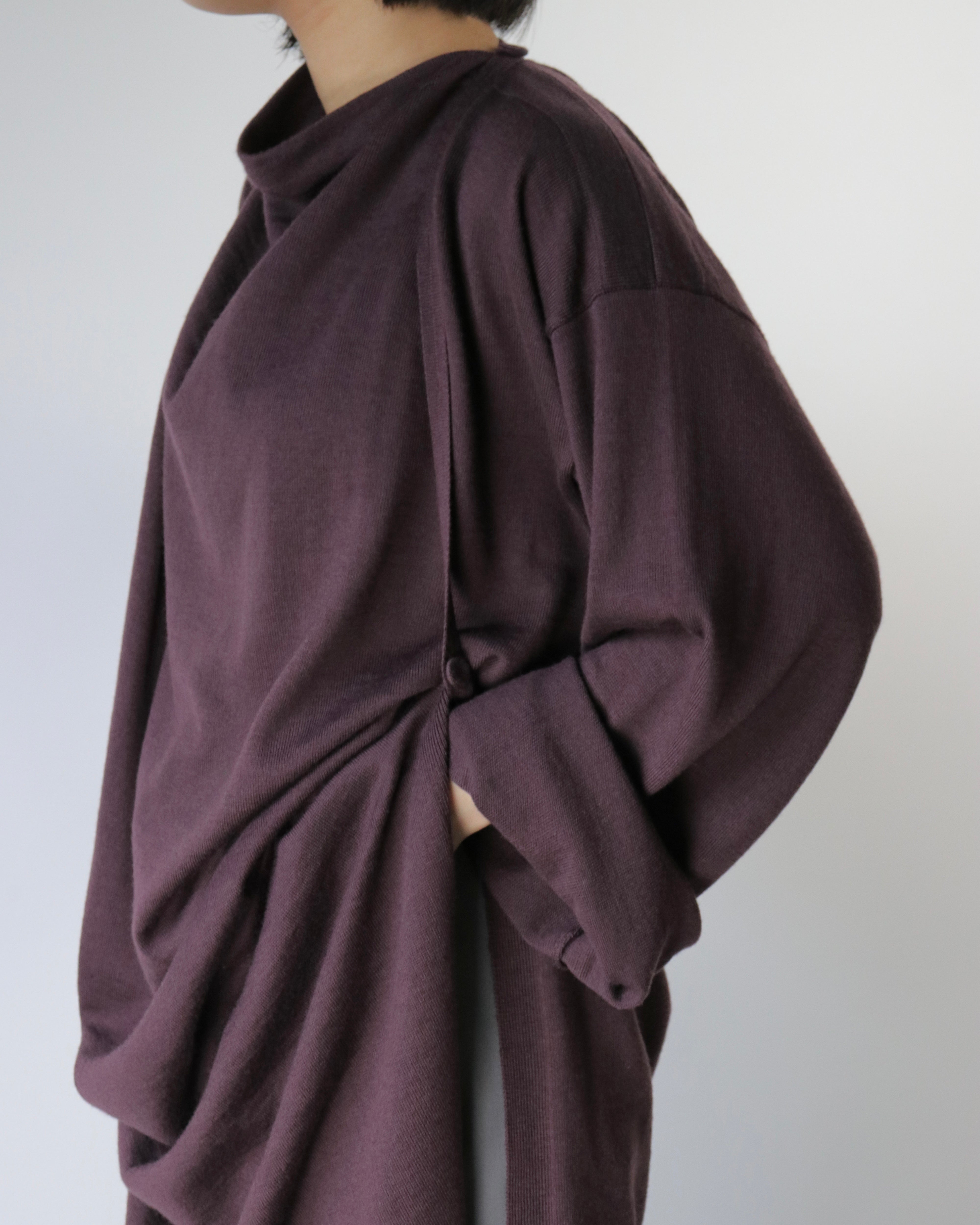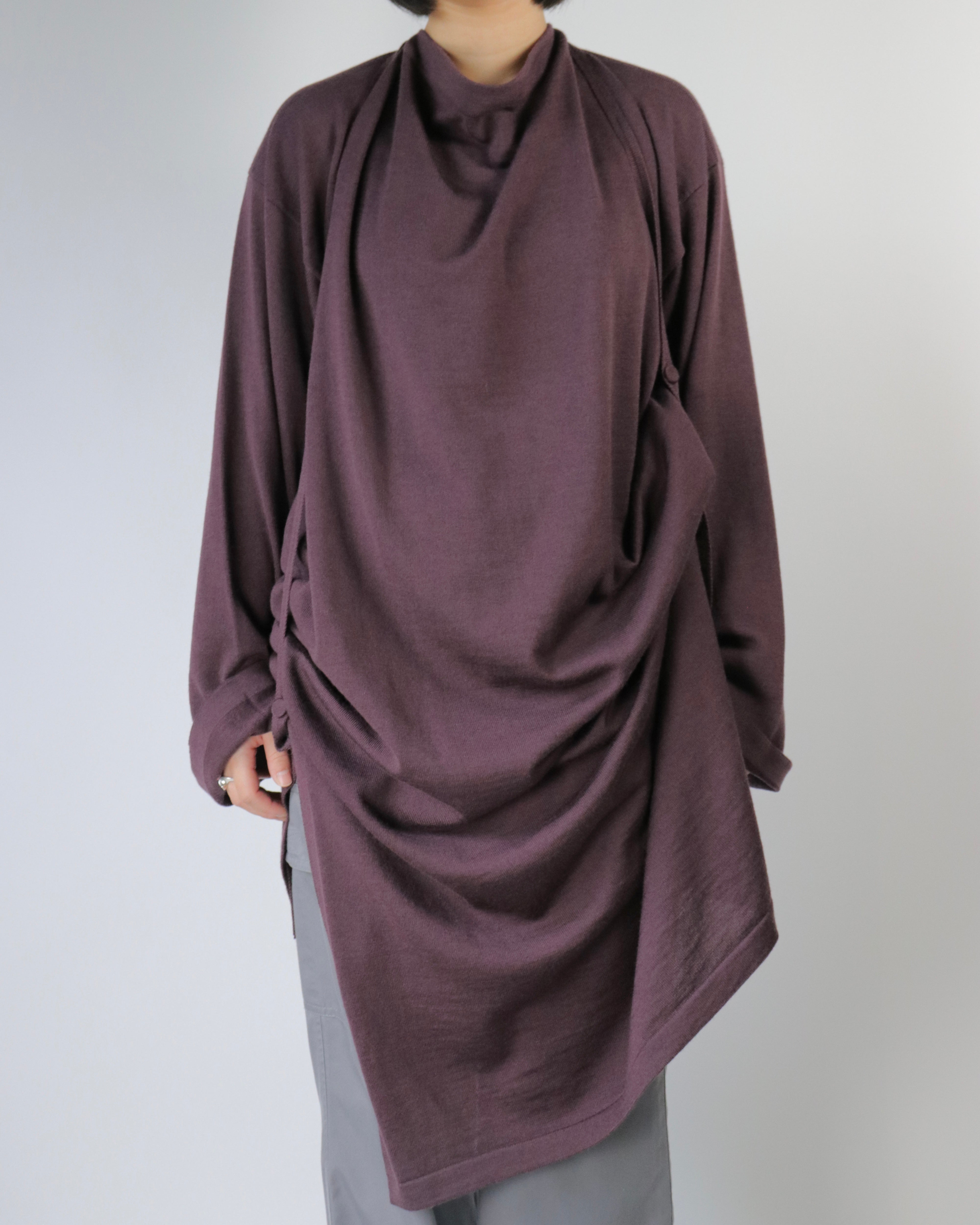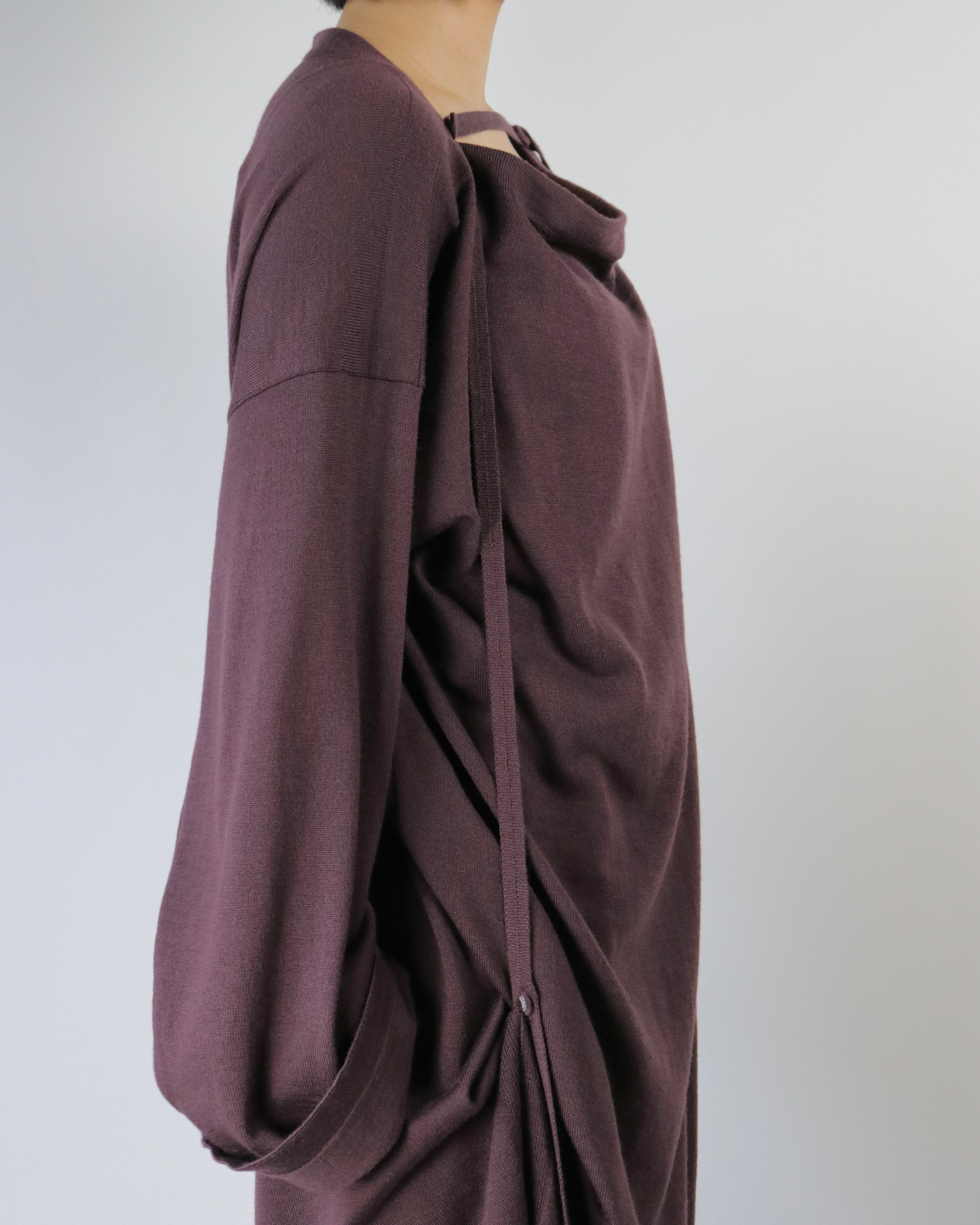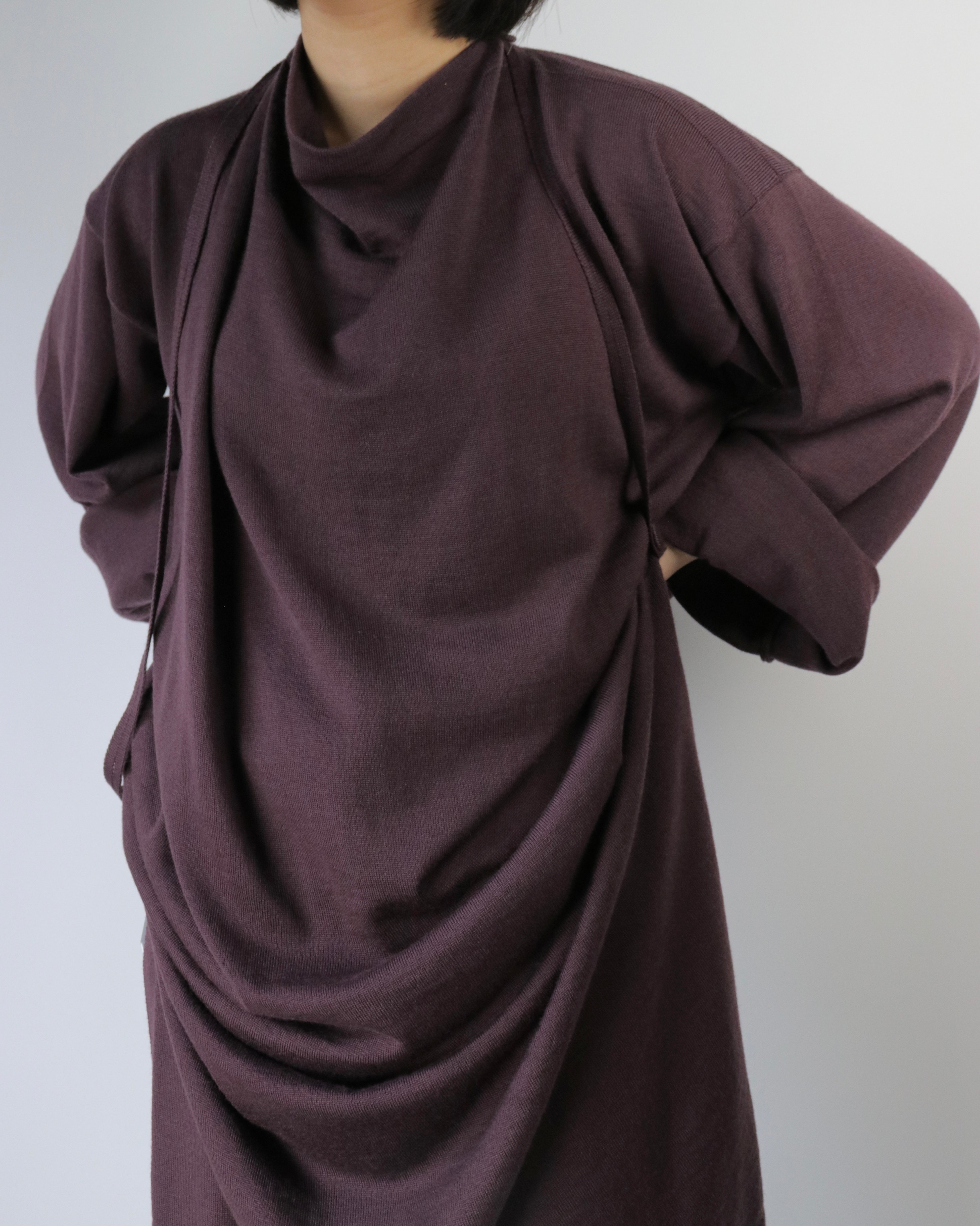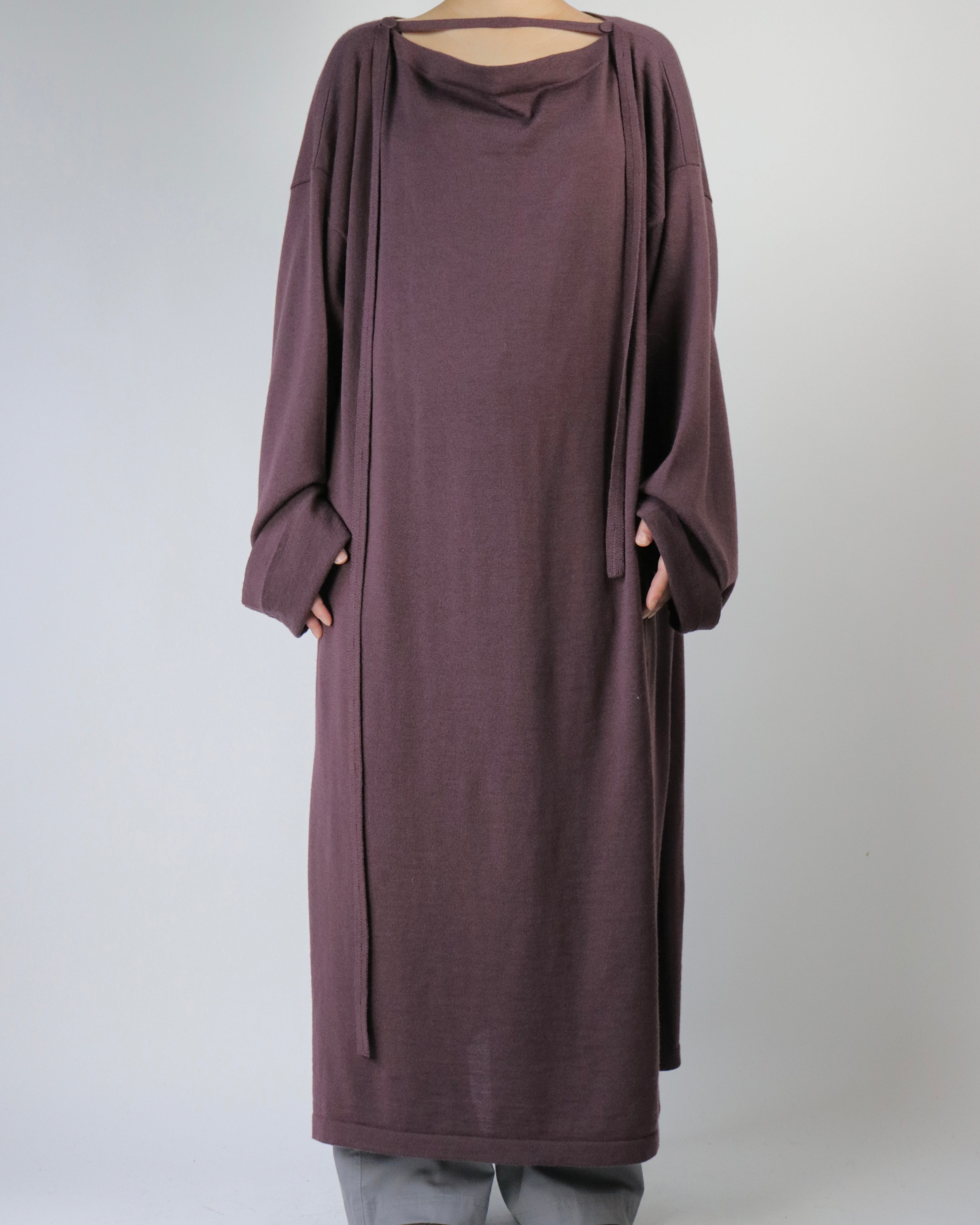 メリノ種のヴァージンウールのみを使ったドレープ感の心地いいニットドレス。共地のドローコードを使って自由にシルエットを変化させることができるので、何通りものスタイリングを楽しんでいただけます。