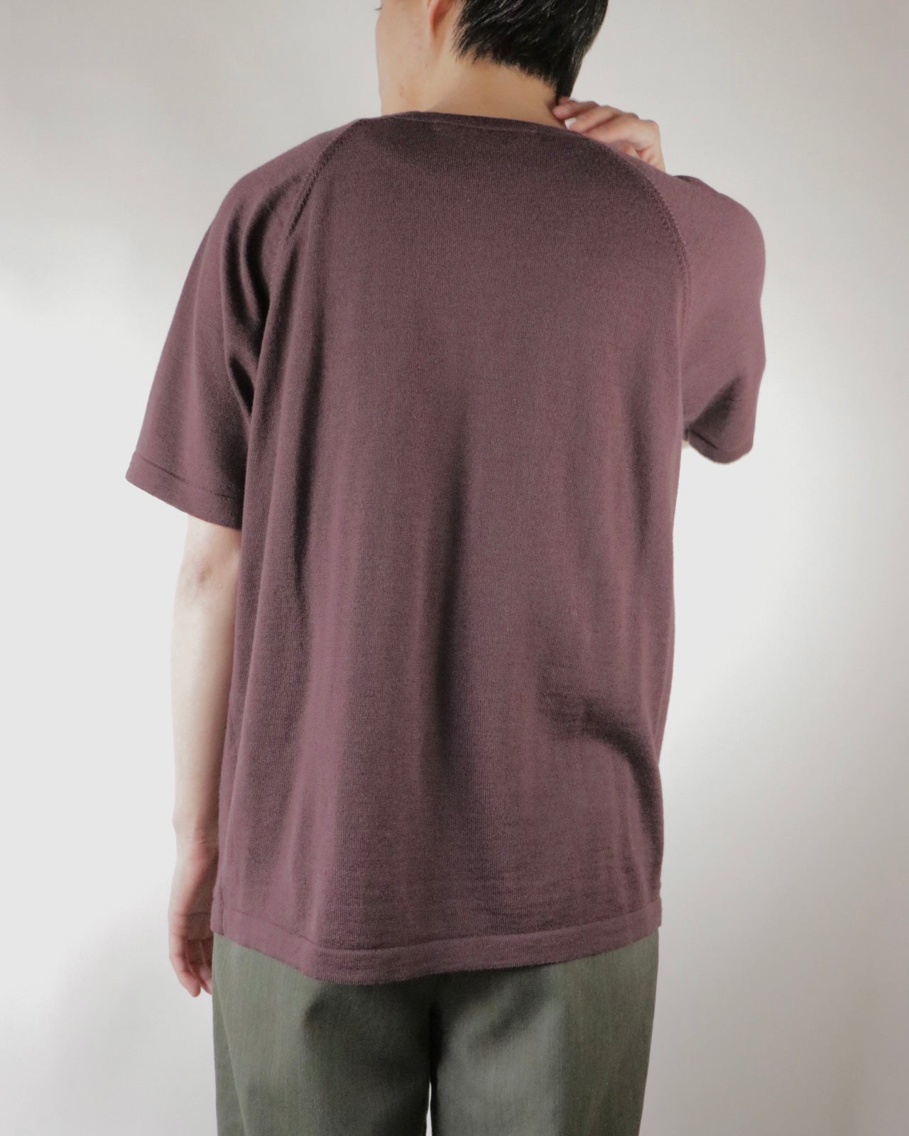 上品なE RTらしいカラーパレットから生まれたニットTシャツ。Kingdom 02のコレクションで発表された同型のアイテムを、ニューコレクションのカラーパレットで作ってもらいました。ヴァージンメリノウールを使用したドレープ感が心地よく、ニットであることを忘れてしまうような着心地です。