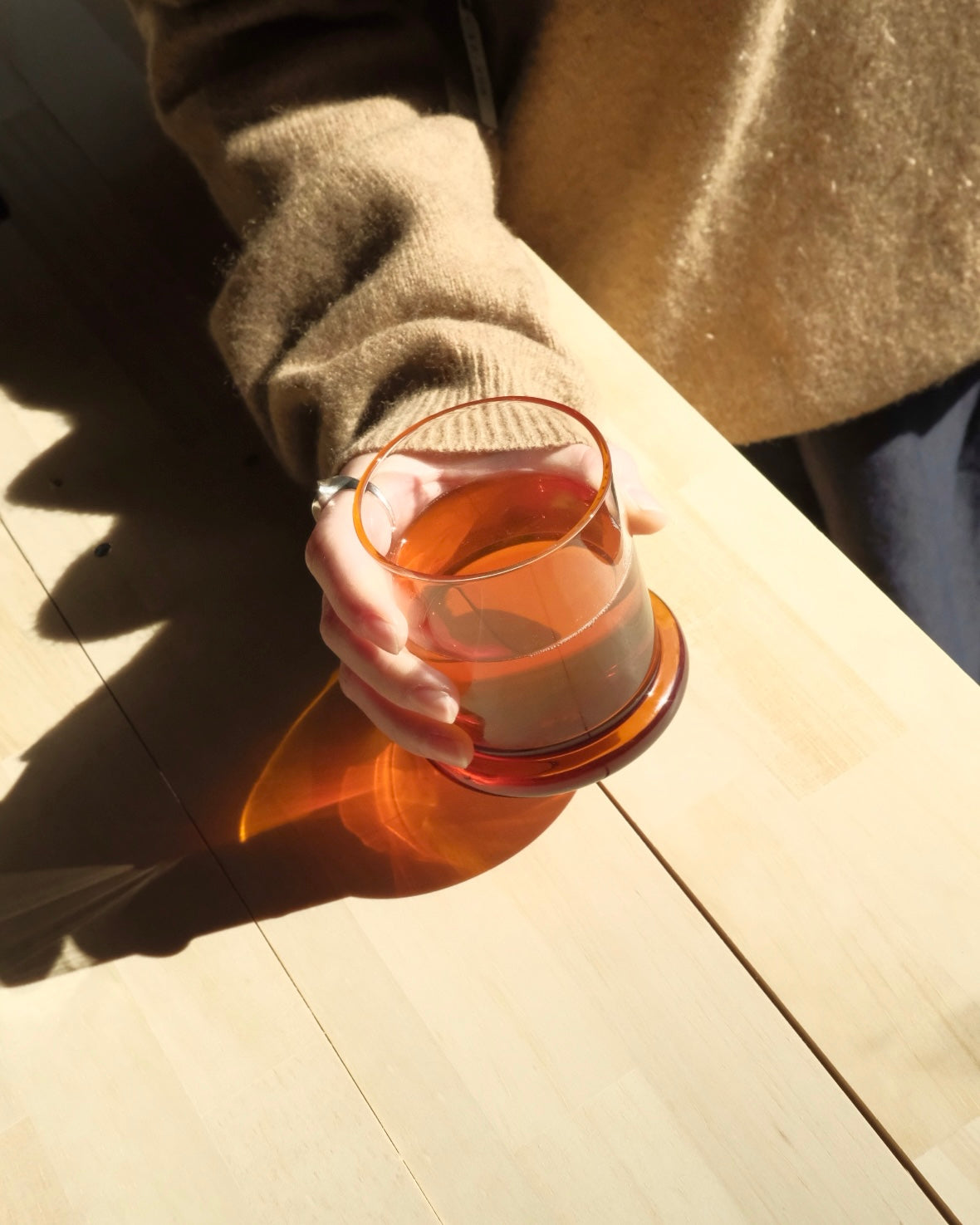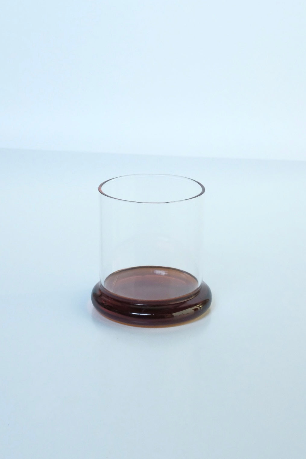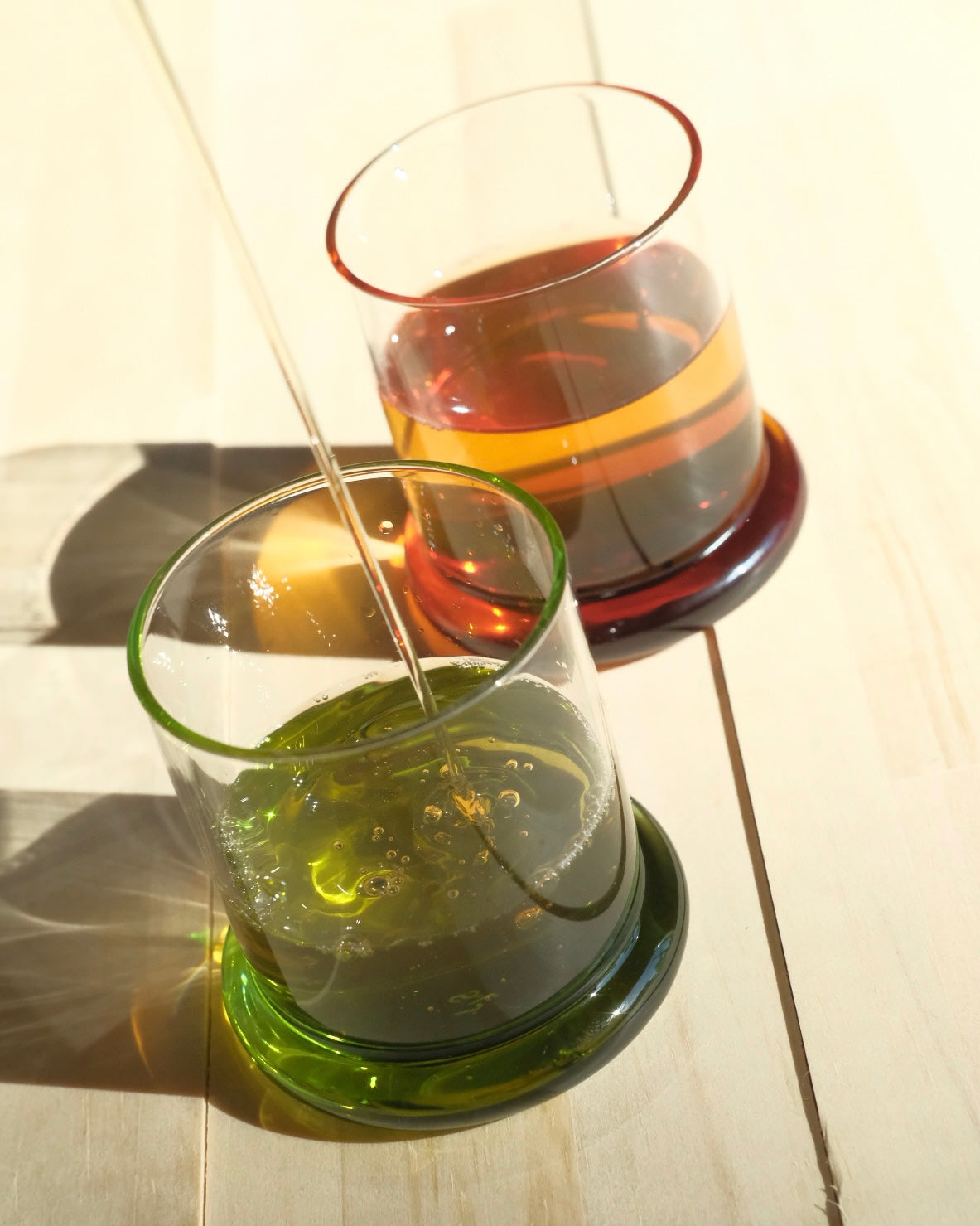 ガラスを高温で加熱し、液体状に変化させた溶融状態に対する共通の価値観に触発され、コラボレーションして制作された作品です。美しい円柱のグラスに、ぽってりとした円盤状の重厚なガラスとの組み合わせが、上品で静寂さがあり、目を惹きつけられる不思議な魅力を感じます。