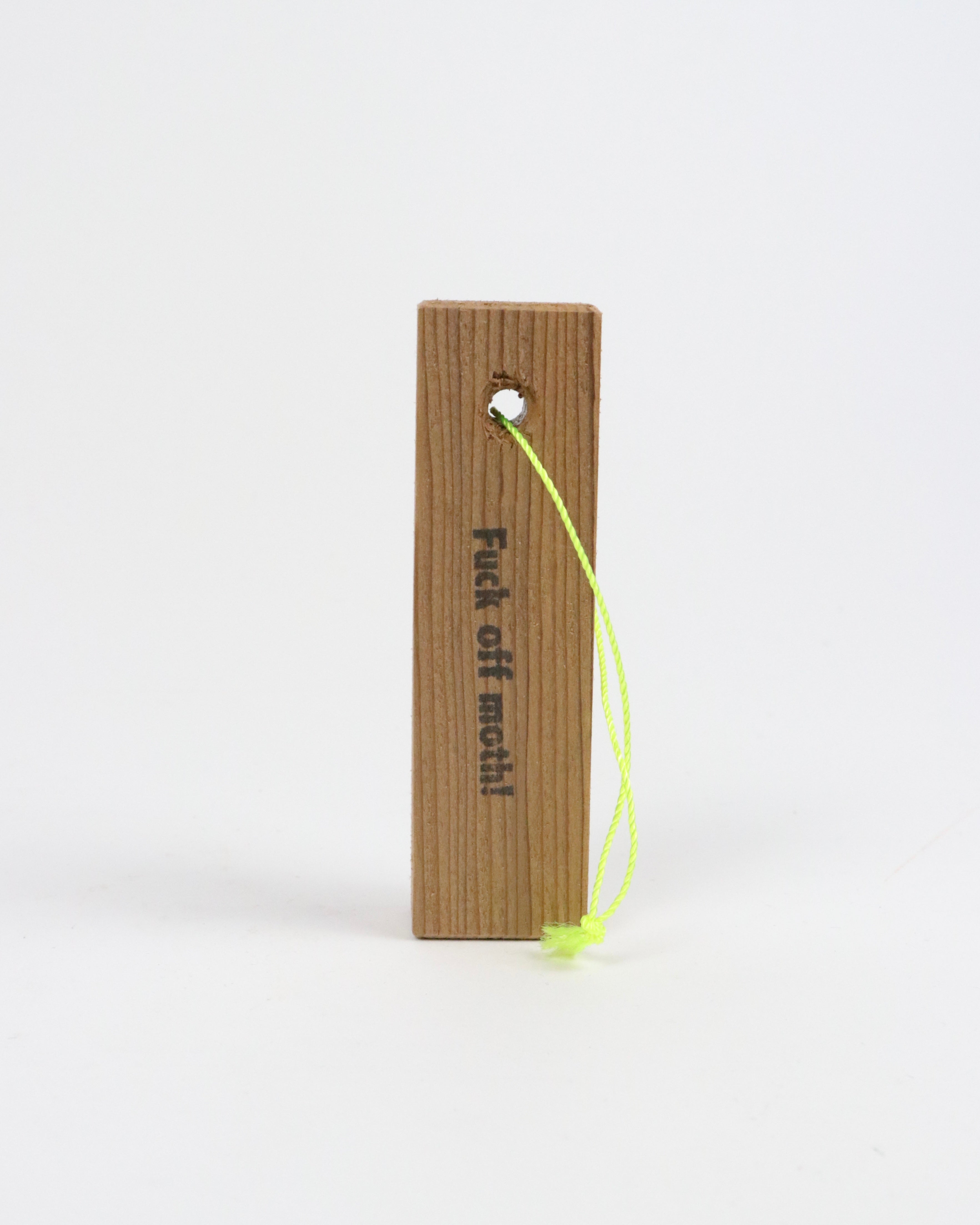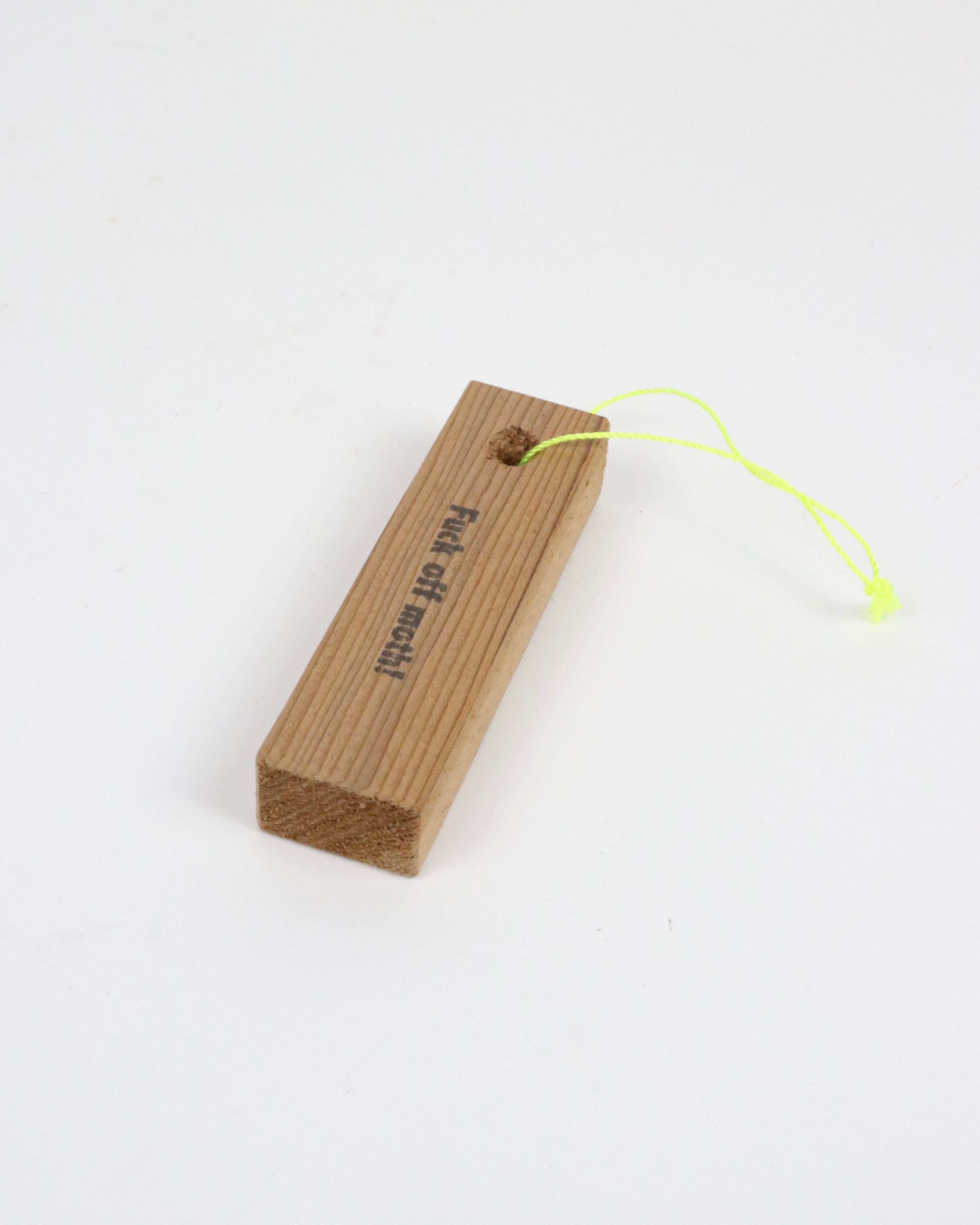 レバノンの杉を使用した防虫剤。オフカットで制作された木材には"Fuck off moth!" "Ceder of Lebbanon"が印字されています。ニットの側に置いてみましょう。