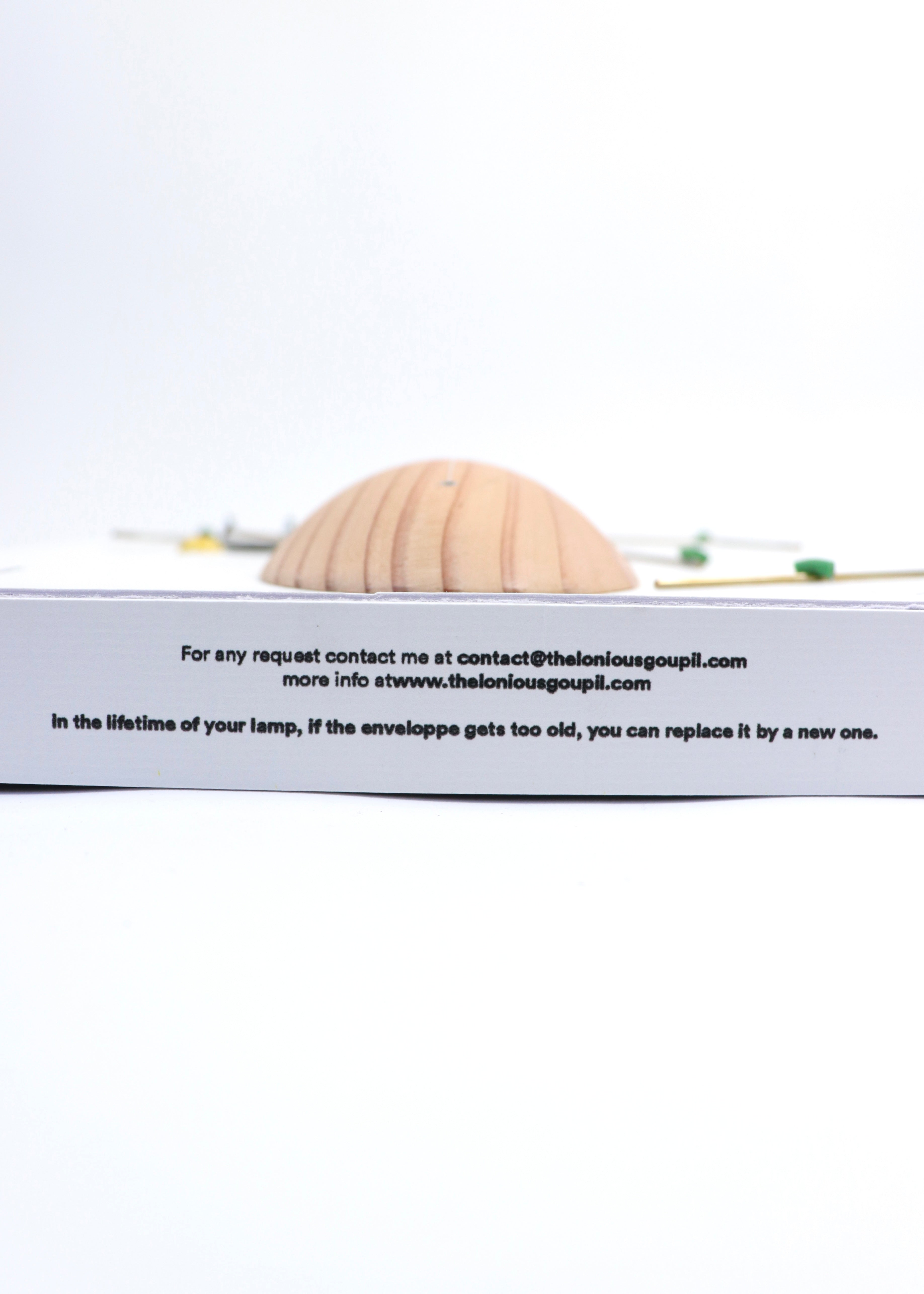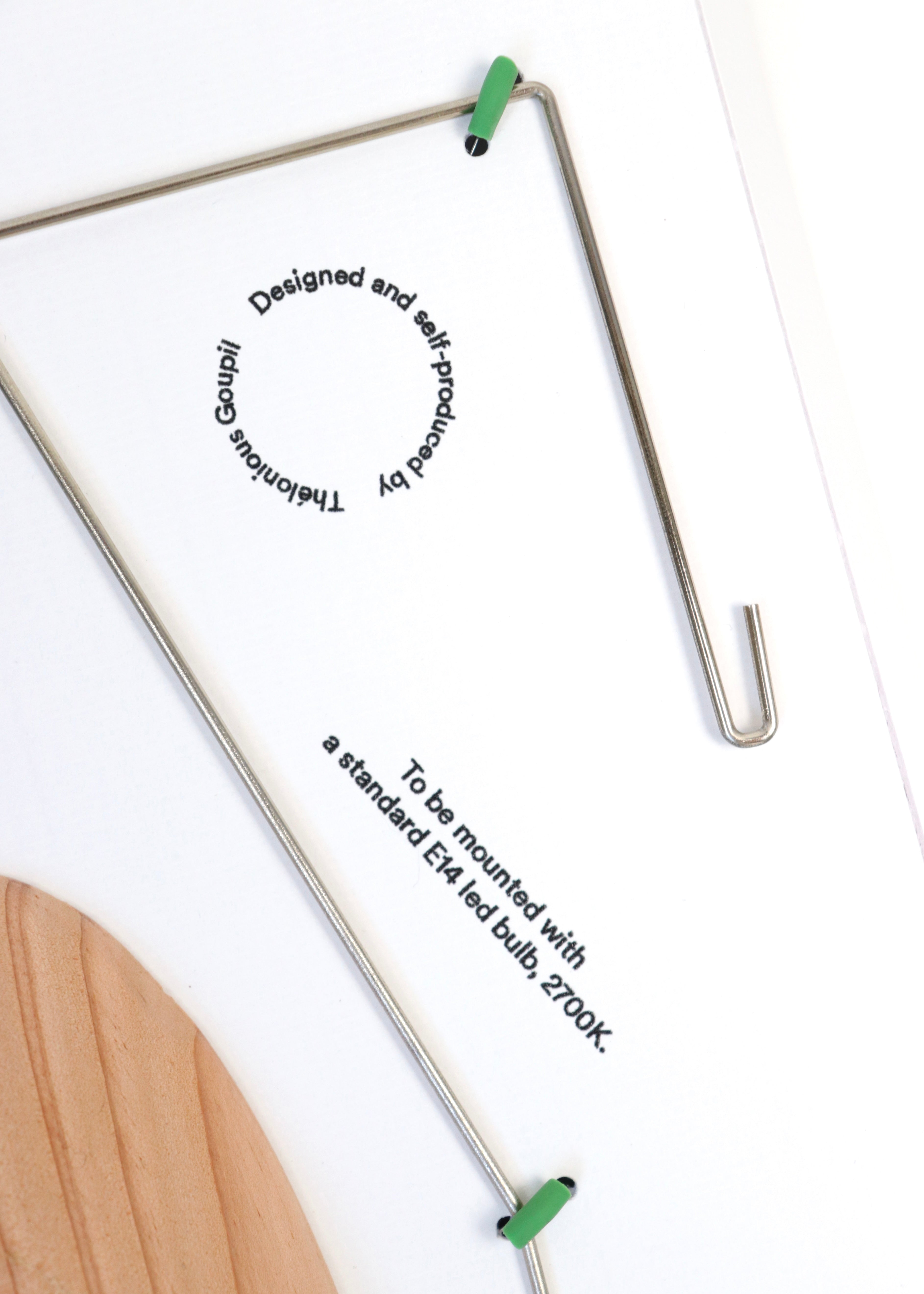 針葉樹を使用したスタンドはスクラップウッド(端材)を使用し、廃棄物を減らす方法で制作しております。また手動式のワイヤーベンダーで制作されたニッケルシルバーなど、テロニウスのセルフプロデュースで制作されています。地域に根ざしたヴァナキュラーな制作方式を大事にするテロニウスは、この制作をするに辺り、周囲の友人や職人へ封筒を送り、彼らに封筒をシェードとして様々なスタディを制作したうえで、アップデートされたのが本作になります。