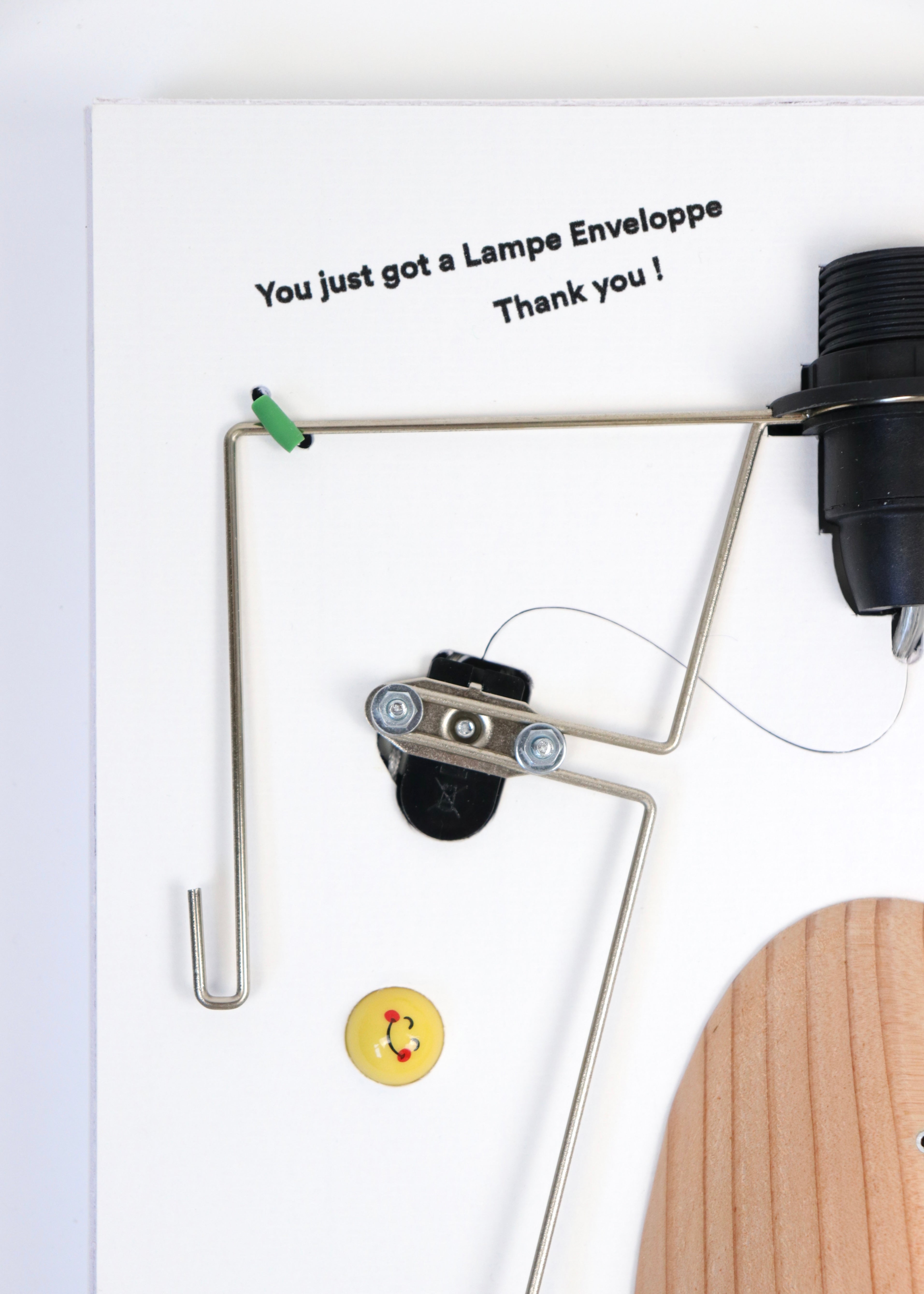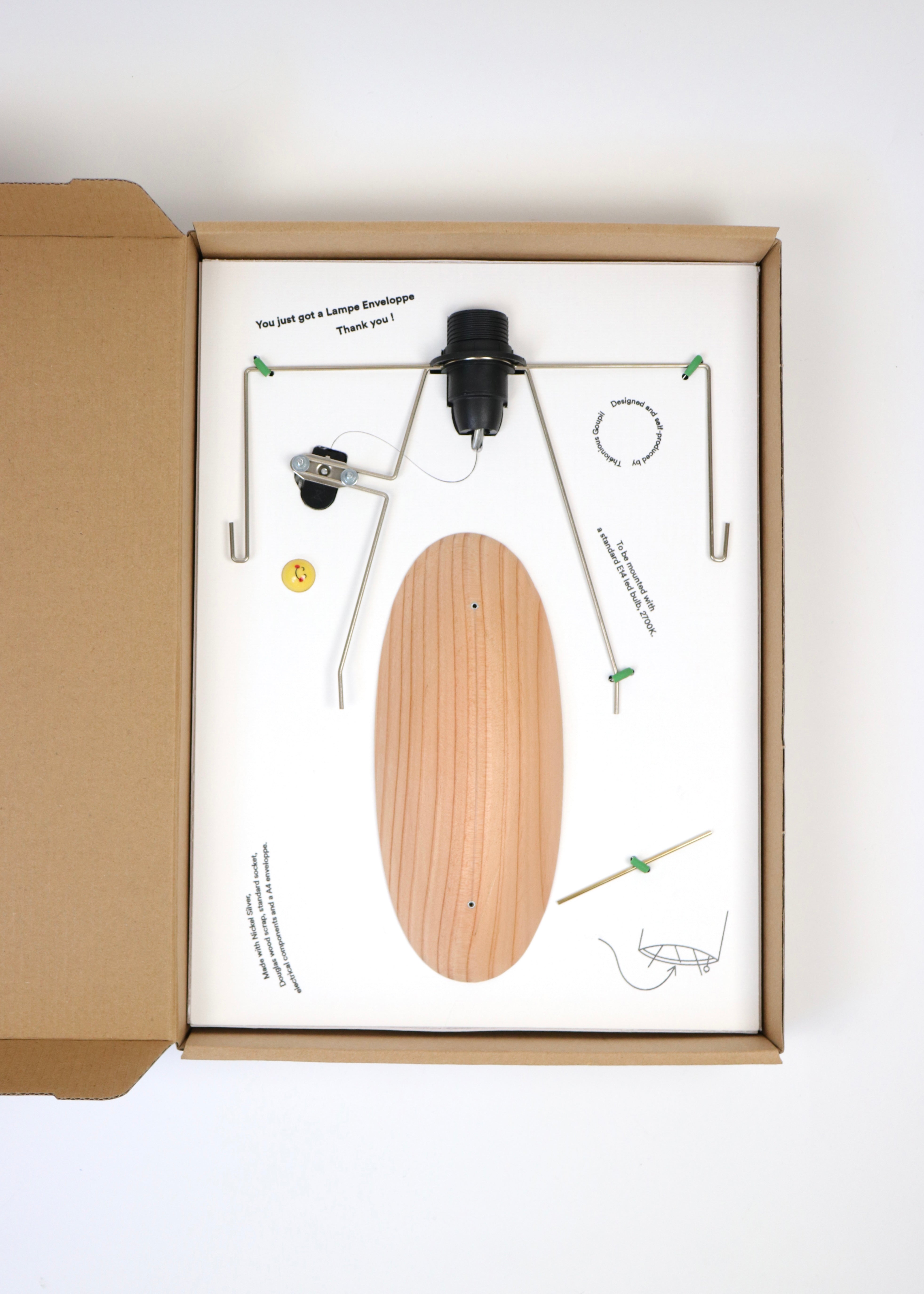 名前の通り、封筒をシェードにあしらったランプは、子供が遊ぶ組立キットのように、購入者が自らスタンドとソケット部分を組み立て、最後に封筒のシェードを装着することで出来上がるランプ。組み立て工程を購入者自らが行うことで、内部の可視化また制作のプロセスを垣間見る手段として、デザインの一連の流れを理解する試みとして制作されました。