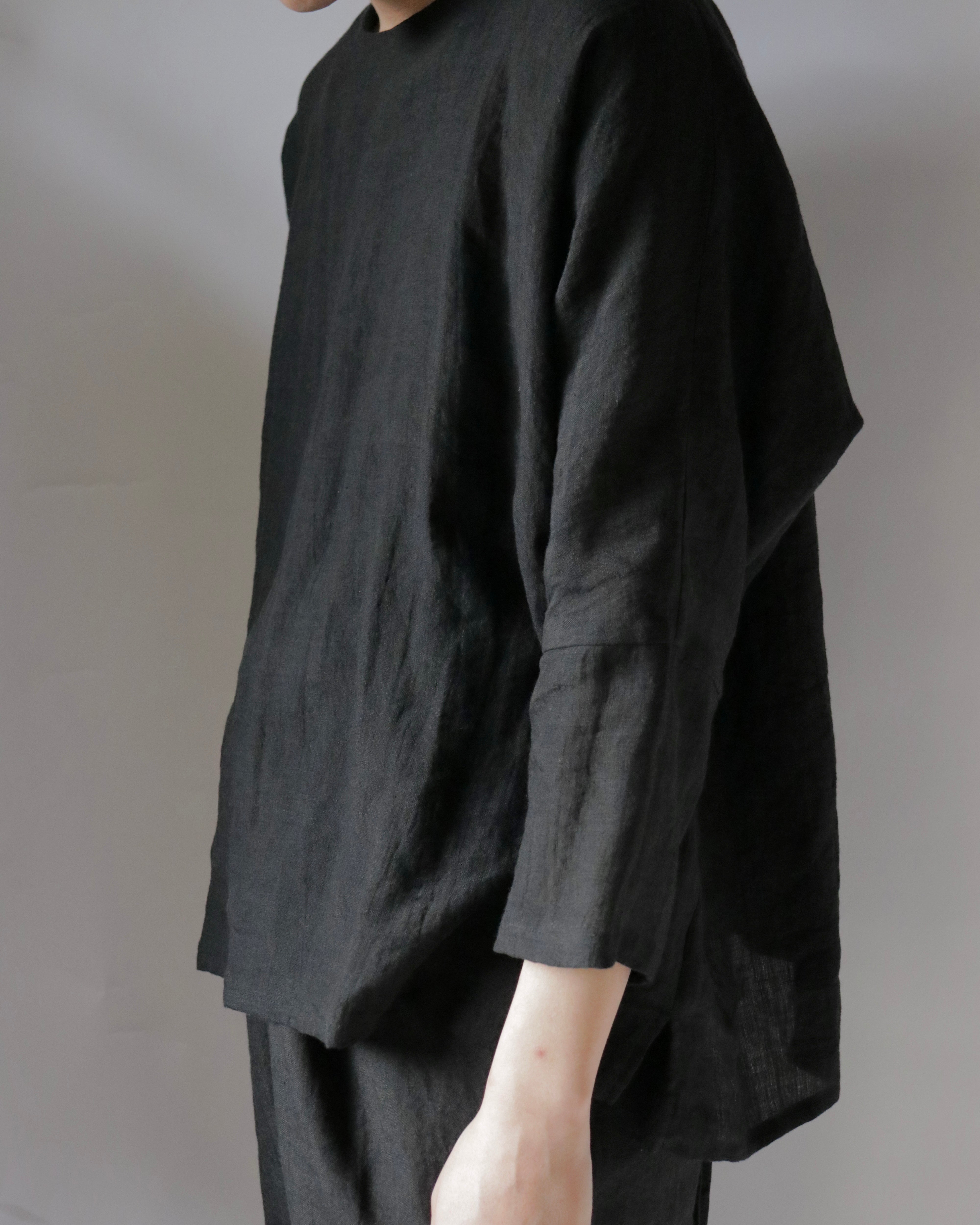 着心地の優れたミニマルなドルマンスリーブシャツ。ハリのあるリネンシーチングの質感とプルオーバーの着やすさが魅力的です。どこかオリエンタルな雰囲気の漂うCOSMIC WONDERらしいアイテムです。