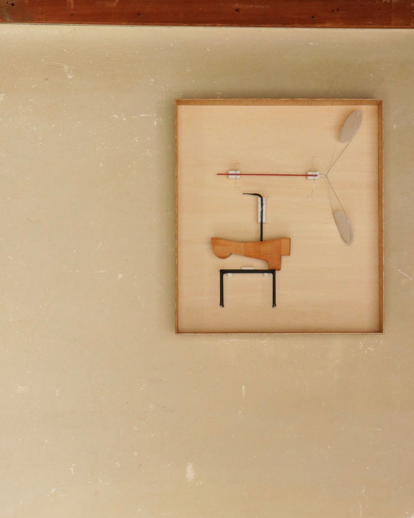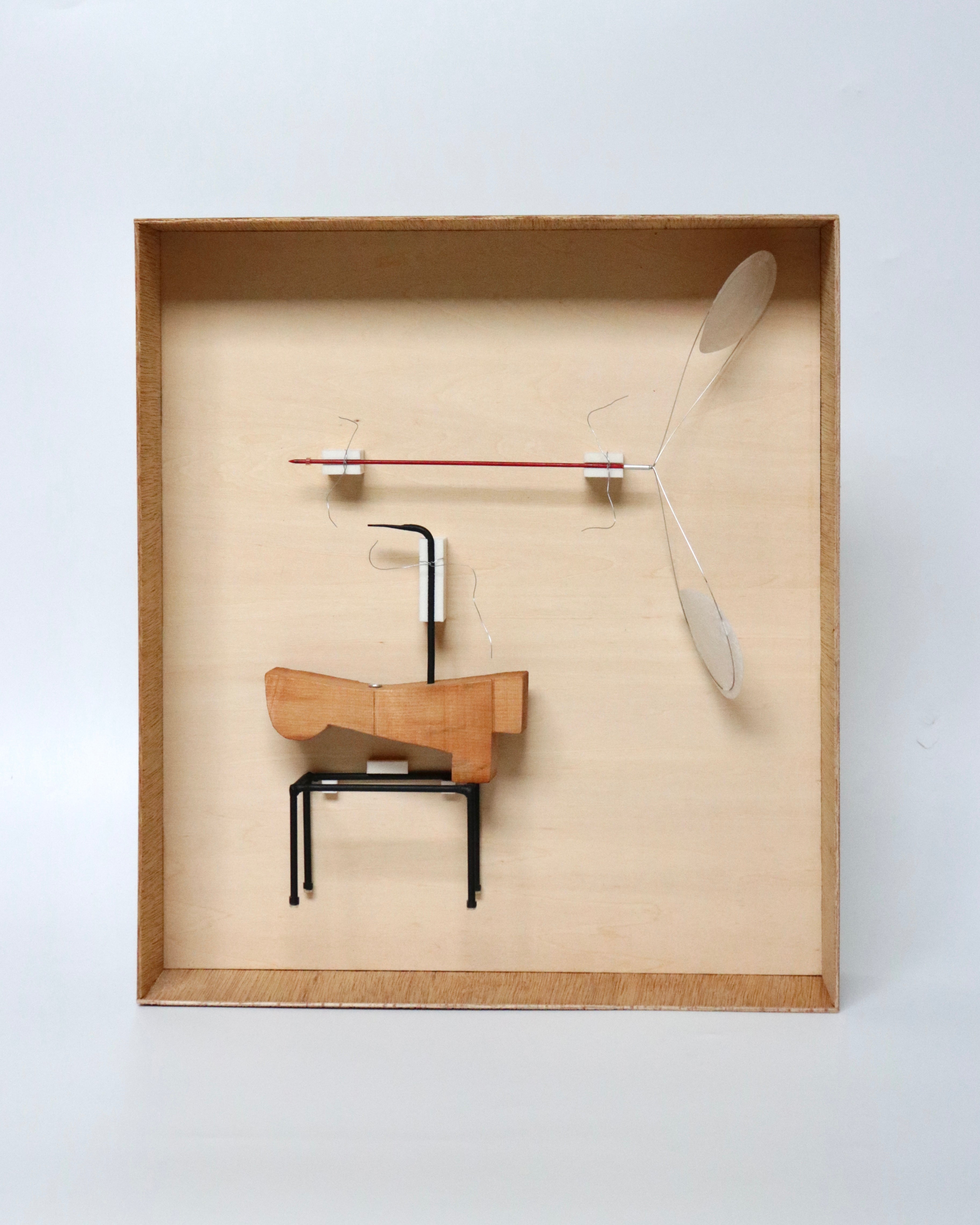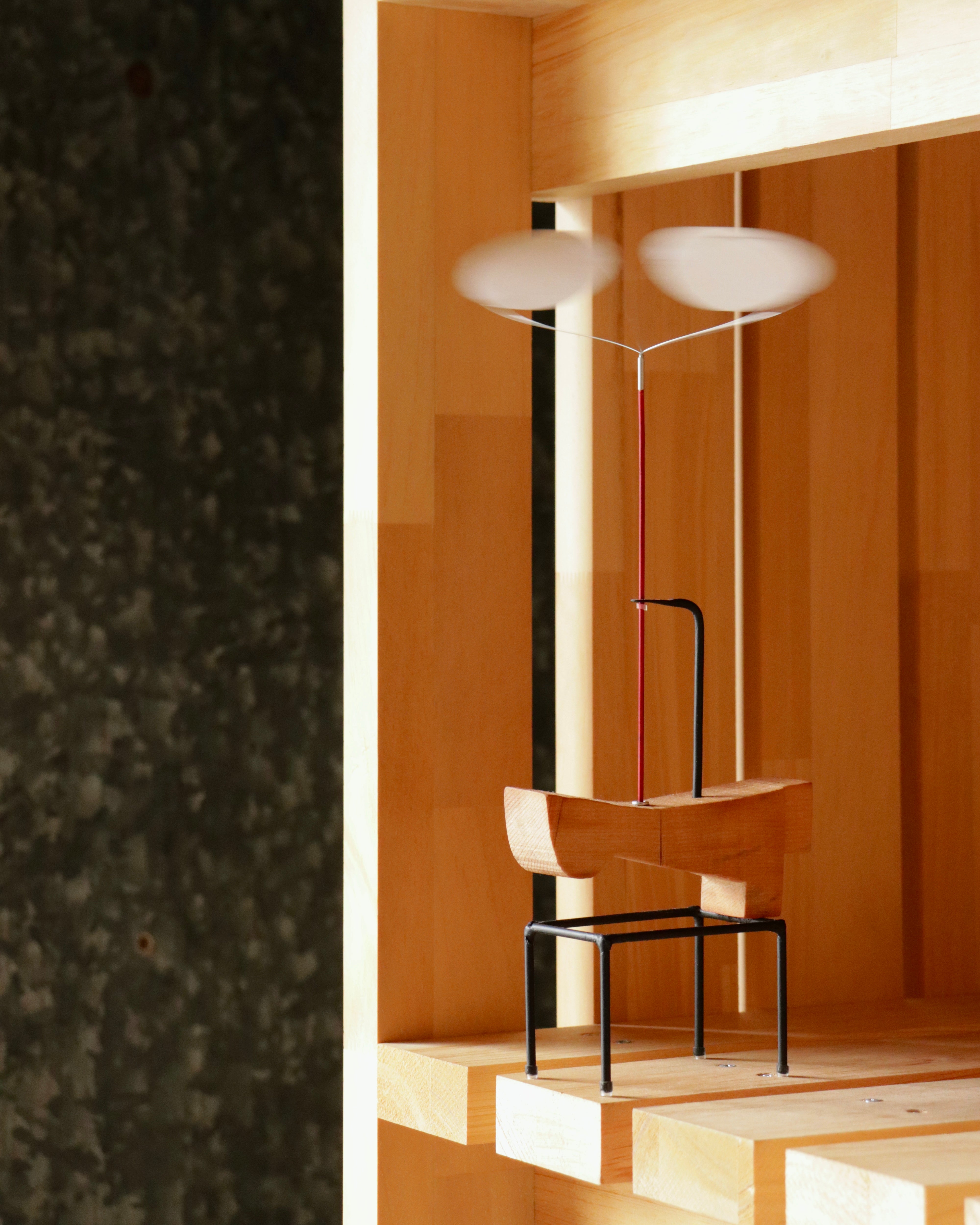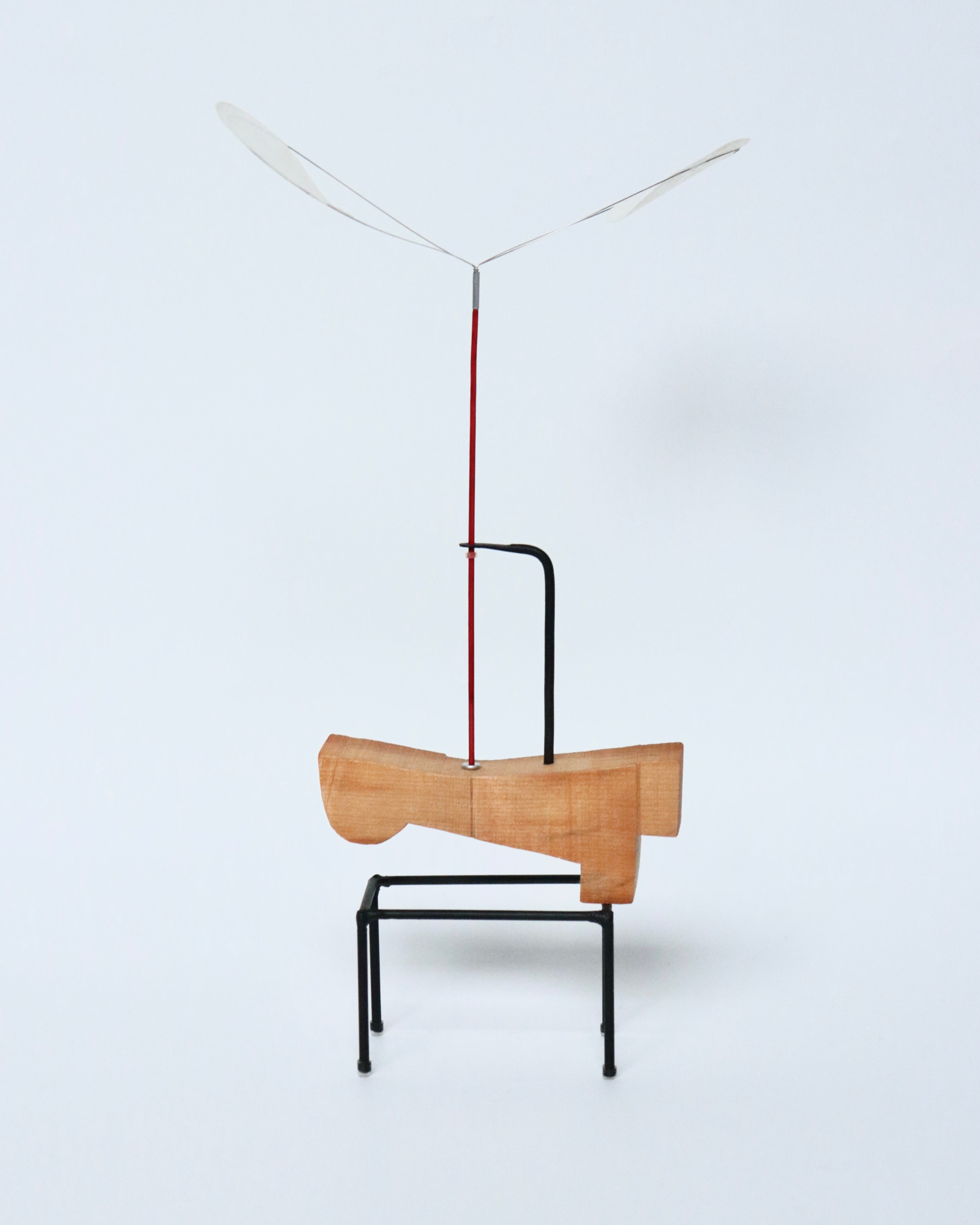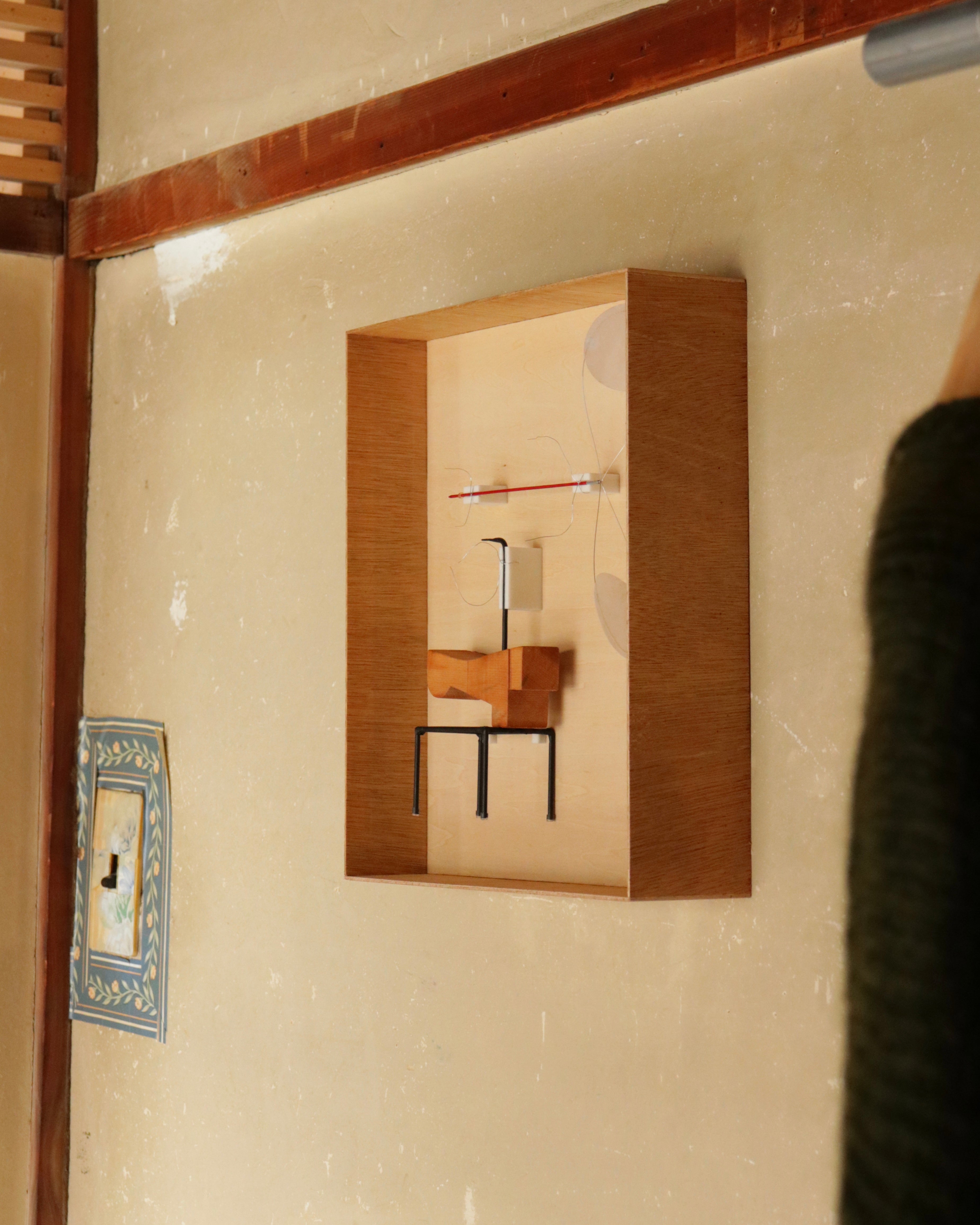 プロダクトデザイナー吉行良平とその父であるトシカズさんによるモビール。トシカズさんが手探りで作ったモビールはどこか愛嬌があり、自然と手に取りたくなる、優しい気配を纏った懐かしささえ感じます。動物のような形をした愛らしいデザインで、スチールと木材のバランスが程よく溶け込みあっています。吉行さんがデザインした箱も壁掛けができる仕様にアップデートされ、額物として家の中で飾れるように背面が工夫されています。手作業で制作された一点もの。説明書つき。