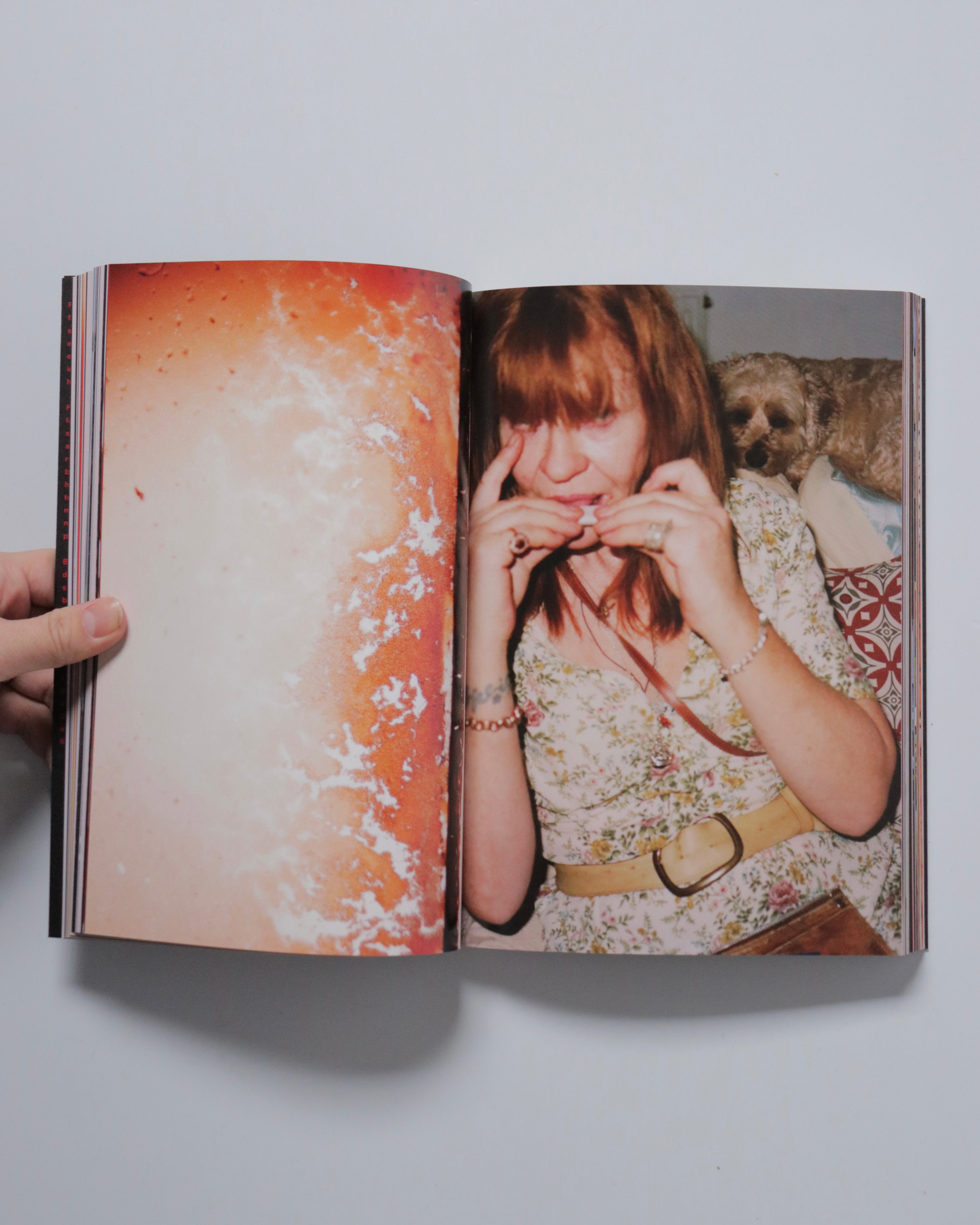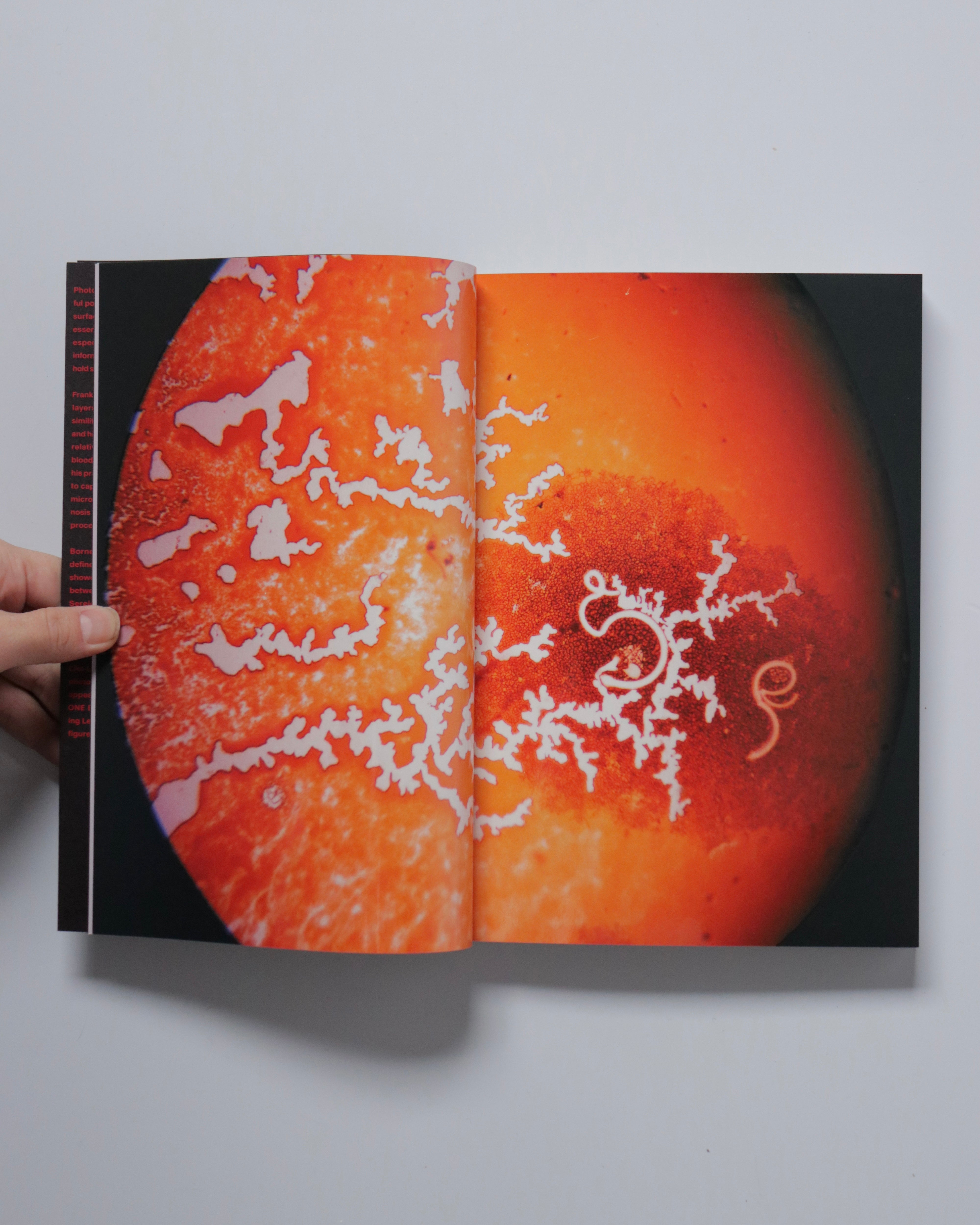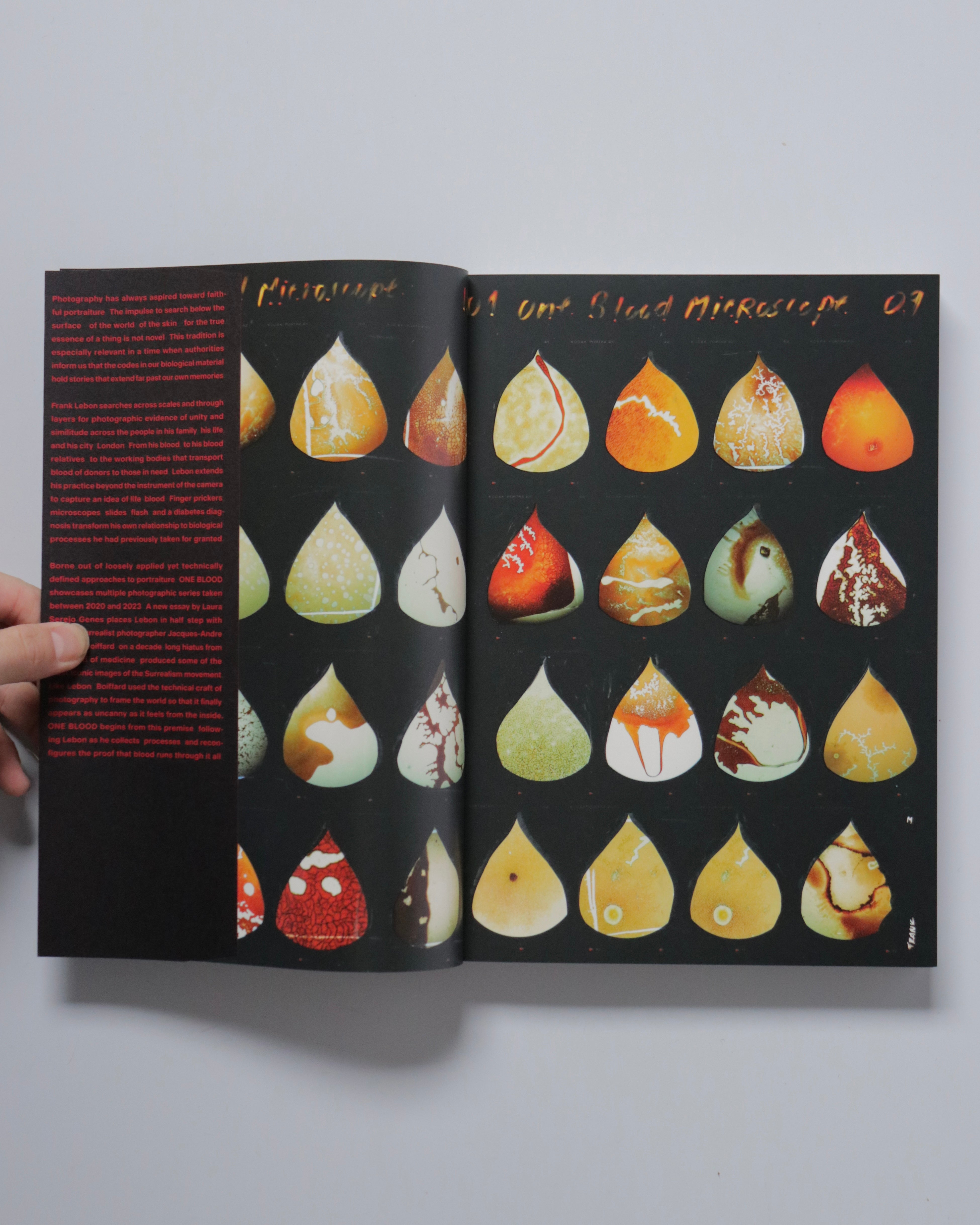 作者にとって写真家として初めて刊行するモノグラフである本書は、2020年から2023年にかけて撮影された様々な写真シリーズを収録し、ポートレイトに対し技巧的に定義されてきたアプローチをゆるやかに応用している。作者がこれまでにも慣れ親しんできた分野である身近な人々を撮影するという行為は、本作において、その過程においても形式においても極限まで精度が高められている。2020年の暗い時代、作者は家族や友人を探し、彼らの指から微量の血液のサンプルを採集するプロジェクトを考えついた。小さなスライドガラス(ガラス板)に塗られた血液のしずくを回収したこれらの親密なセッションは、作者が被写体である血液の提供者に手でフラッシュを覆ってもらい、自身の顔に独特の赤い光の洪水を投げかけ、より古典的なポートレイトと対をなしていた。