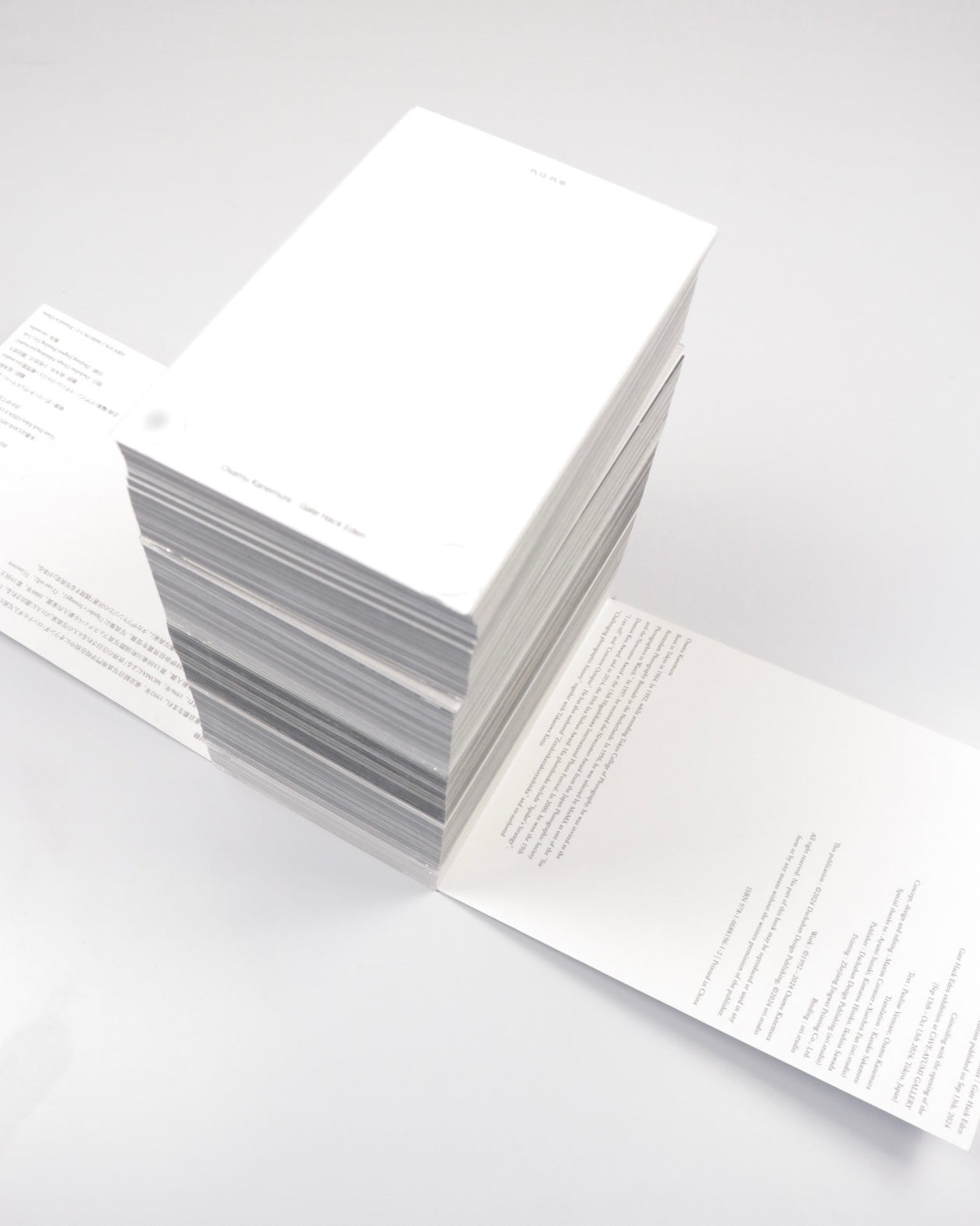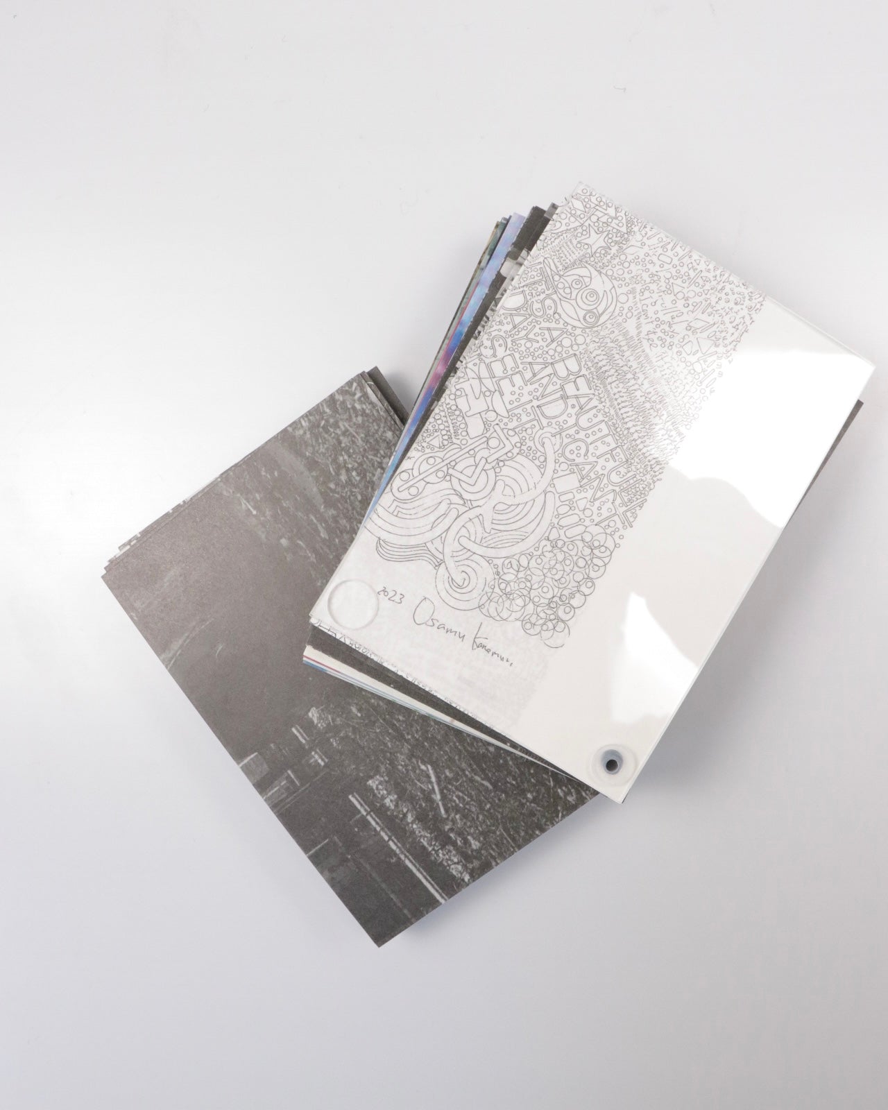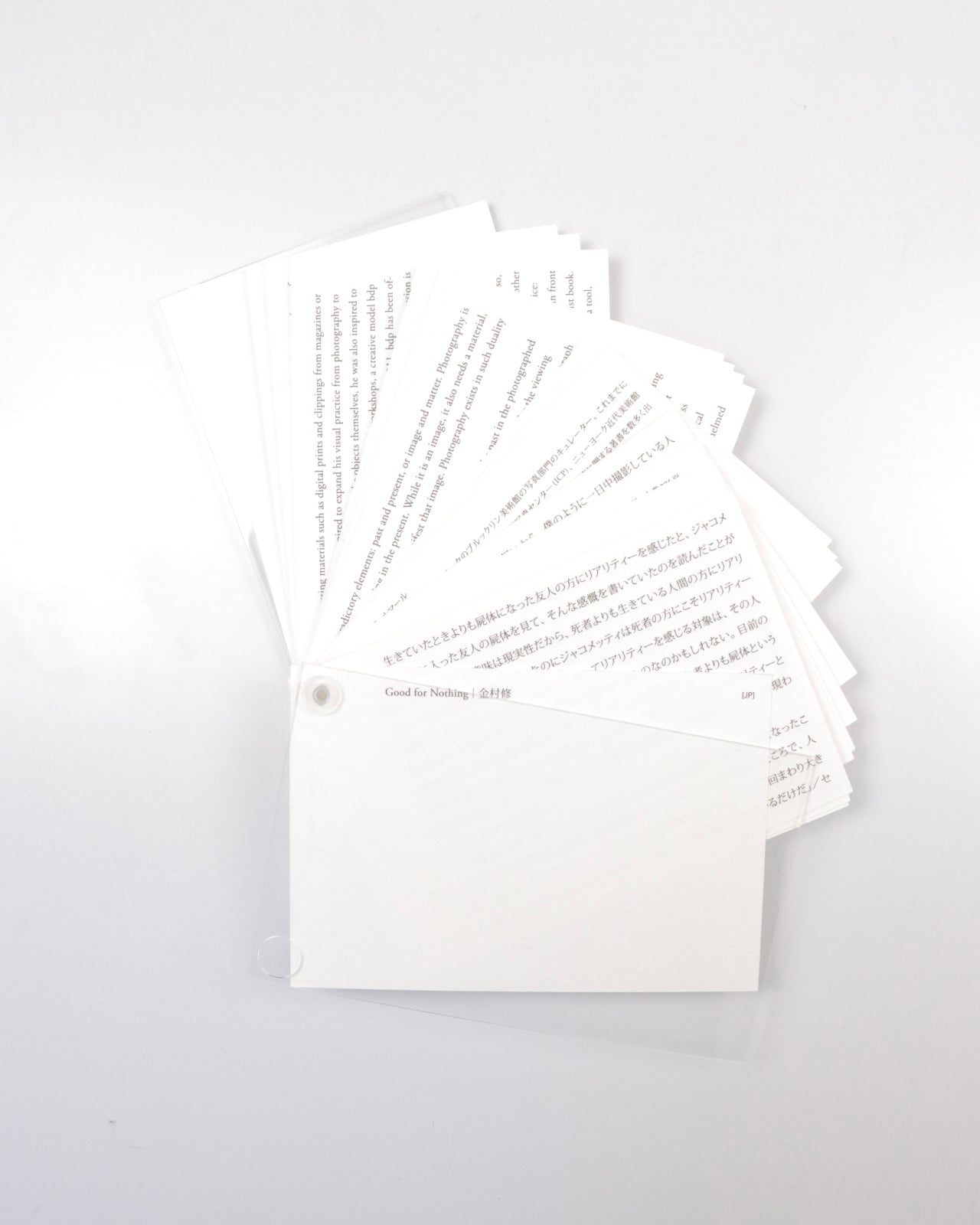 1冊ずつページの順番が異なる1点ものとなっており、各モジュールは互い違いに配置されたリベットを用いて2枚のアクリル板の間に綴じられています。キュレーターのポーリン・ヴェルマーレ(Pauline Vermare)による金村の活動の初期から現在までの包括的な紹介、金村が自身の作品より本書の背景にある深い思索を言葉にしたエッセイが収録されています。