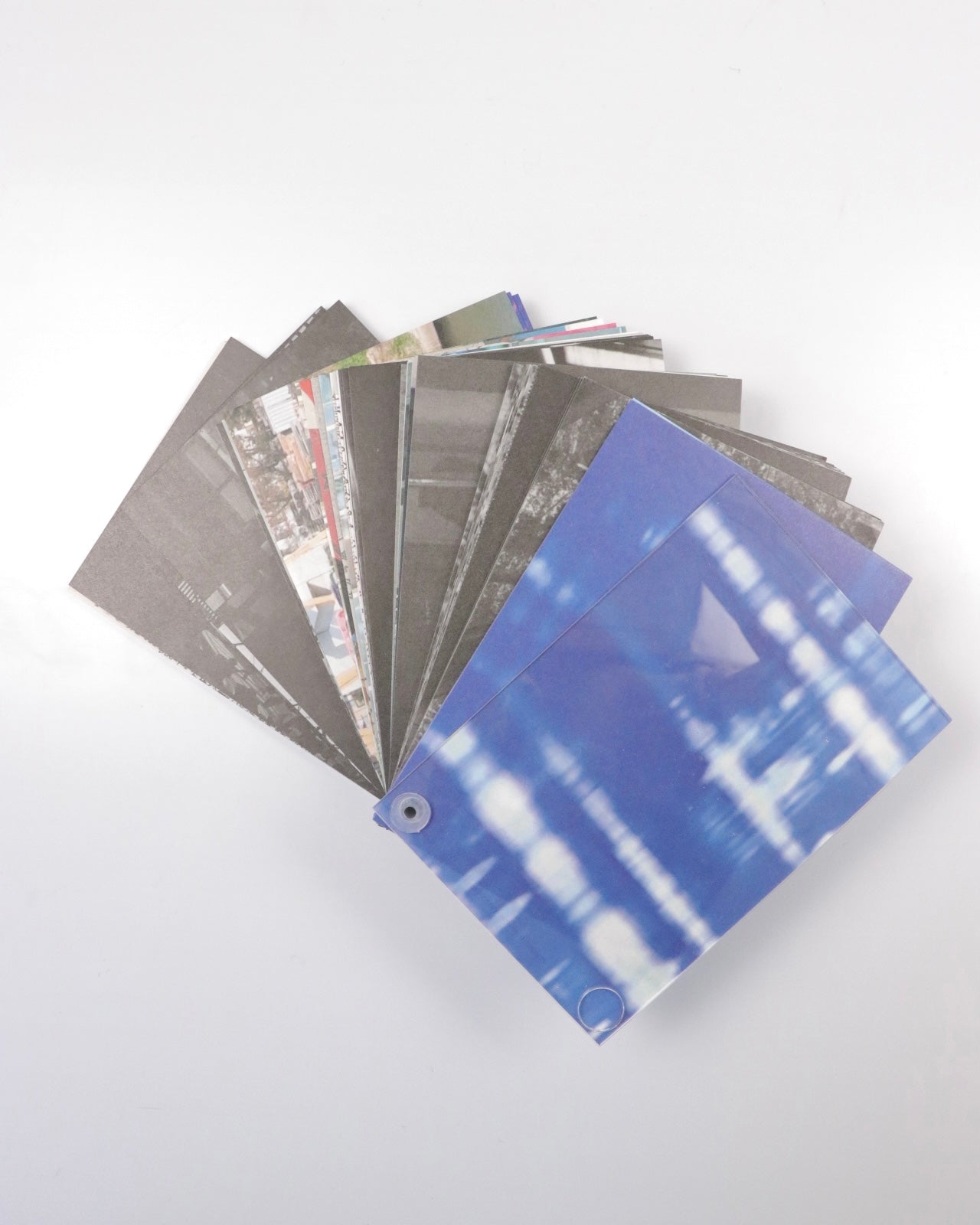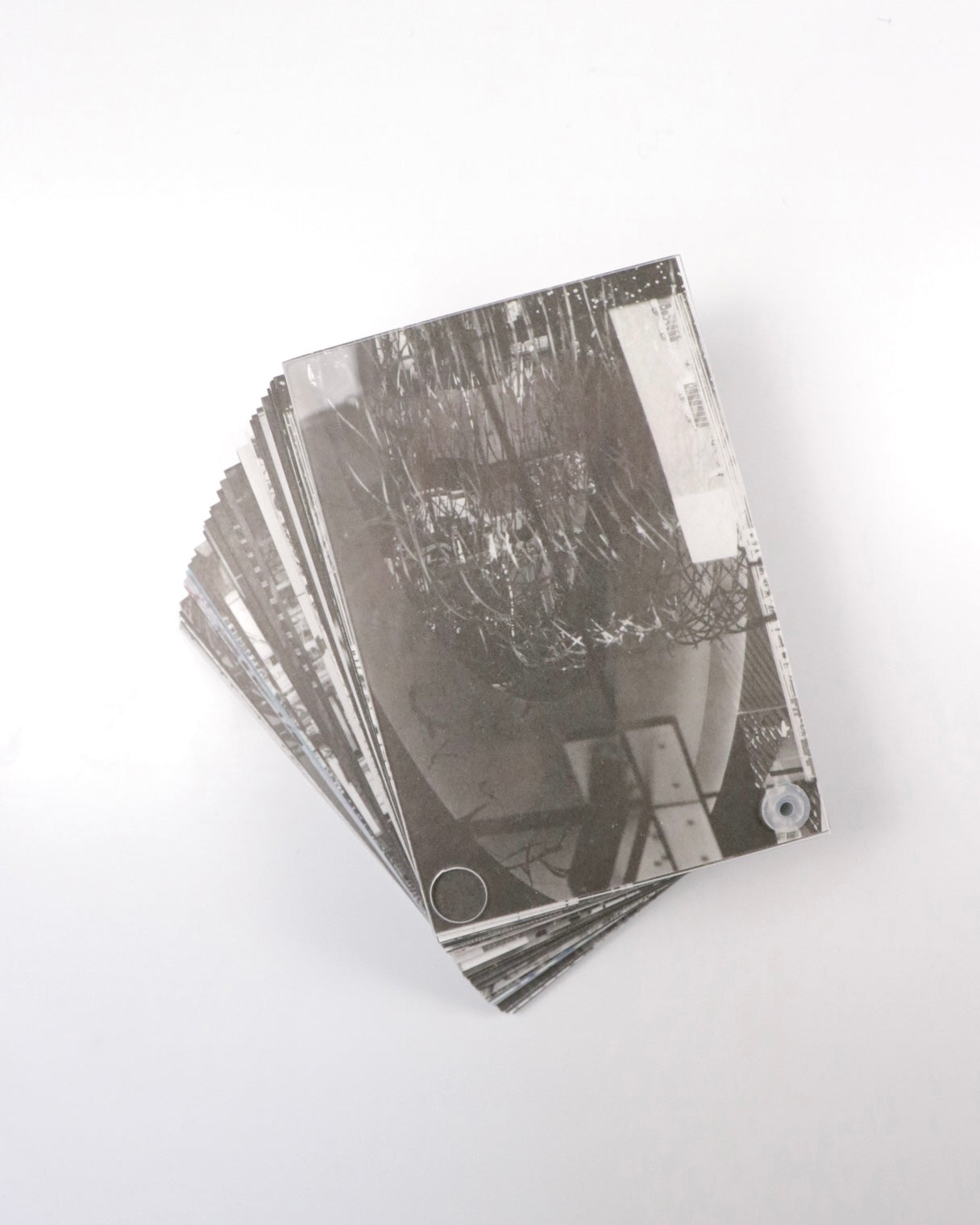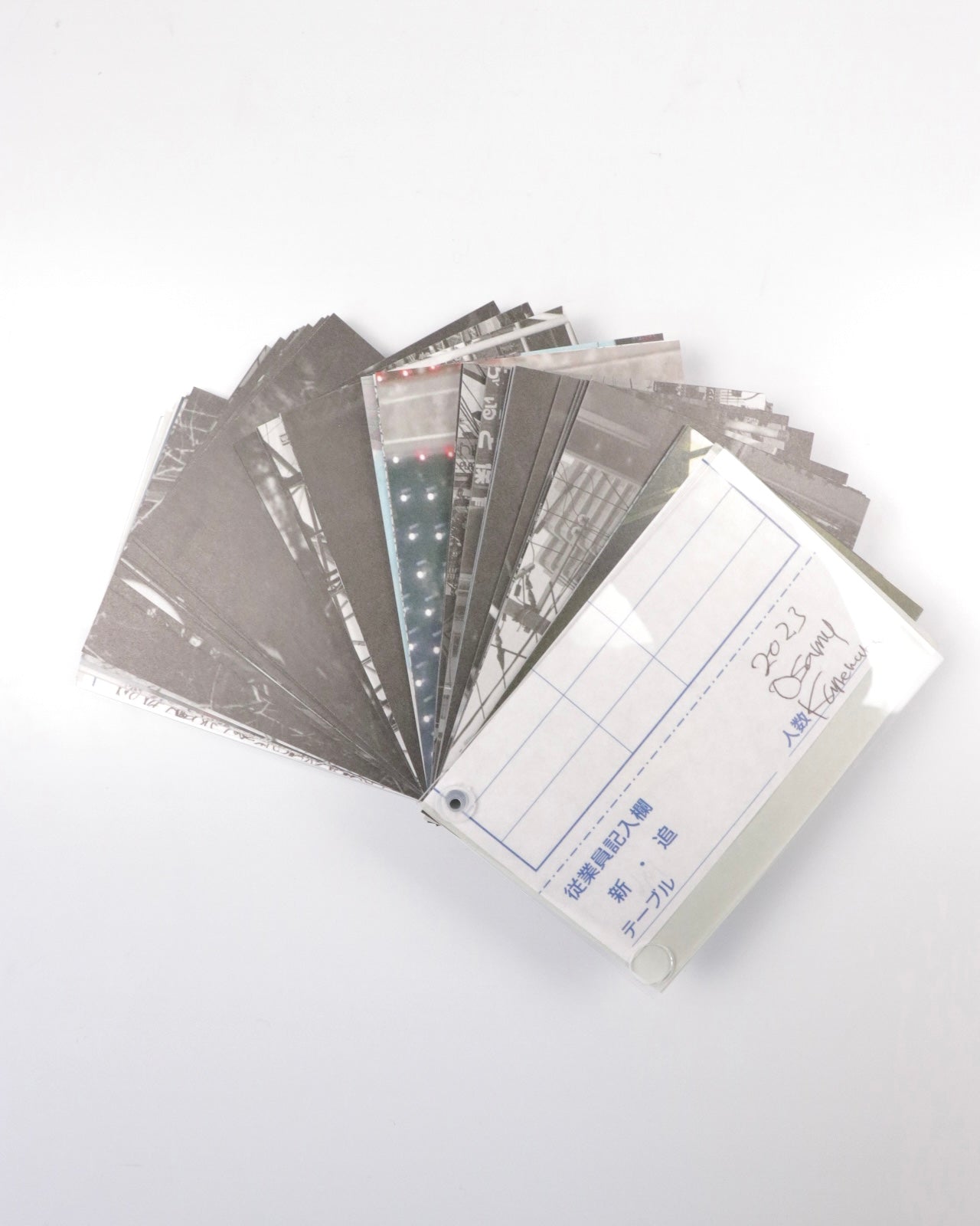 1冊ずつページの順番が異なる1点ものとなっており、各モジュールは互い違いに配置されたリベットを用いて2枚のアクリル板の間に綴じられています。キュレーターのポーリン・ヴェルマーレ(Pauline Vermare)による金村の活動の初期から現在までの包括的な紹介、金村が自身の作品より本書の背景にある深い思索を言葉にしたエッセイが収録されています。