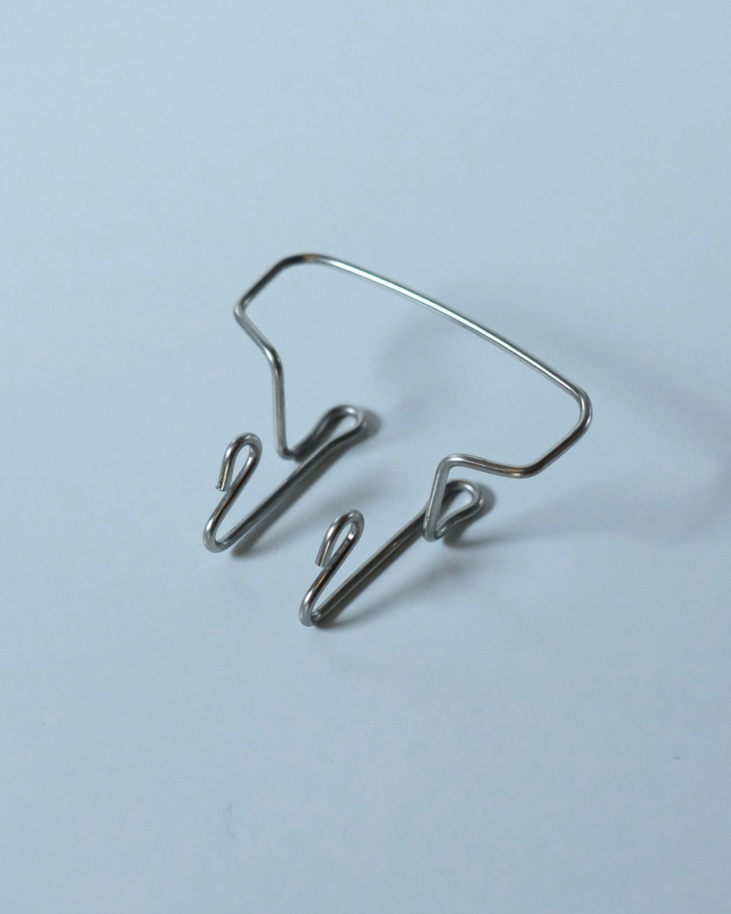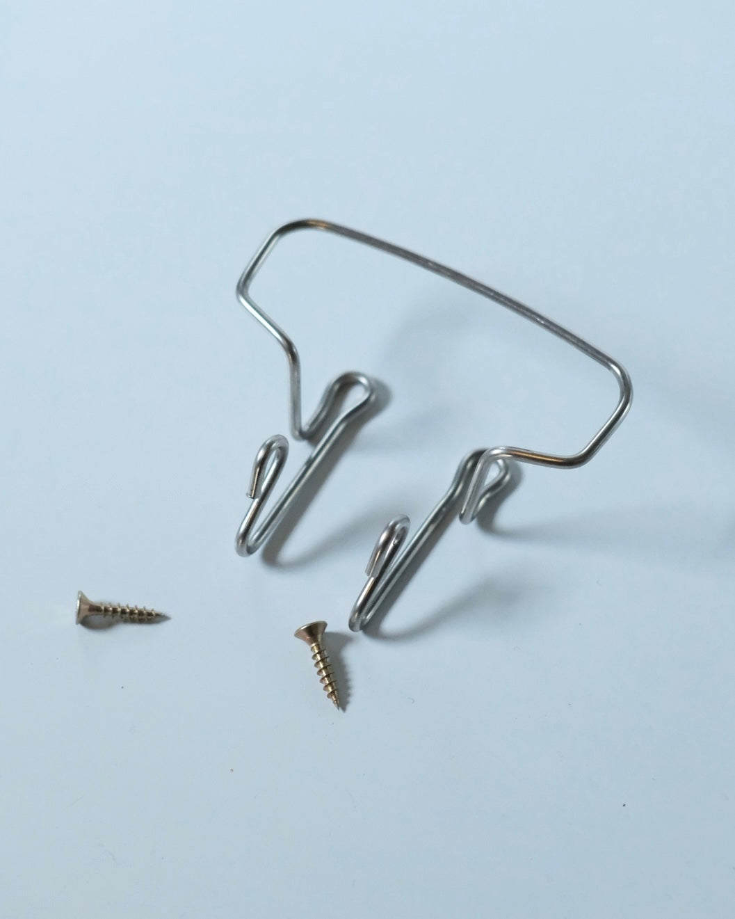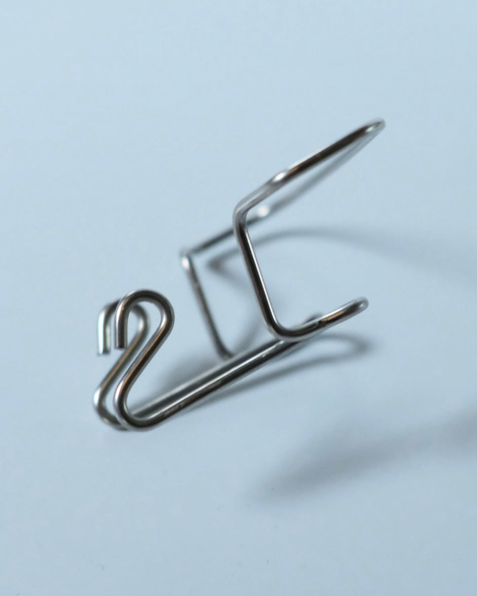 小さなフックが2つと、上部に大物を掛ける際に使用するフックが、一本のステンレスで美しく仕上げられた壁掛けフックです。一つのフックで、様々な物を最適な場所に掛けることを可能にした機能的な作品です。