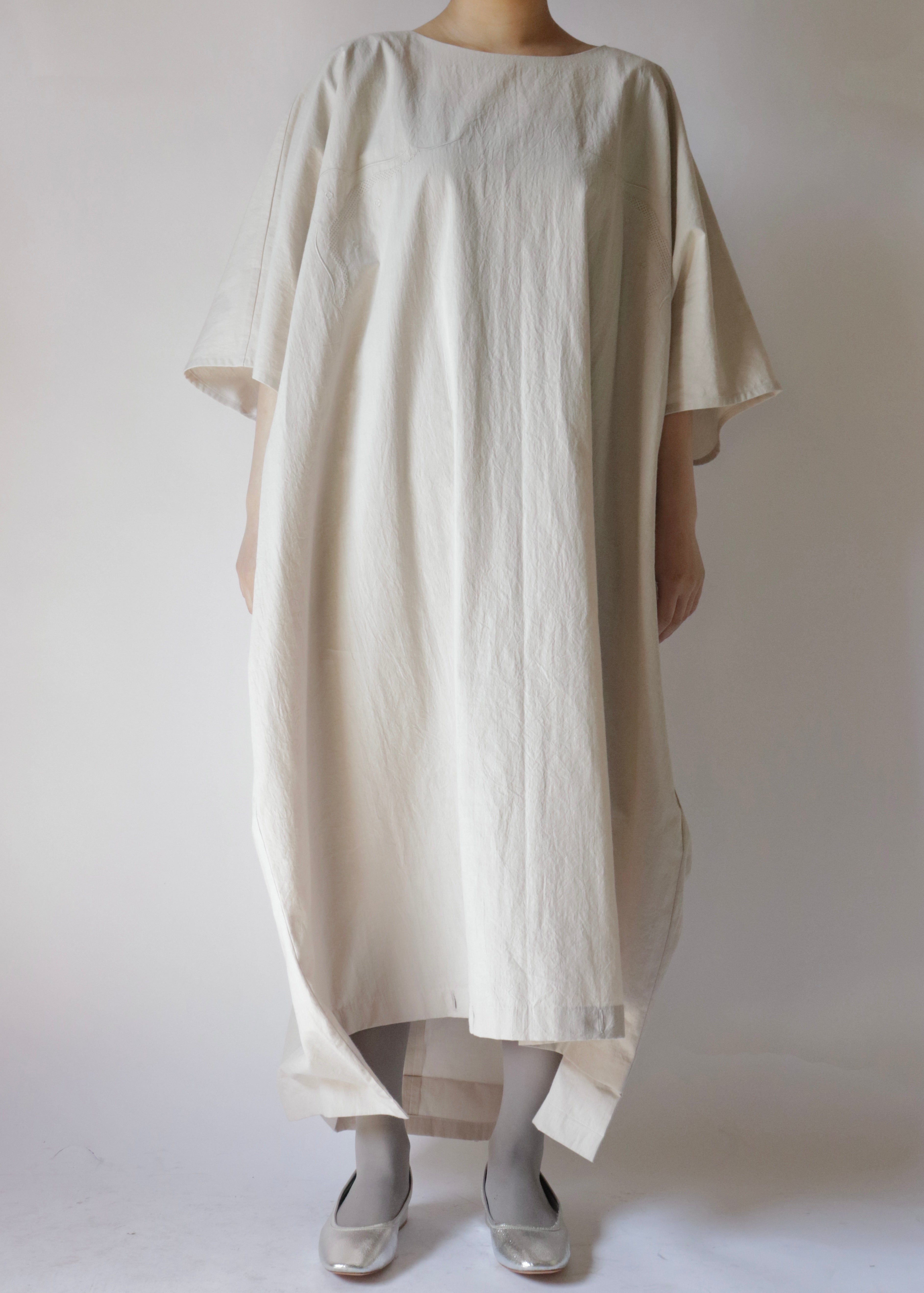 ヴィンテージのピローケースから着想を得たドレス。裾のボタンや身頃の刺繍などは、着想源を彷彿とさせる仕様になっています。身幅を広くとったドルマンスリーブは、ドレープが心地よいノンストレスな仕様です