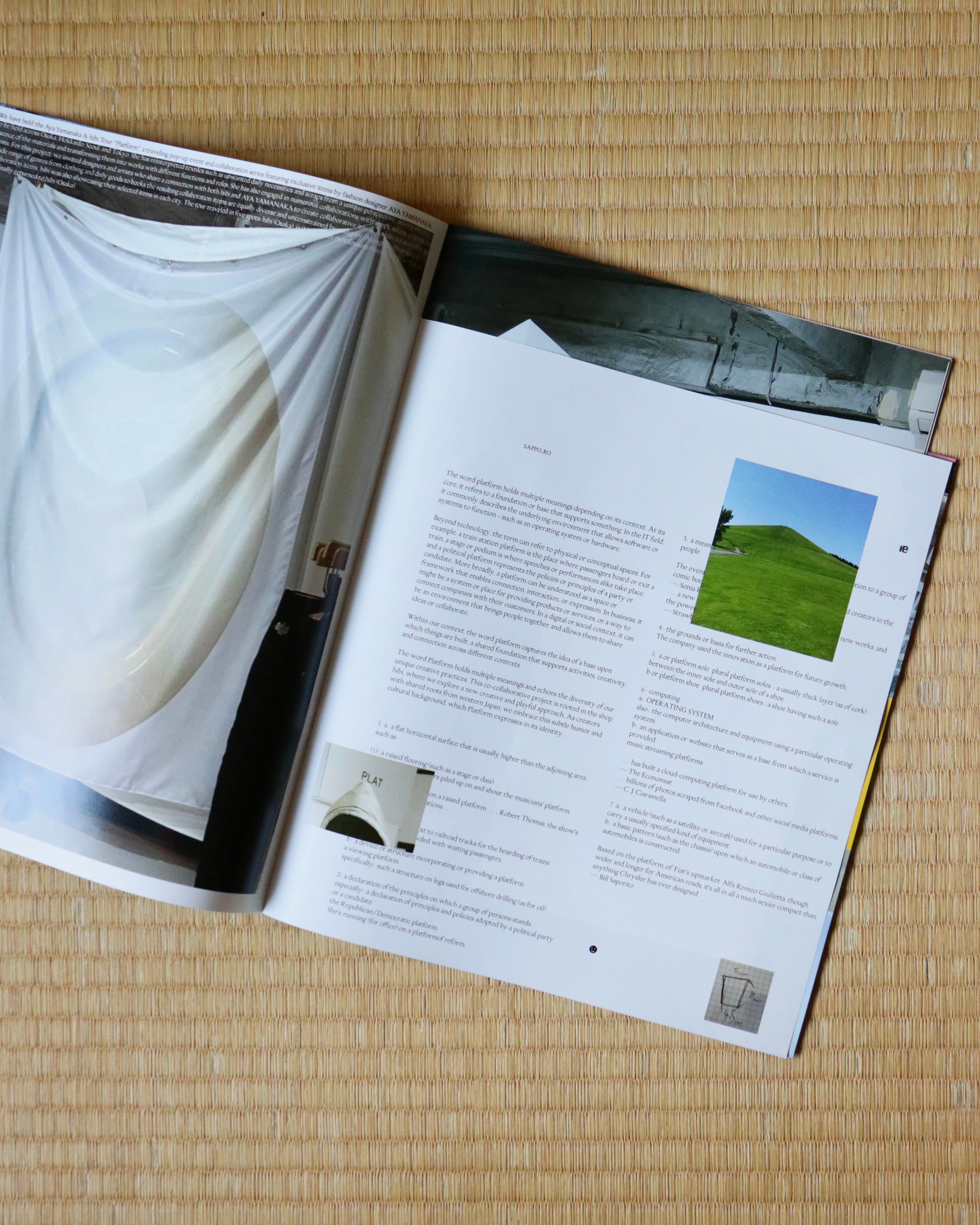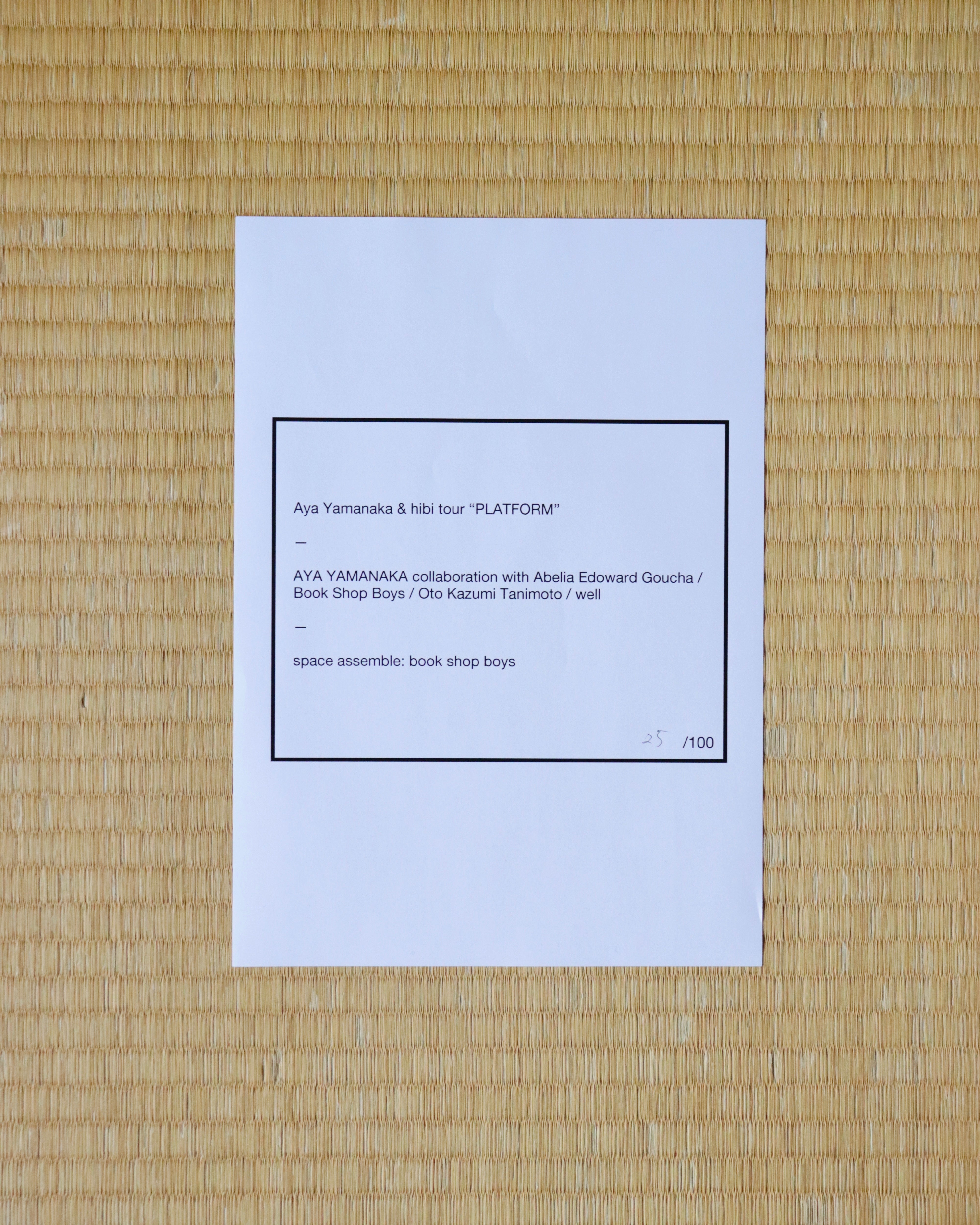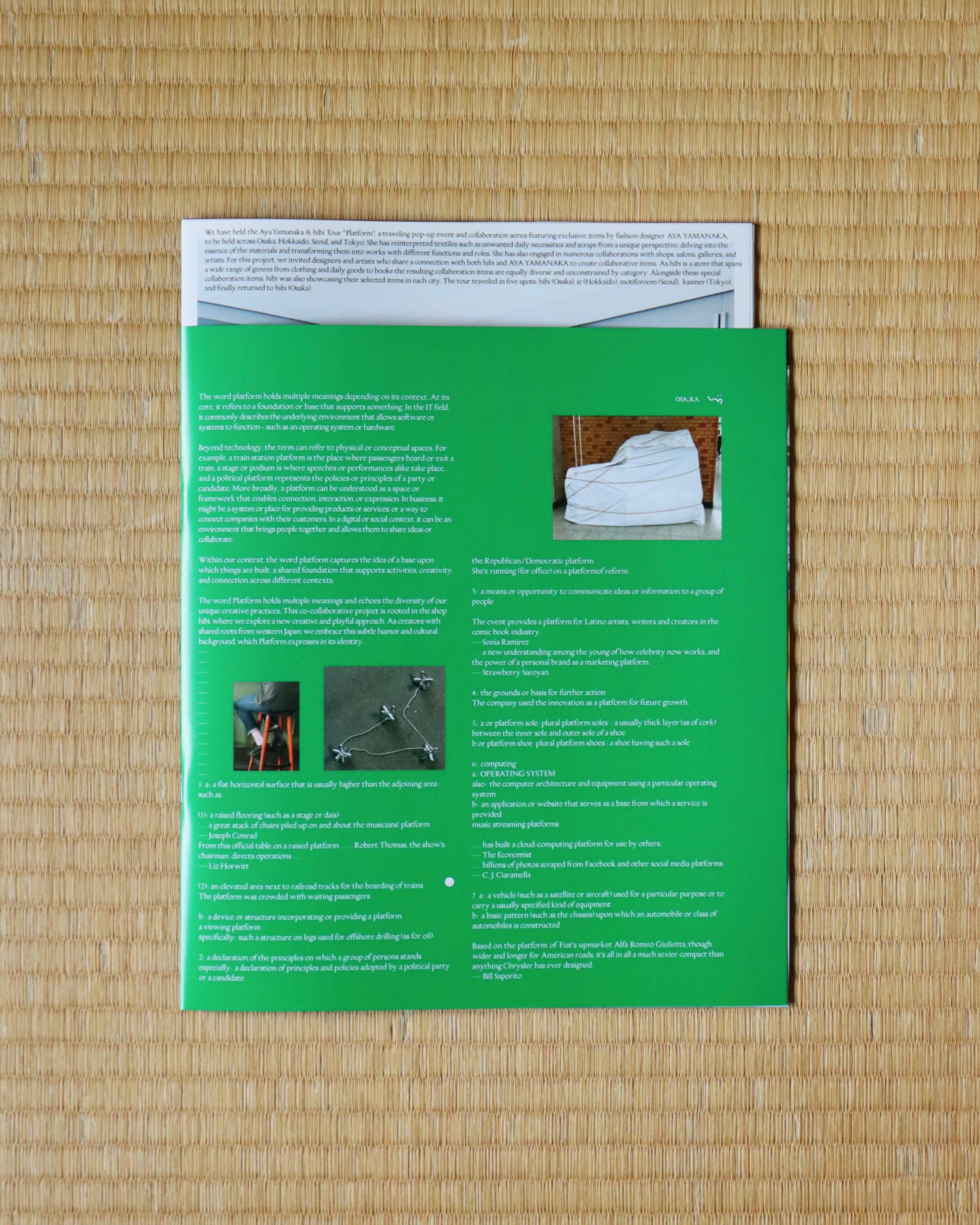 ギャラリーやショップ、美容室や作家などの多ジャンルに渡るコラボレーターとアイテムを制作するAYA YAMANAKAは、本イベントにおいて、hibiとその周辺の関係性があるファッションブランドやデザインスタジオ、アーティストにコラボレーションを依頼し、制作したアイテムを大阪・札幌・東京・ソウルの4都市を巡るツアー形式のイベントの中で発表しました。本書には、制作過程から各都市でのイベント終了までに各コラボレーターたちによって撮影された写真が掲載されています。ディレクション・ブックデザインを担当する東京のデザイン集団BOOK SHOP BOYSは、イベント”PLATFORM”から連想したイメージをそれぞれの写真が捉えた中から見出し、ページの重なりからイメージがリンクする独自の製本を行いました。