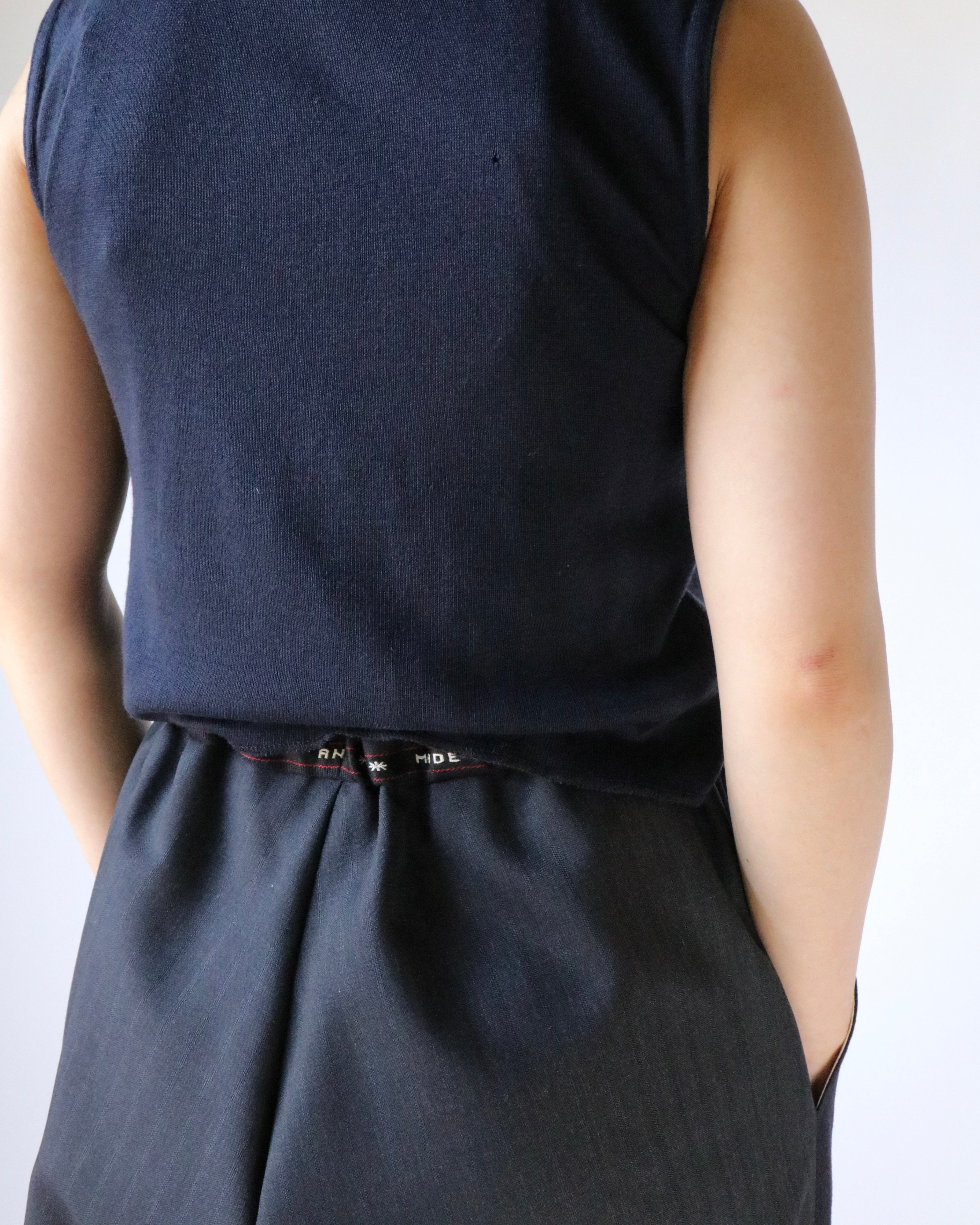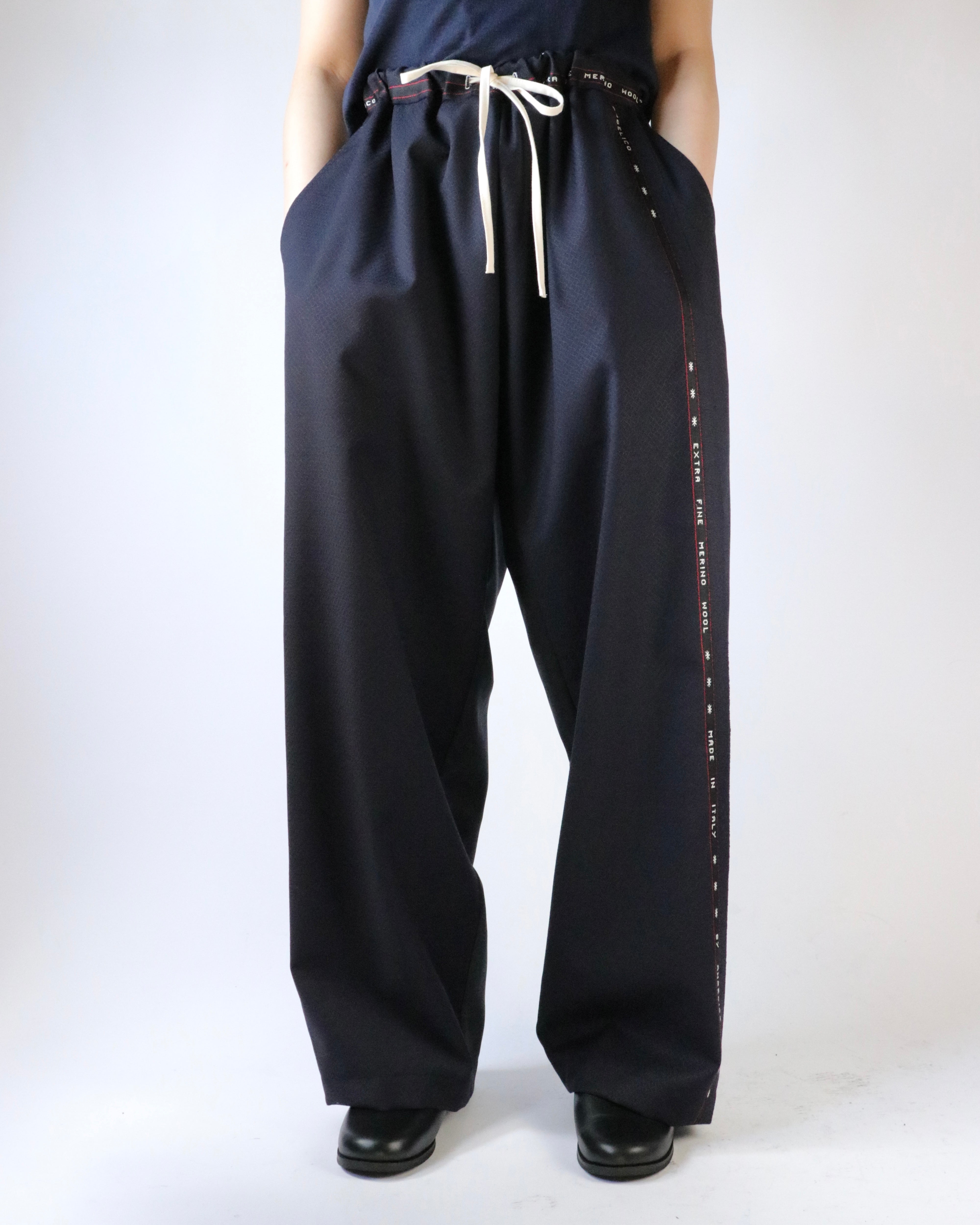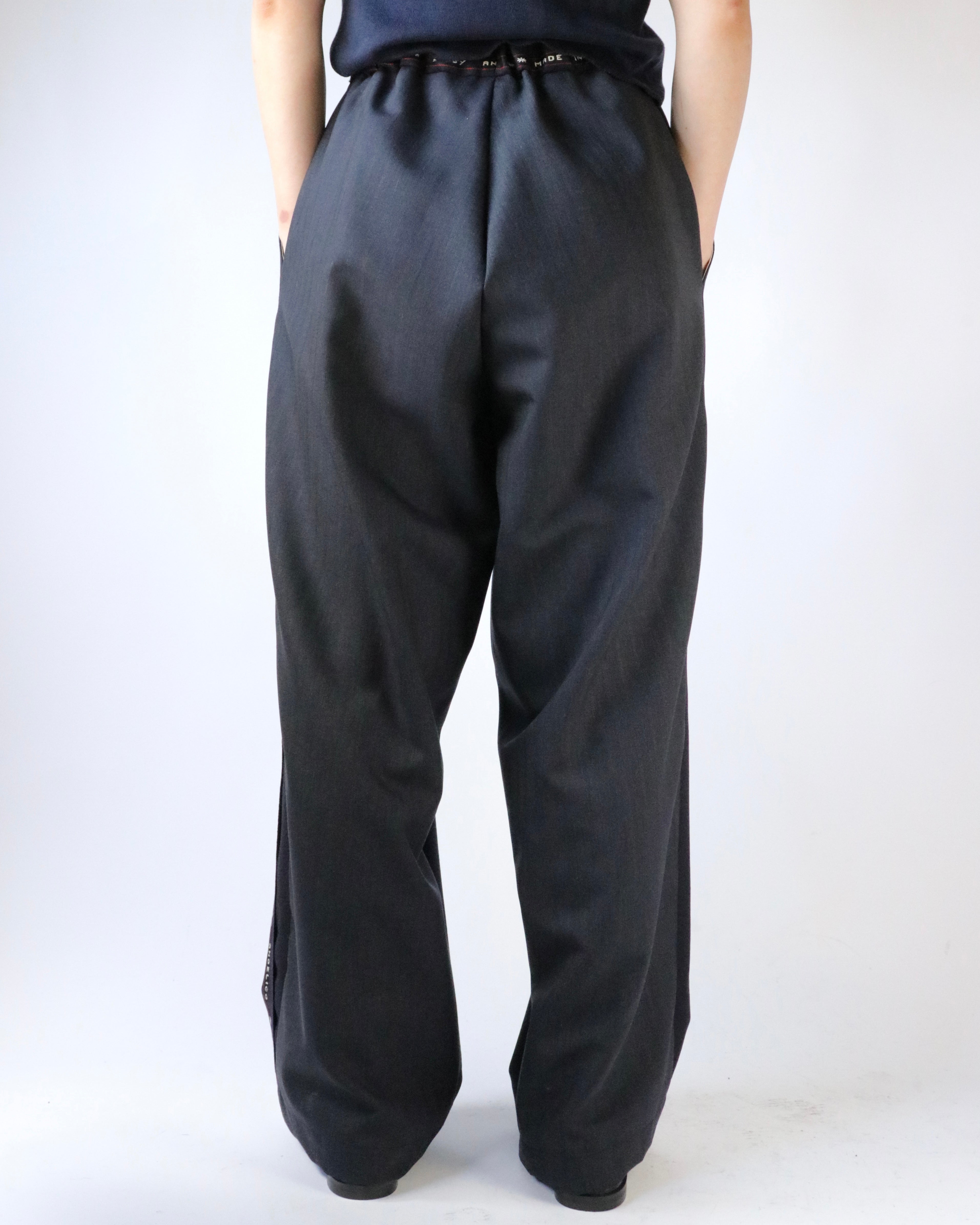AYA YAMANAKAが長年制作を続けているパワーパンツ。不要になったスーツ地の残布を使用し、前後で異なる柄で組み合わせ、ミミと呼ばれる普段見えない部分をあえて表に出すことで、どこか違和感があり、その不自然さが着用者に心地よい気分を与えるようです。ウエストゴム仕様でどなたでも気兼ねなく楽しめるアイテムです。