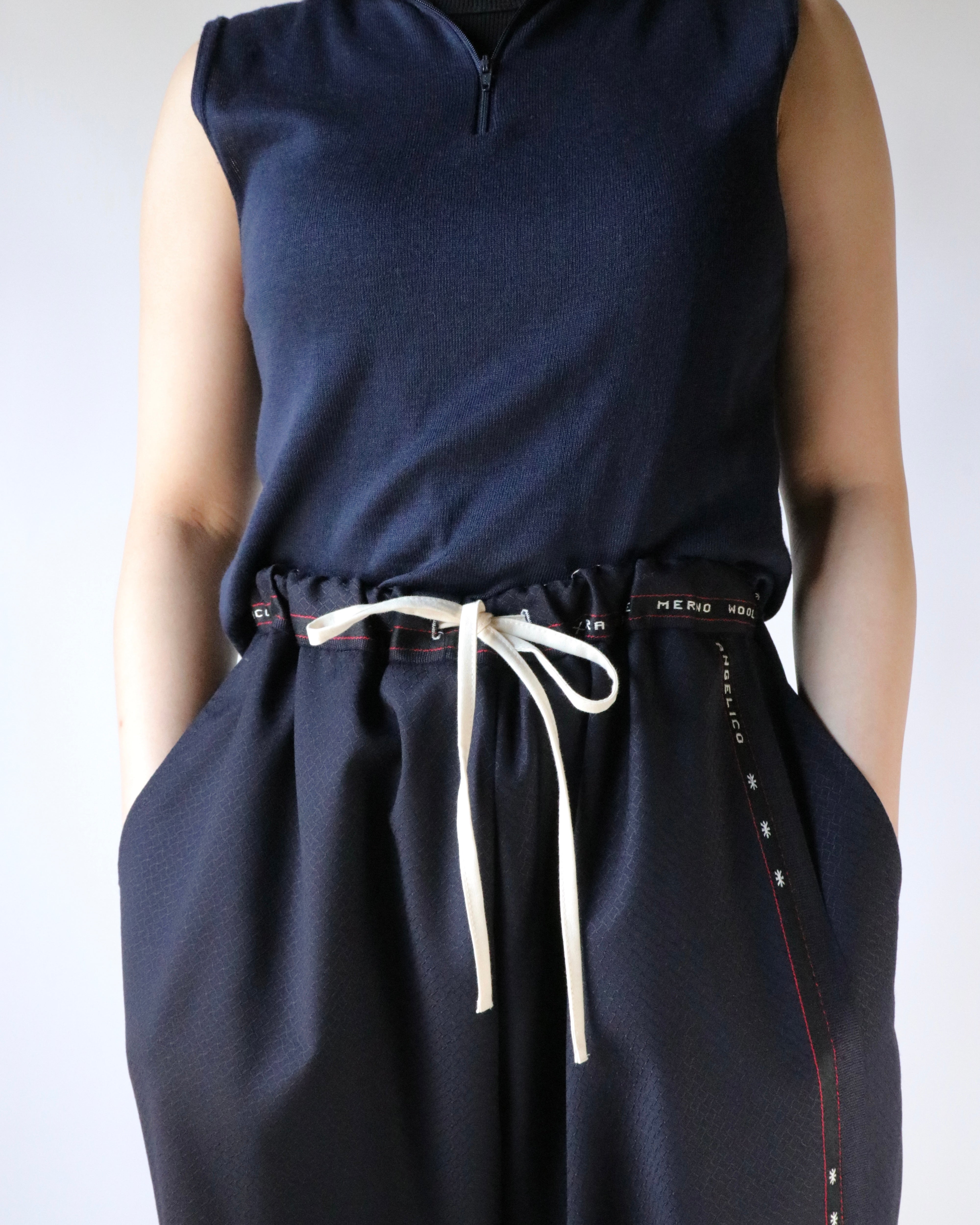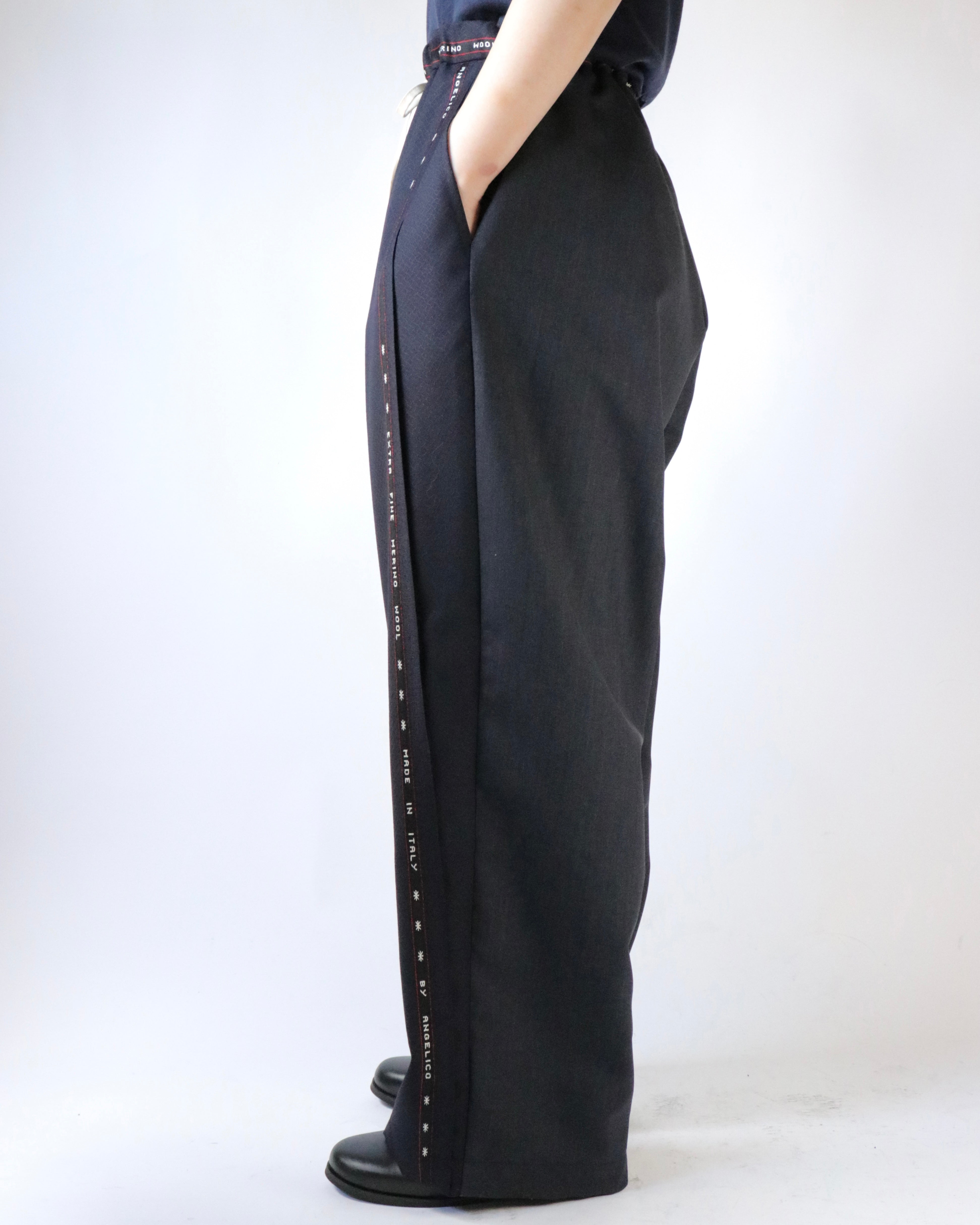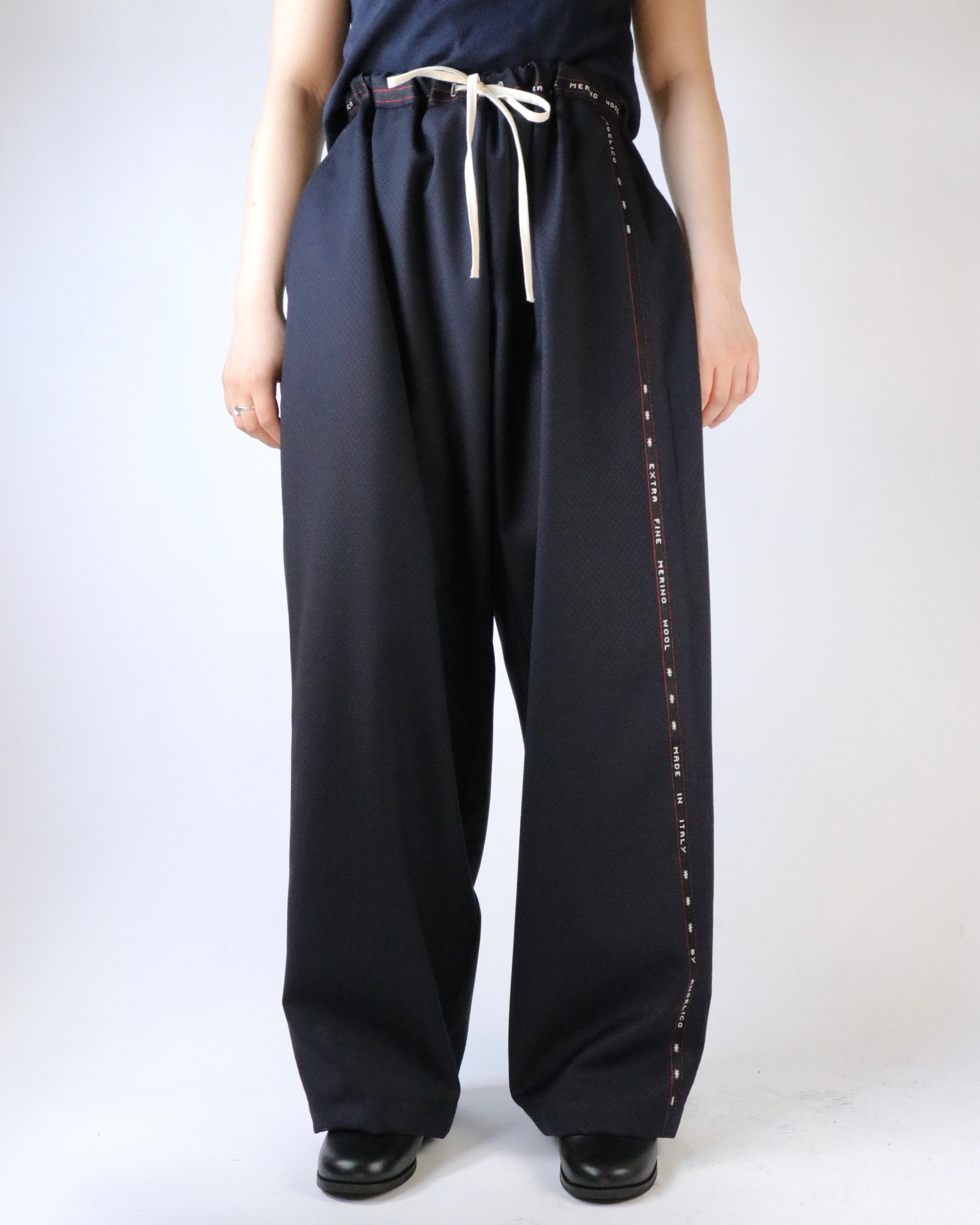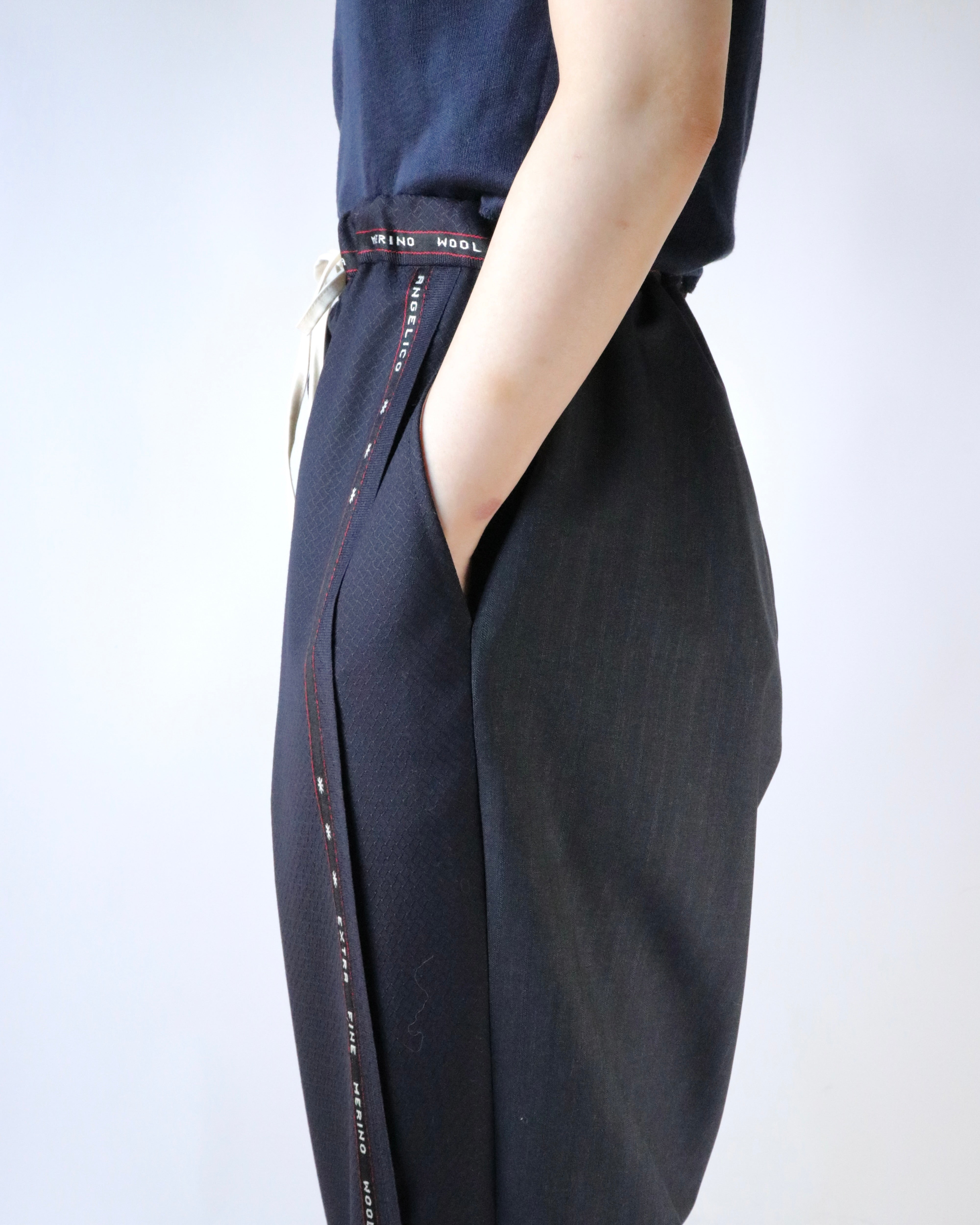 AYA YAMANAKAが長年制作を続けているパワーパンツ。不要になったスーツ地の残布を使用し、前後で異なる柄で組み合わせ、ミミと呼ばれる普段見えない部分をあえて表に出すことで、どこか違和感があり、その不自然さが着用者に心地よい気分を与えるようです。ウエストゴム仕様でどなたでも気兼ねなく楽しめるアイテムです。