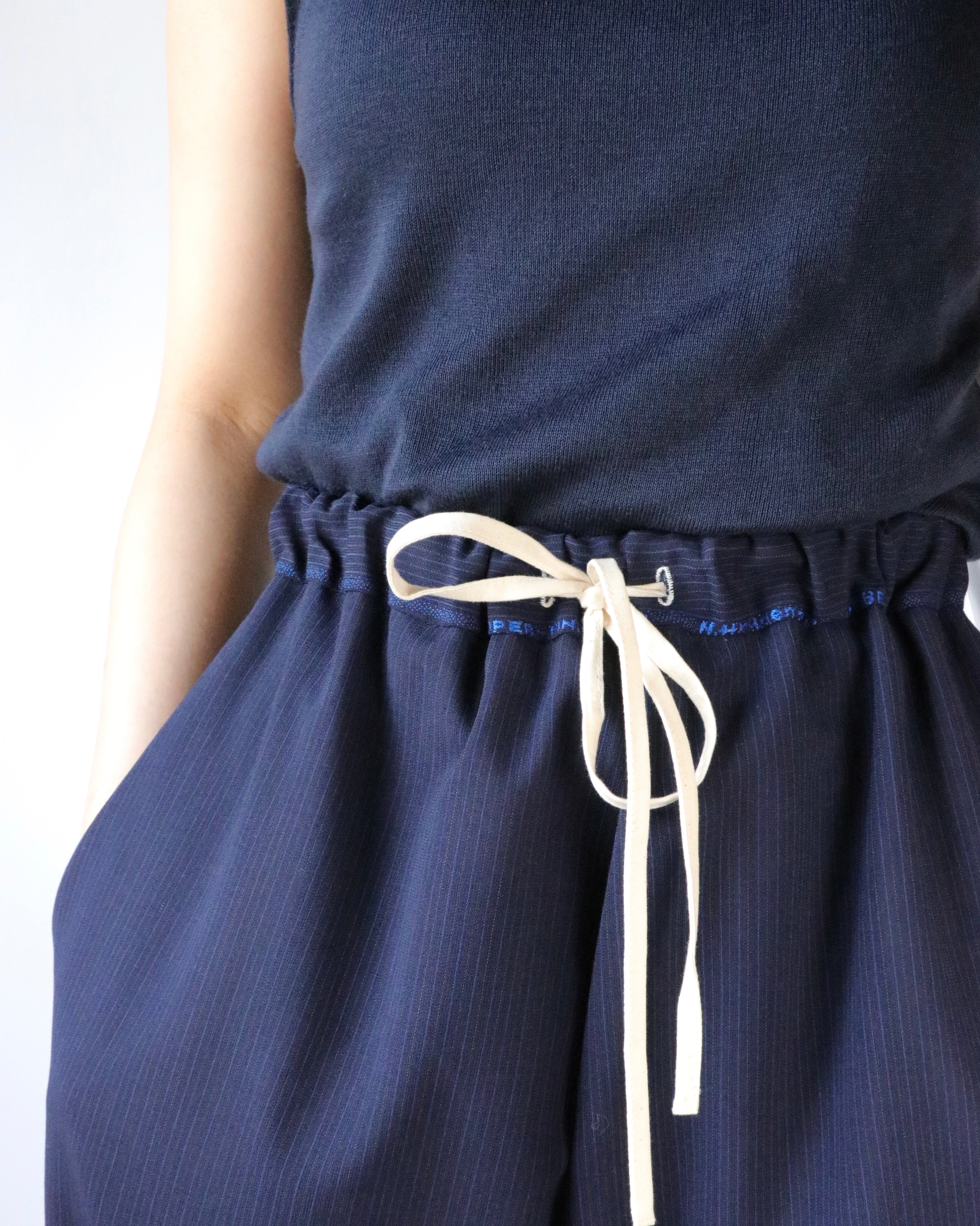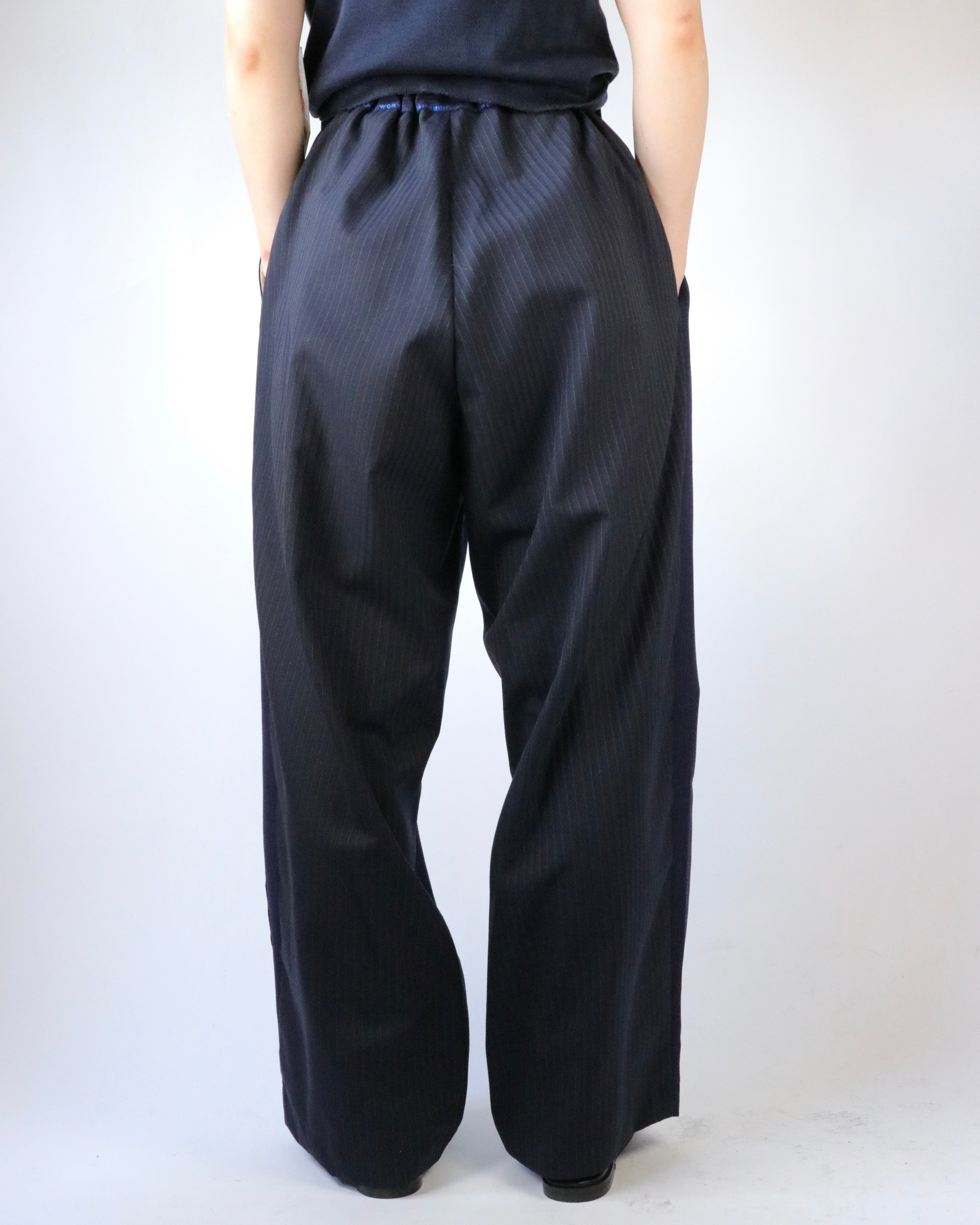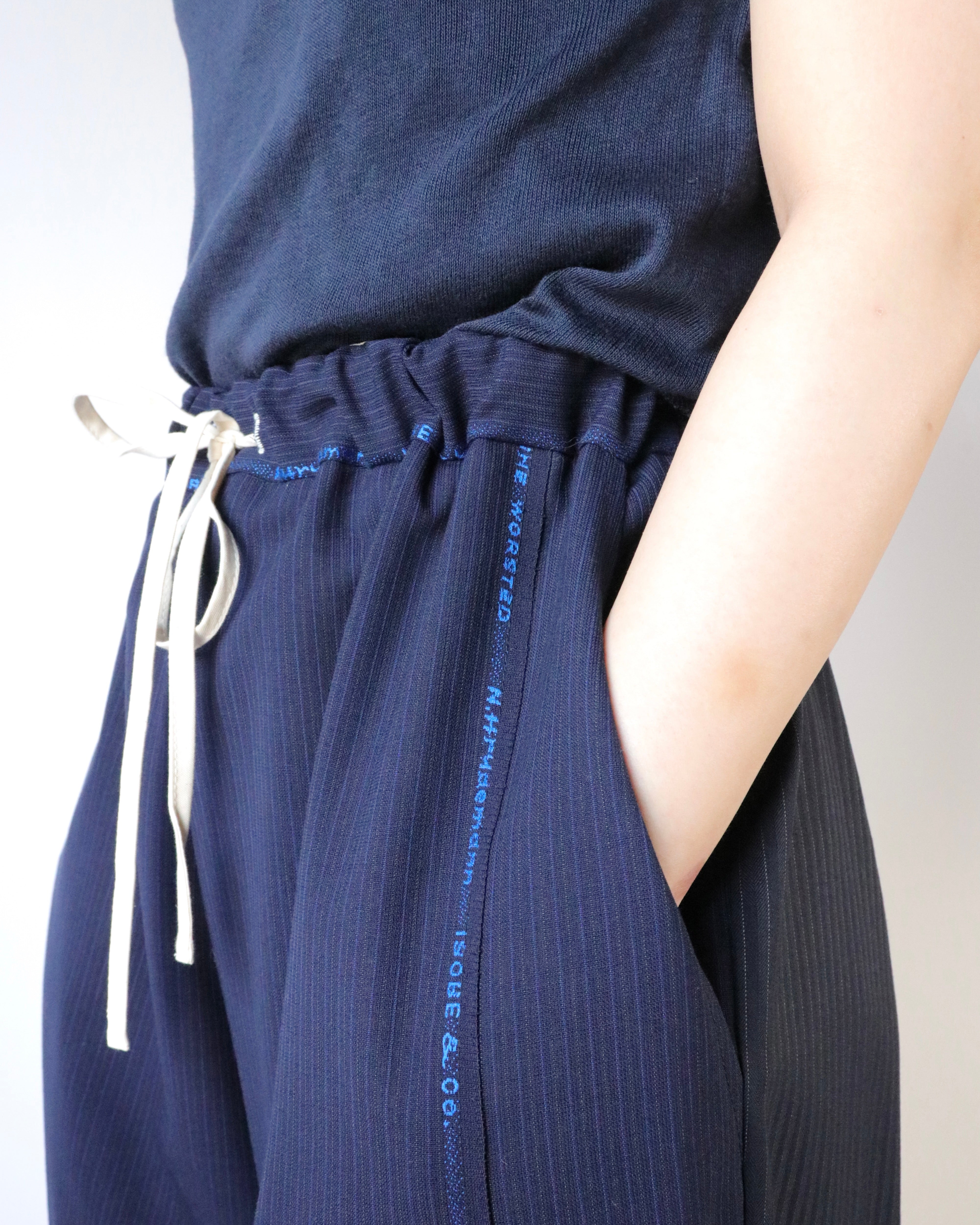 AYA YAMANAKAが長年制作を続けているパワーパンツ。不要になったスーツ地の残布を使用し、前後で異なる柄で組み合わせ、ミミと呼ばれる普段見えない部分をあえて表に出すことで、どこか違和感があり、その不自然さが着用者に心地よい気分を与えるようです。ウエストゴム仕様でどなたでも気兼ねなく楽しめるアイテムです。