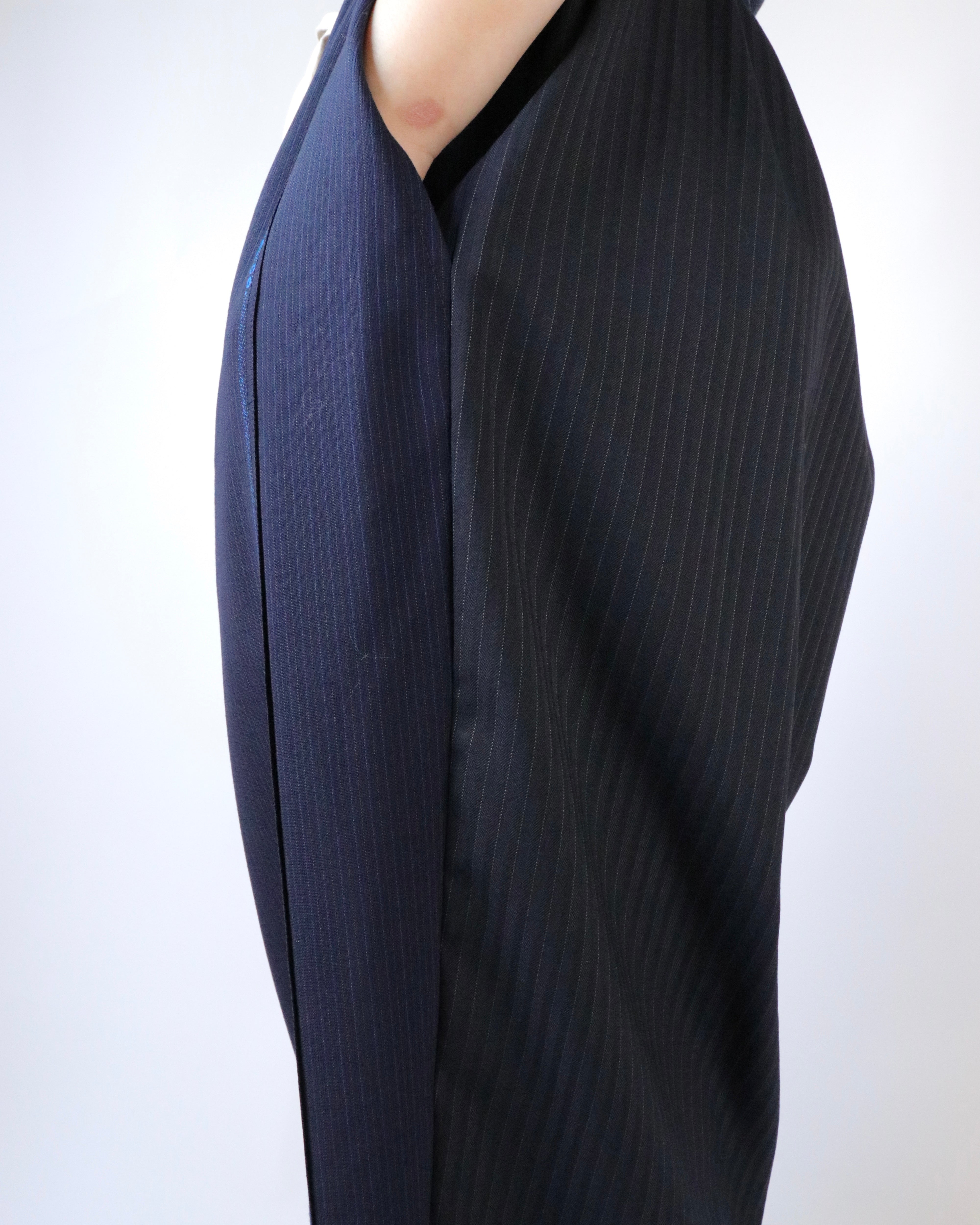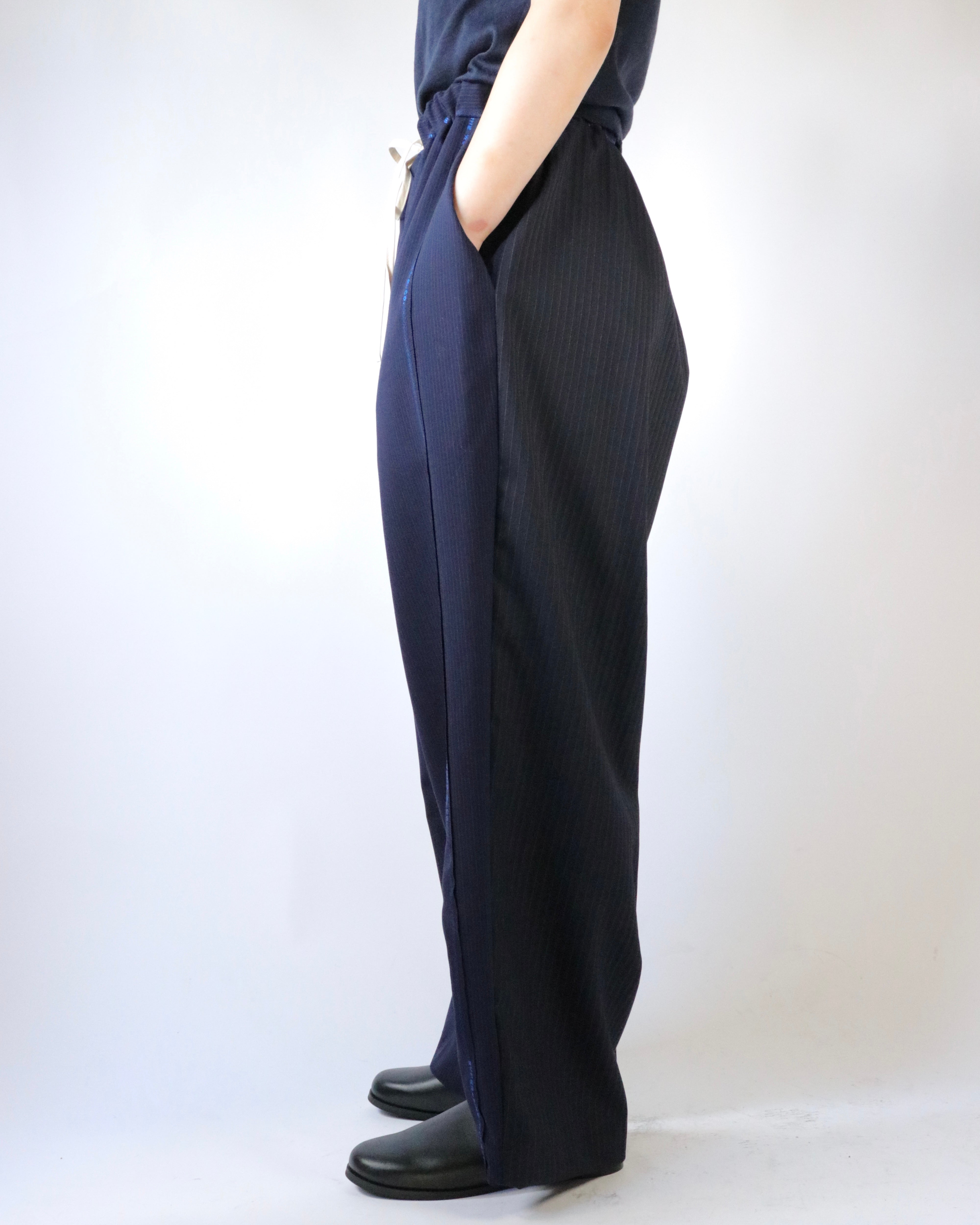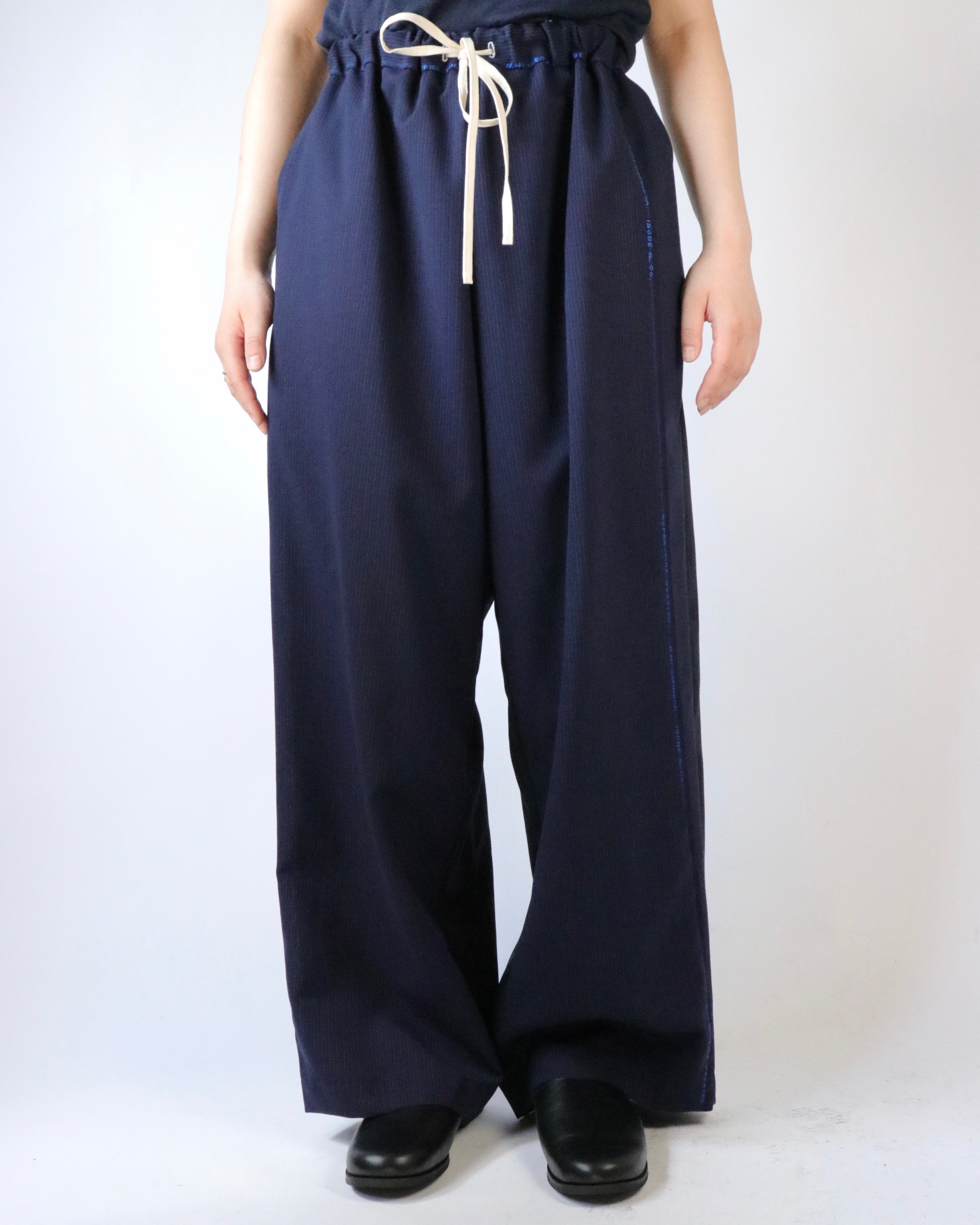 AYA YAMANAKAが長年制作を続けているパワーパンツ。不要になったスーツ地の残布を使用し、前後で異なる柄で組み合わせ、ミミと呼ばれる普段見えない部分をあえて表に出すことで、どこか違和感があり、その不自然さが着用者に心地よい気分を与えるようです。ウエストゴム仕様でどなたでも気兼ねなく楽しめるアイテムです。