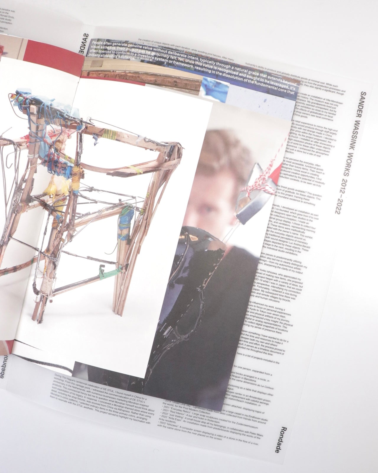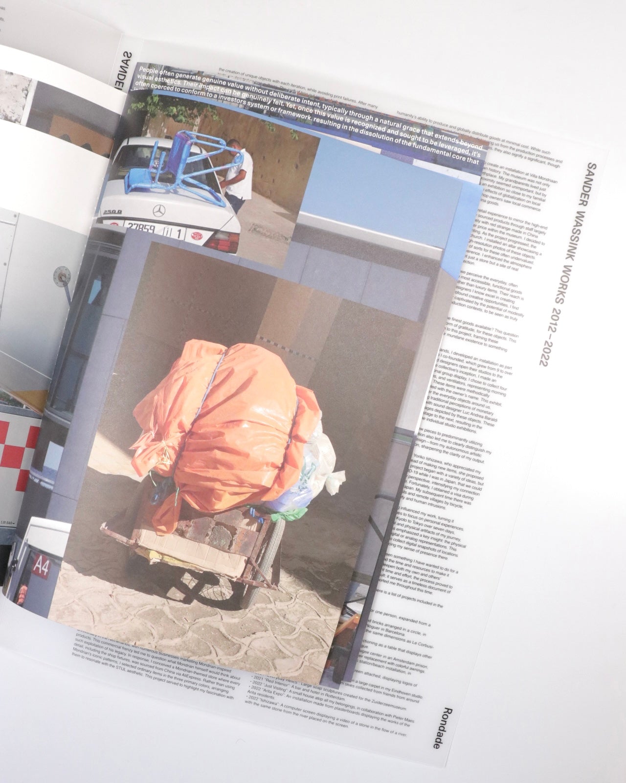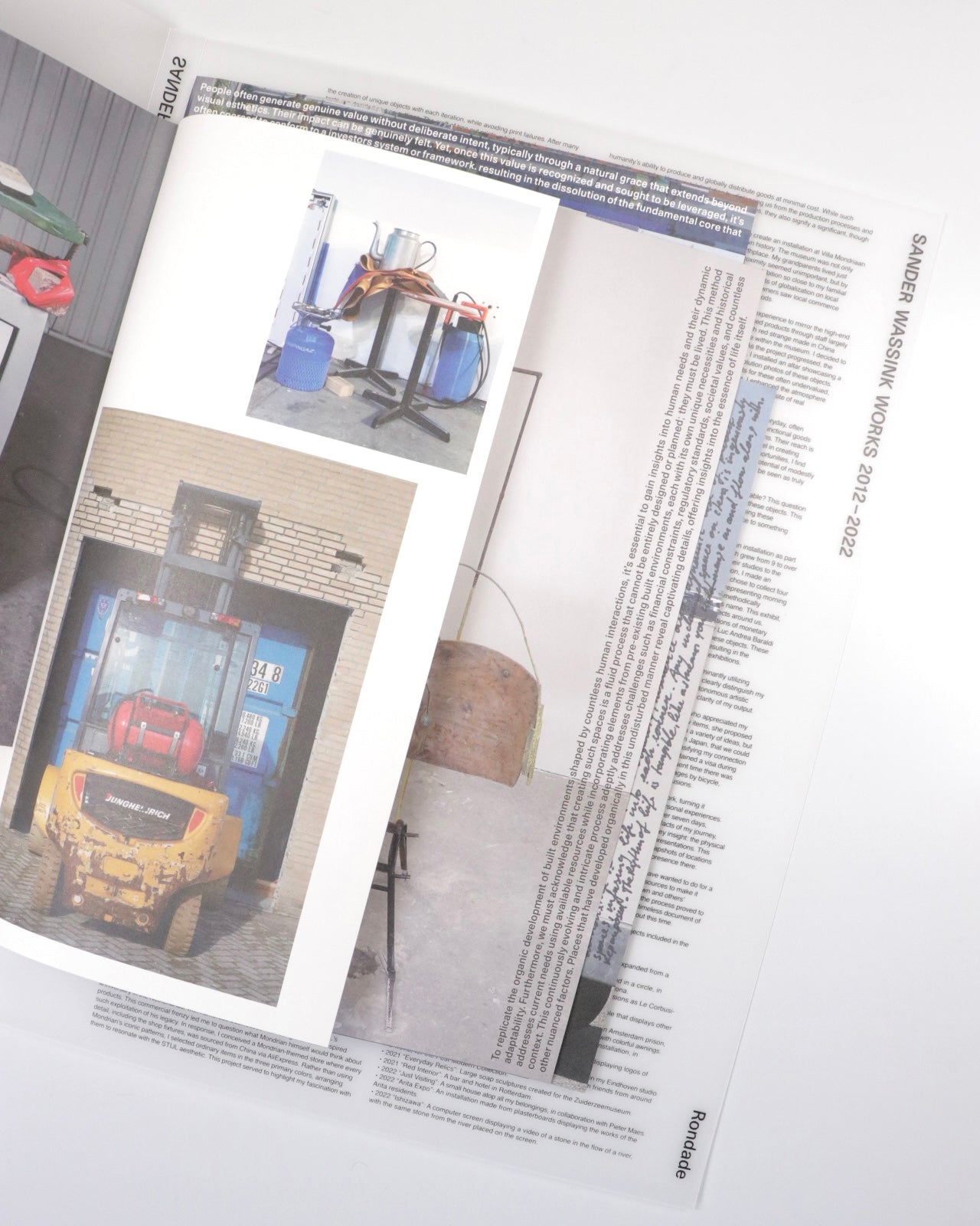 ワッシンクが10年間で撮り溜めた日頃目にする街頭やさまざまな構造物、廃棄されたものの写真から彼の作品との関係性を見出したRondadeの佐久間氏は、それら数万枚から選定した写真と彼の作品を独自のブックデザインによって書籍化し、ページを捲るたびにワッシンクの頭の中と彼のアウトプットの相互関係を見てとることのできる構成となっています。