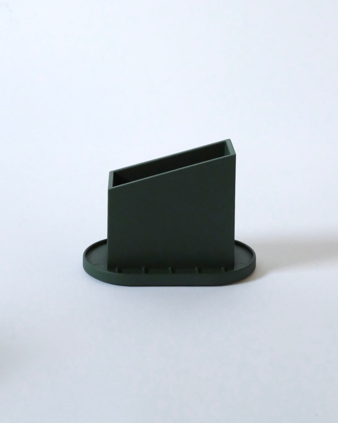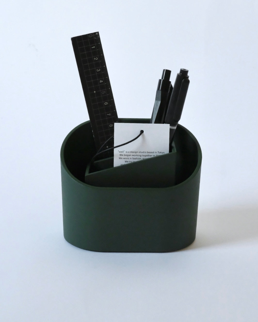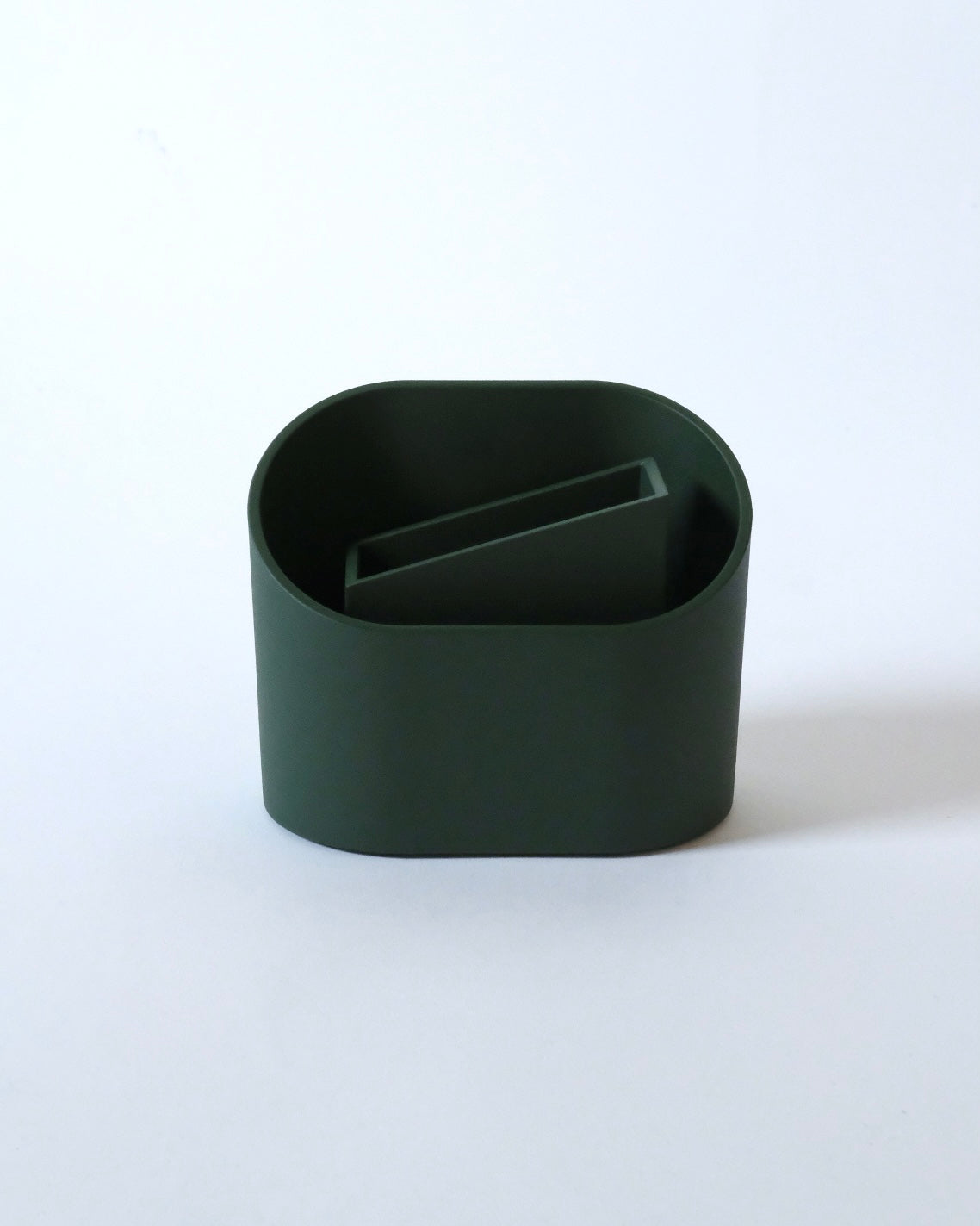 中と外、2つの形で構成された「STAND」はデスクや洗面所で使用できる多目的な収納容器。外身は、おおきな口でサイズの大きな物を収める事ができ、取り出しやすい斜めの切り口を持つシンプルな形状。中身は細長い物などをいれるのに便利で、外身に入れこんで使えば、中身は様々な種類の道具を区分ける仕切りの役目にもなります。高さや大きさの違う物を、状況にあわせて整理しながら収納できます。