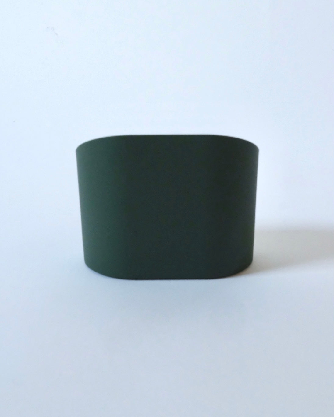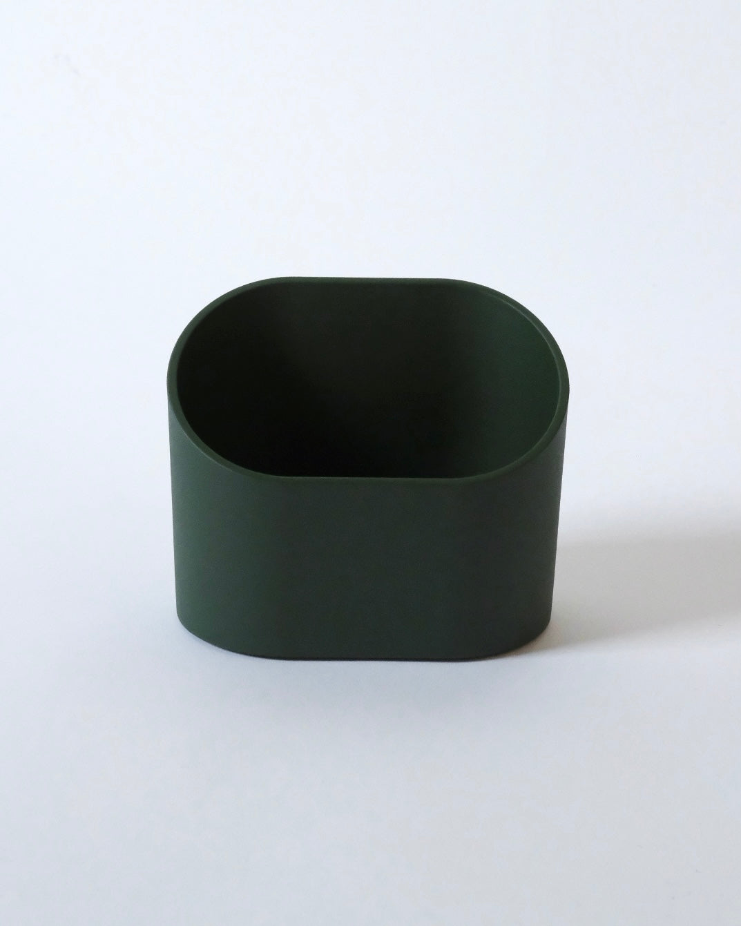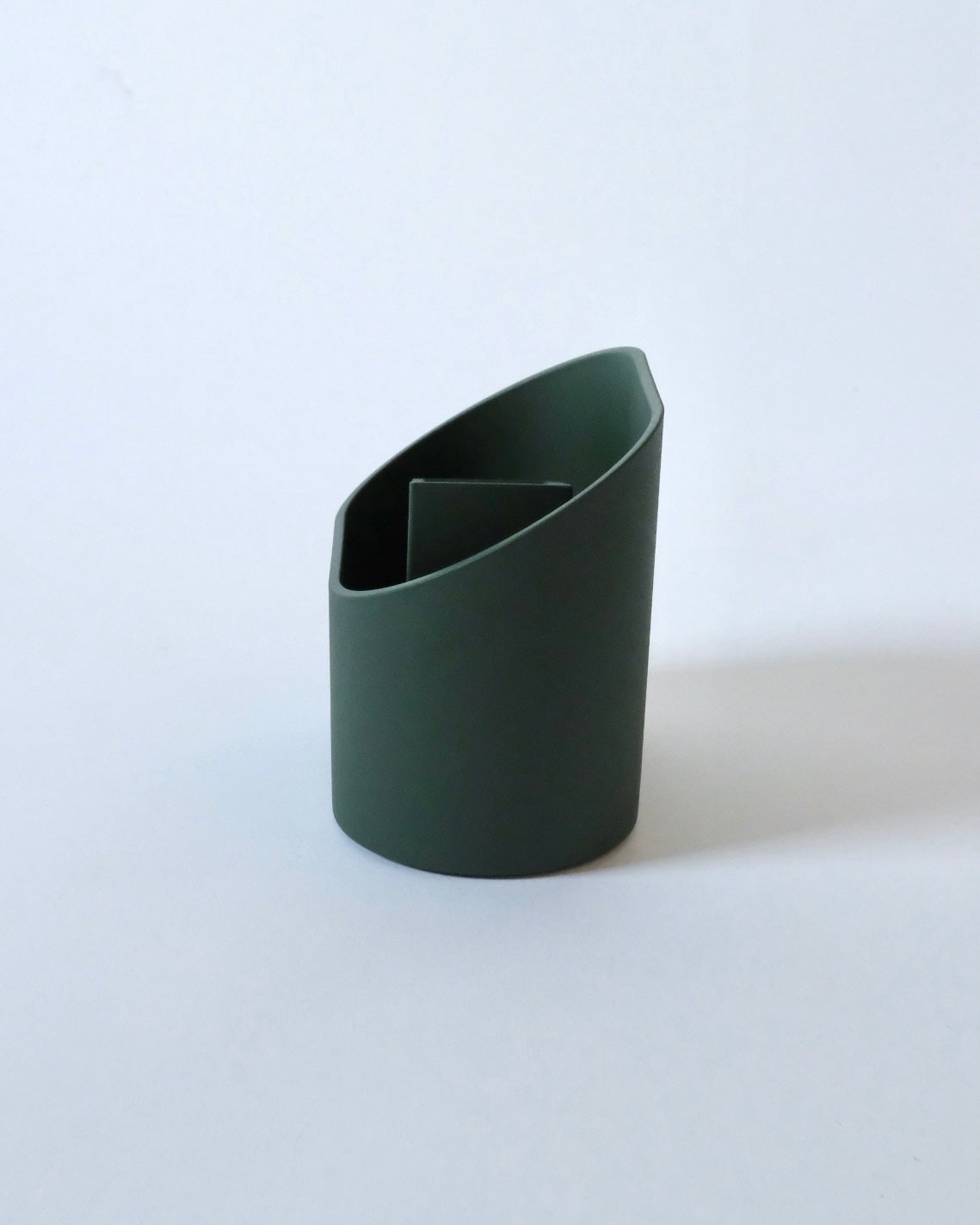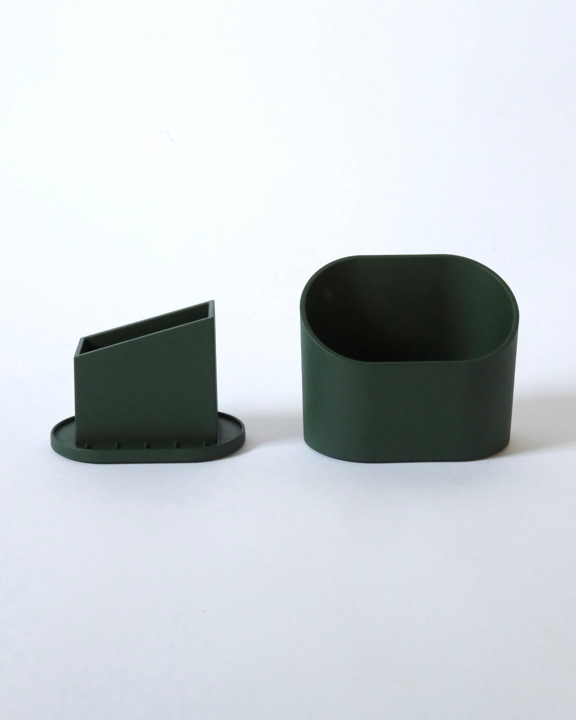 中と外、2つの形で構成された「STAND」はデスクや洗面所で使用できる多目的な収納容器。外身は、おおきな口でサイズの大きな物を収める事ができ、取り出しやすい斜めの切り口を持つシンプルな形状。中身は細長い物などをいれるのに便利で、外身に入れこんで使えば、中身は様々な種類の道具を区分ける仕切りの役目にもなります。高さや大きさの違う物を、状況にあわせて整理しながら収納できます。