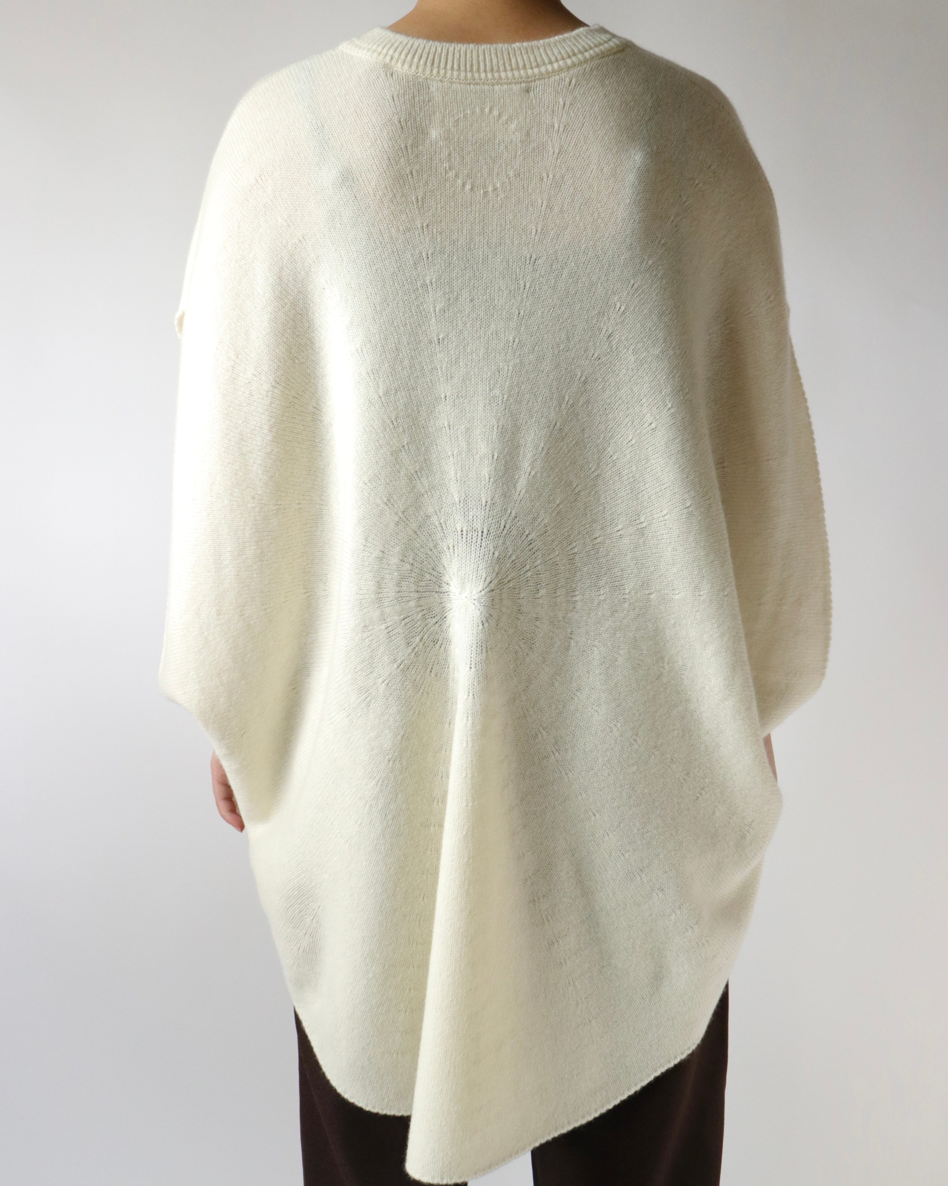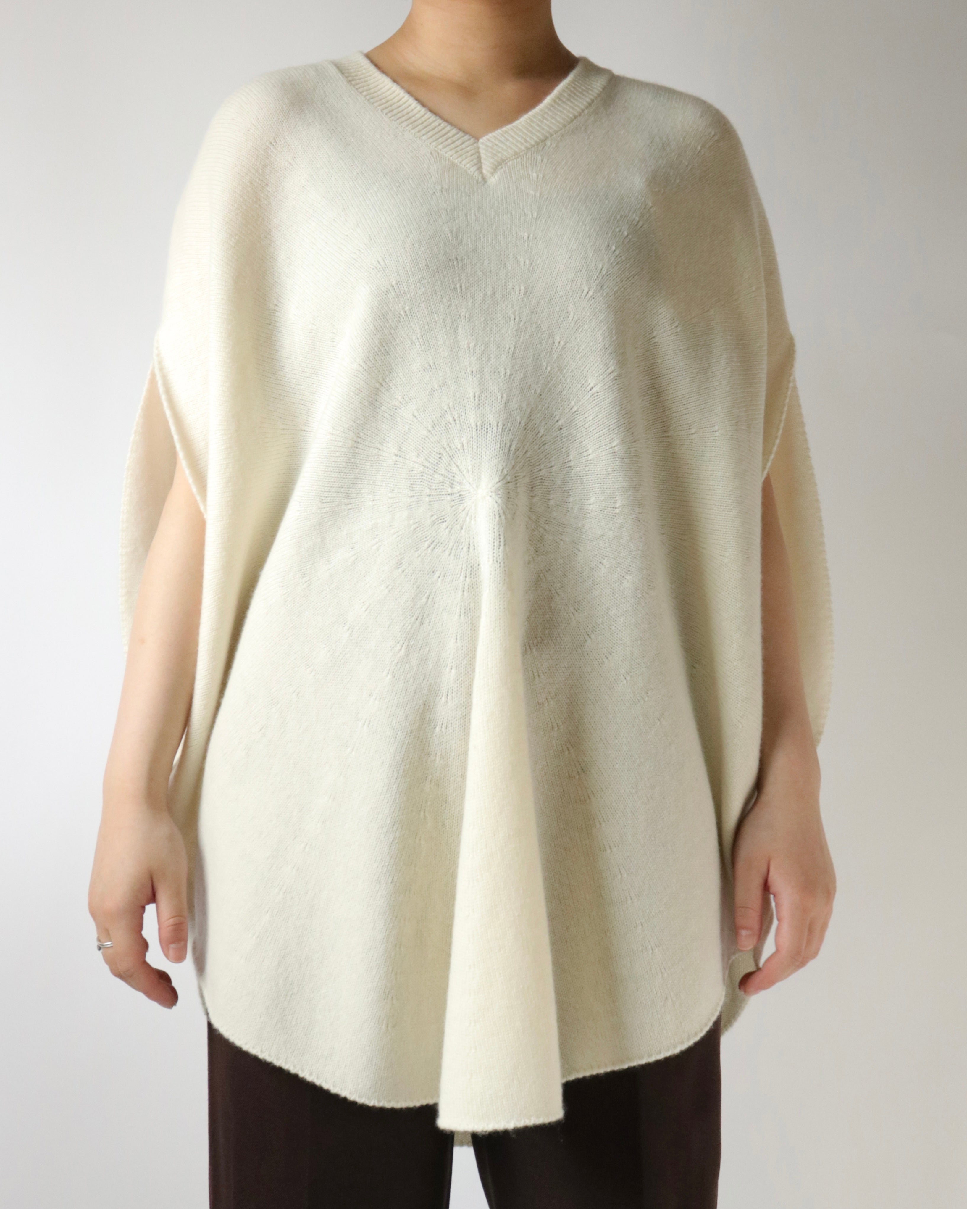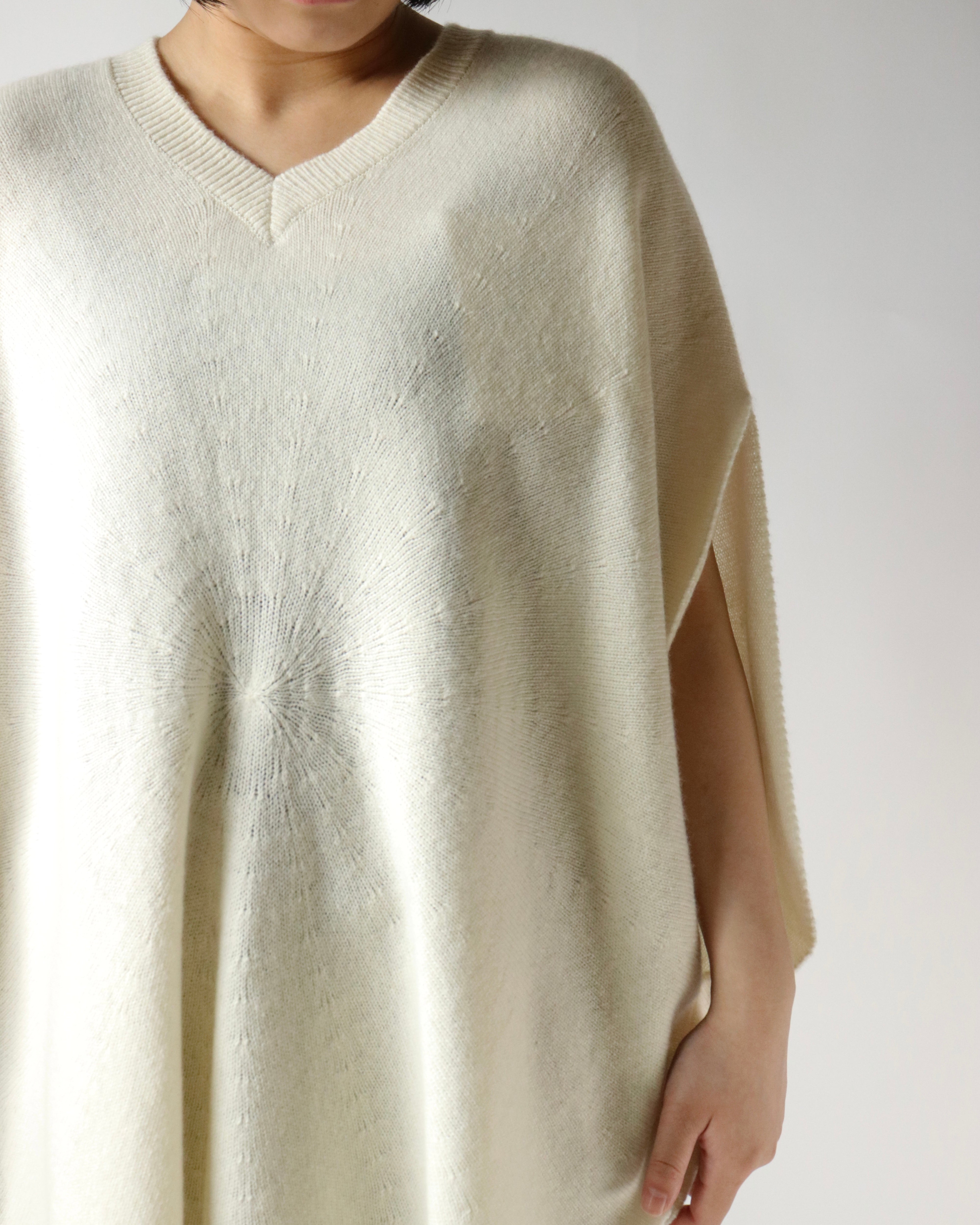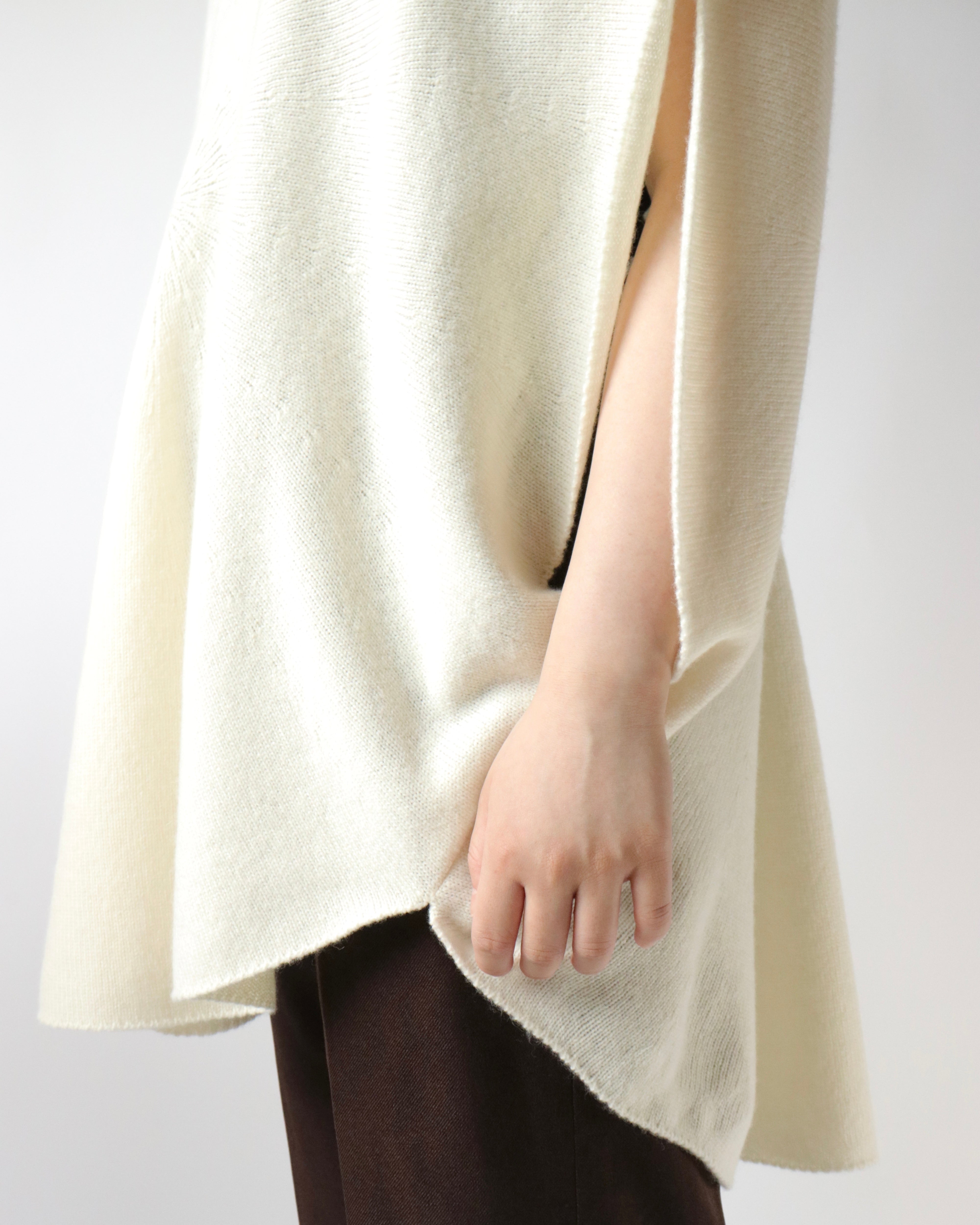 シルエットが美しいホールガーメントのサークルベスト。身頃の中心から編まれることにより、シンボリックなサークル模様が浮かびあがる軽やかなデザイン。たっぷりと取られた身頃のドレープとVネックのリズムが心地良いデイリーウェアです。シャツやカットソーをレイヤードして、自由に楽しんでいただけるアイテムです。