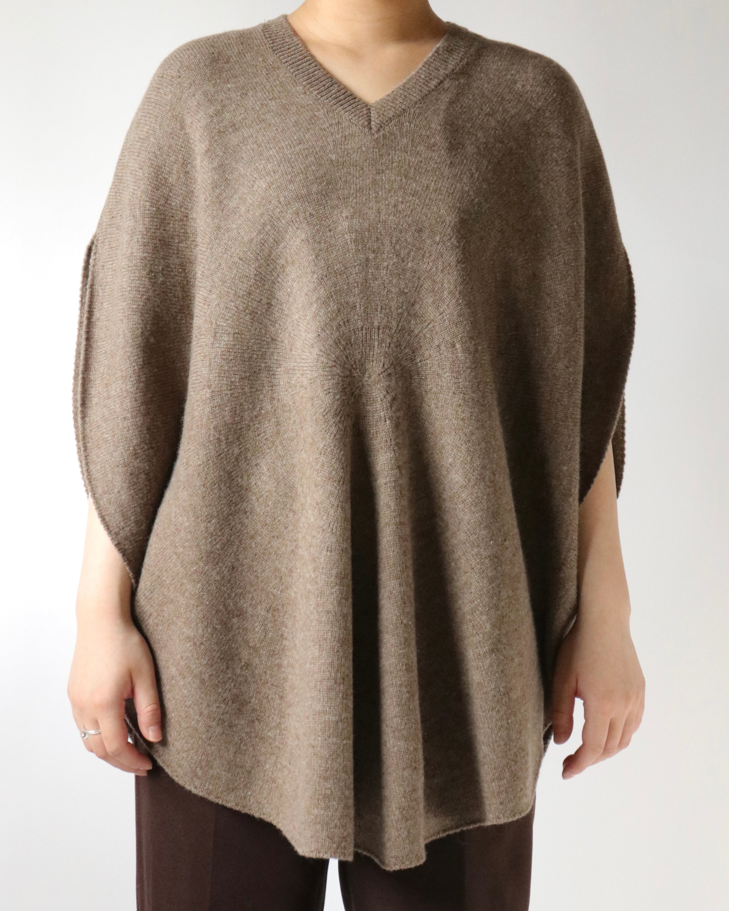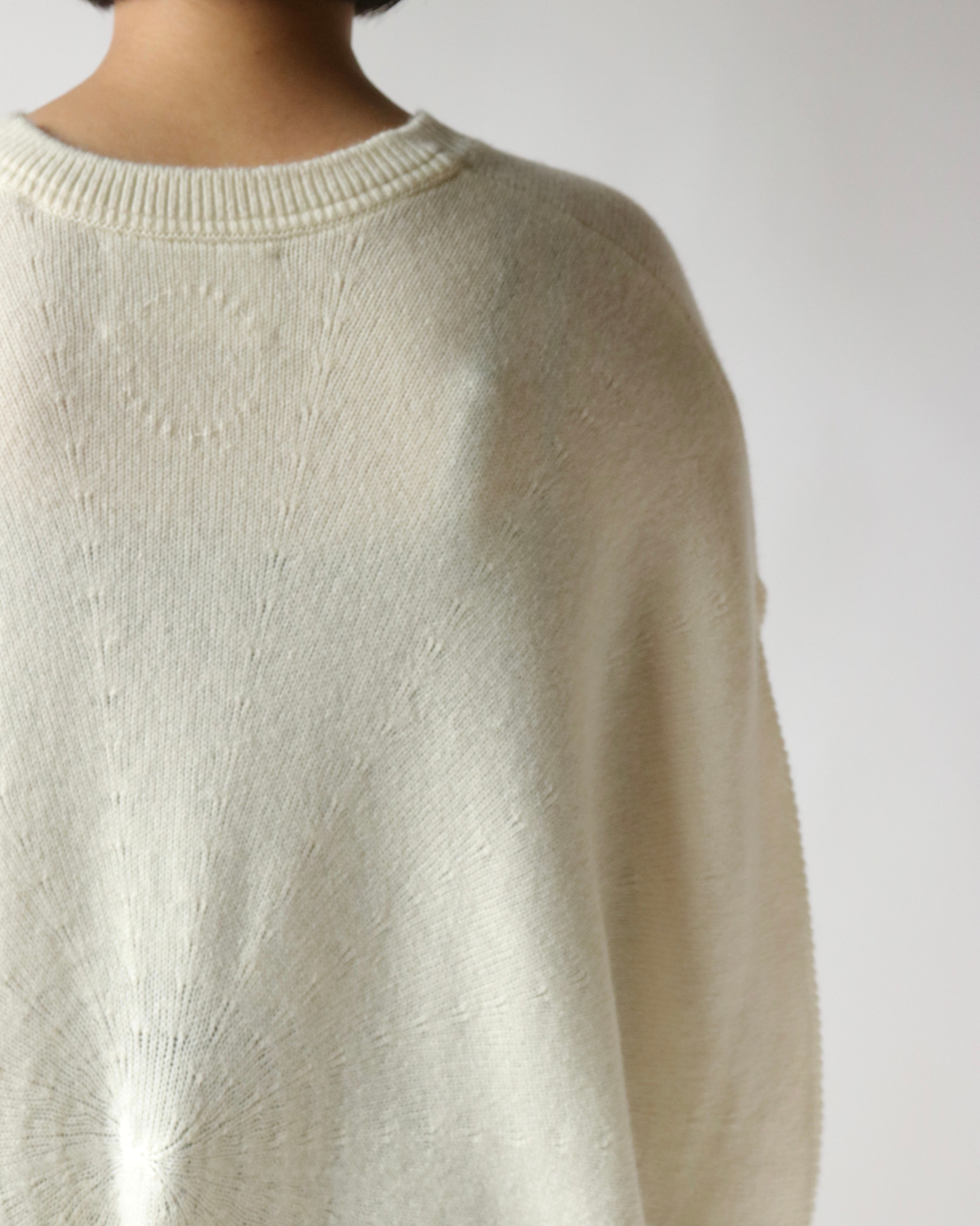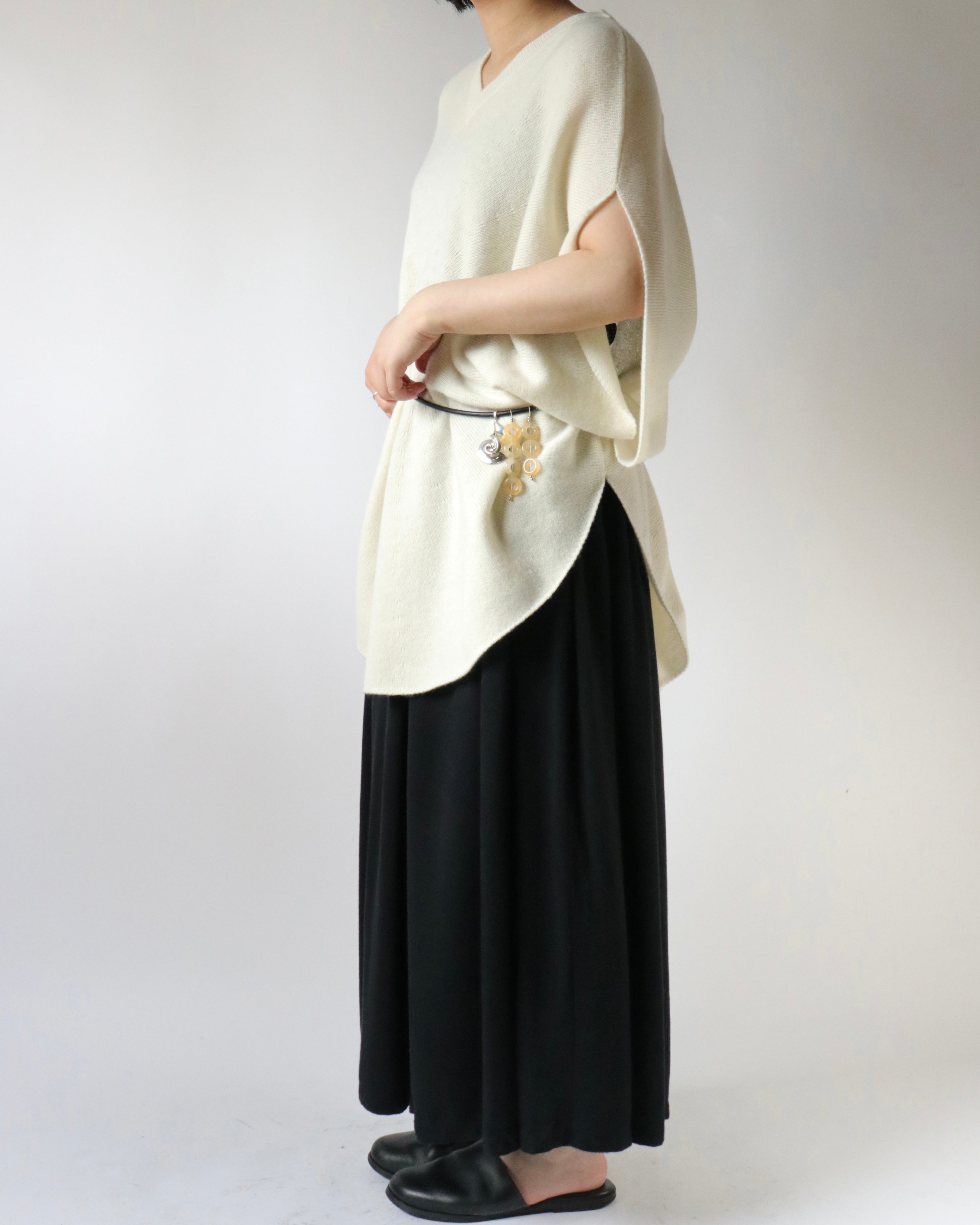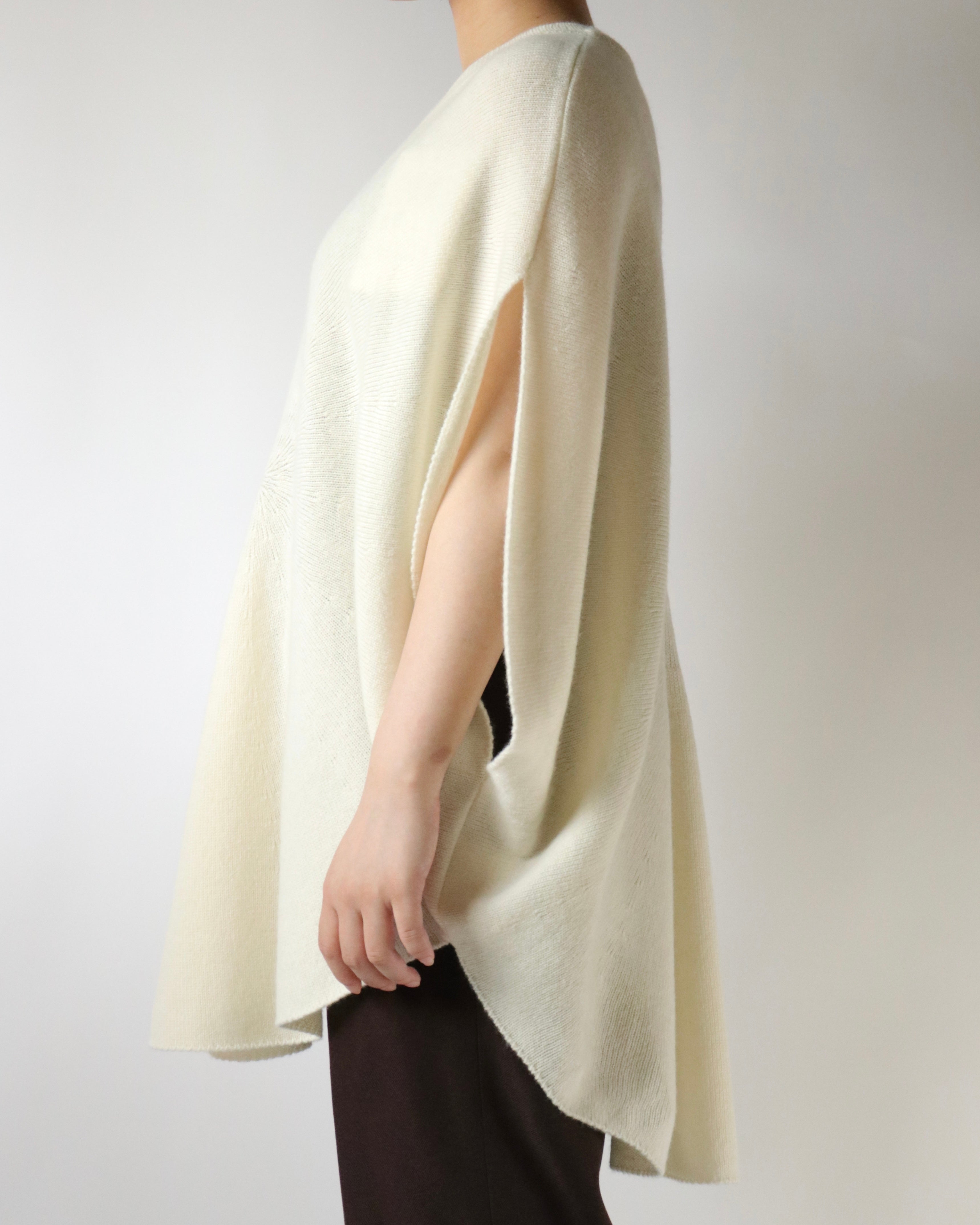 シルエットが美しいホールガーメントのサークルベスト。身頃の中心から編まれることにより、シンボリックなサークル模様が浮かびあがる軽やかなデザイン。たっぷりと取られた身頃のドレープとVネックのリズムが心地良いデイリーウェアです。シャツやカットソーをレイヤードして、自由に楽しんでいただけるアイテムです。