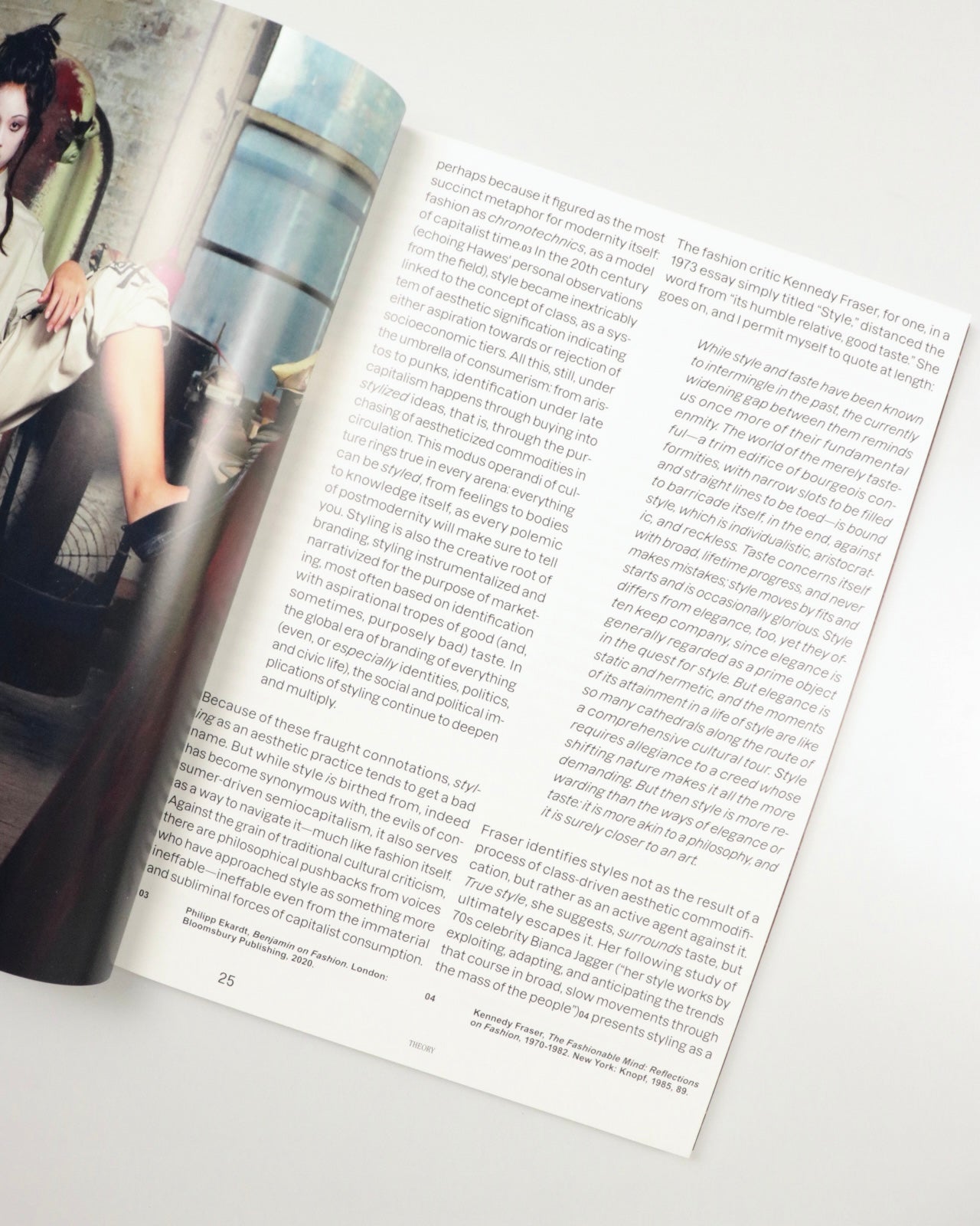 動詞の「style」は、「戦術」という意味も含みます。意味されるもの(シニフィエ)の寄せ集め(ブリコラージュ)を通して説得し、コミュニケーションを交わすためのダイナミックな道具なのです。また、「スタイリング(styling)」という現代的な職業にも直結します。ファッション業界で生まれた行為ですが、芸術、メディア、消費主義、政治にますます浸透している言葉でもあります。本号では、具体的な事例と多くの学問分野を横断する哲学的な思索を通じて、すべての含みうる意味とその潜在的な交わりを批評的に表明しています。