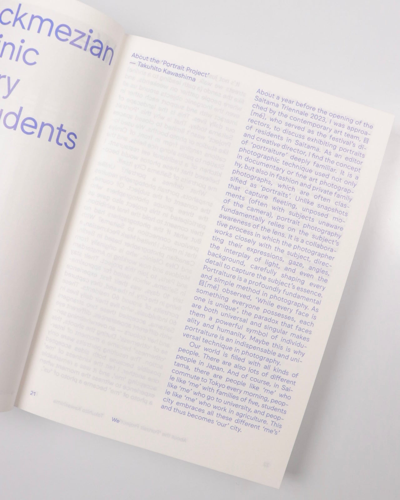 本書は、本展示の企画者である編集者・川島拓人氏の展示に至るまでのプロセスとその想いを、本人の文章や関係者が寄稿したテキスト、撮影背景などから多角的に捉えた一冊です。芸術祭のテーマ”わたしたち/We”をポートレイトという直球的でありながら多くの協力者を巻き込んだ多面的なものとして表現した本書は、ポートレイトの可能性や危うさ、ひいてはわたしたちの他者性に訴えかける、川島氏の柔軟で妥協のないクリエイティビティを感じることができます。